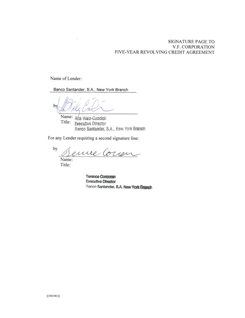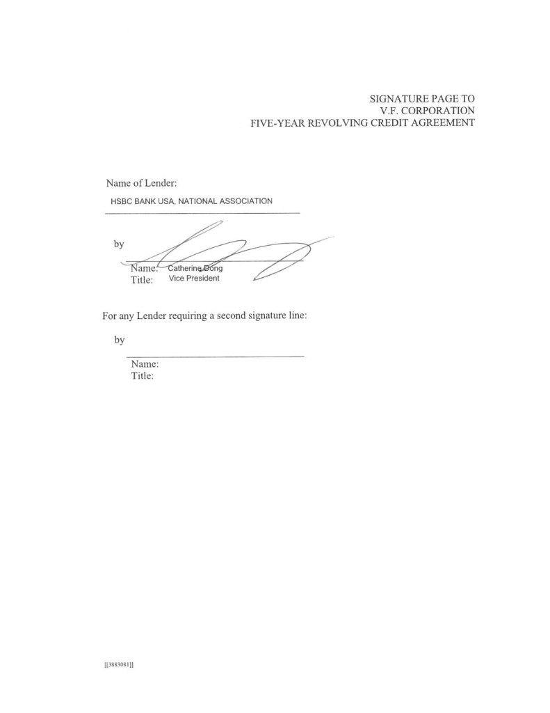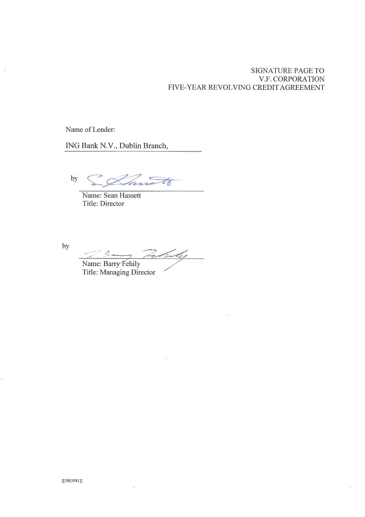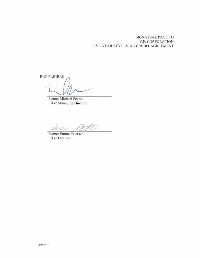 3 IN WITNESS WHEREOF, the parties hereto have caused this Agreement to be duly executed by their duly authorized officers, all as of the day and year first above written. V.F. CORPORATION, by Name: Title: by Name: Title: JPMORGAN CHASE BANK, N.A., as Administrative Agent, by Name: Title: [INSERT NAME OF INCREASING LENDER], by Name: Title: [JPMORGAN CHASE BANK, N.A., as an L/C Issuer and the Swing Line Lender, by _____________________________ Name: Title: [[3885807]]