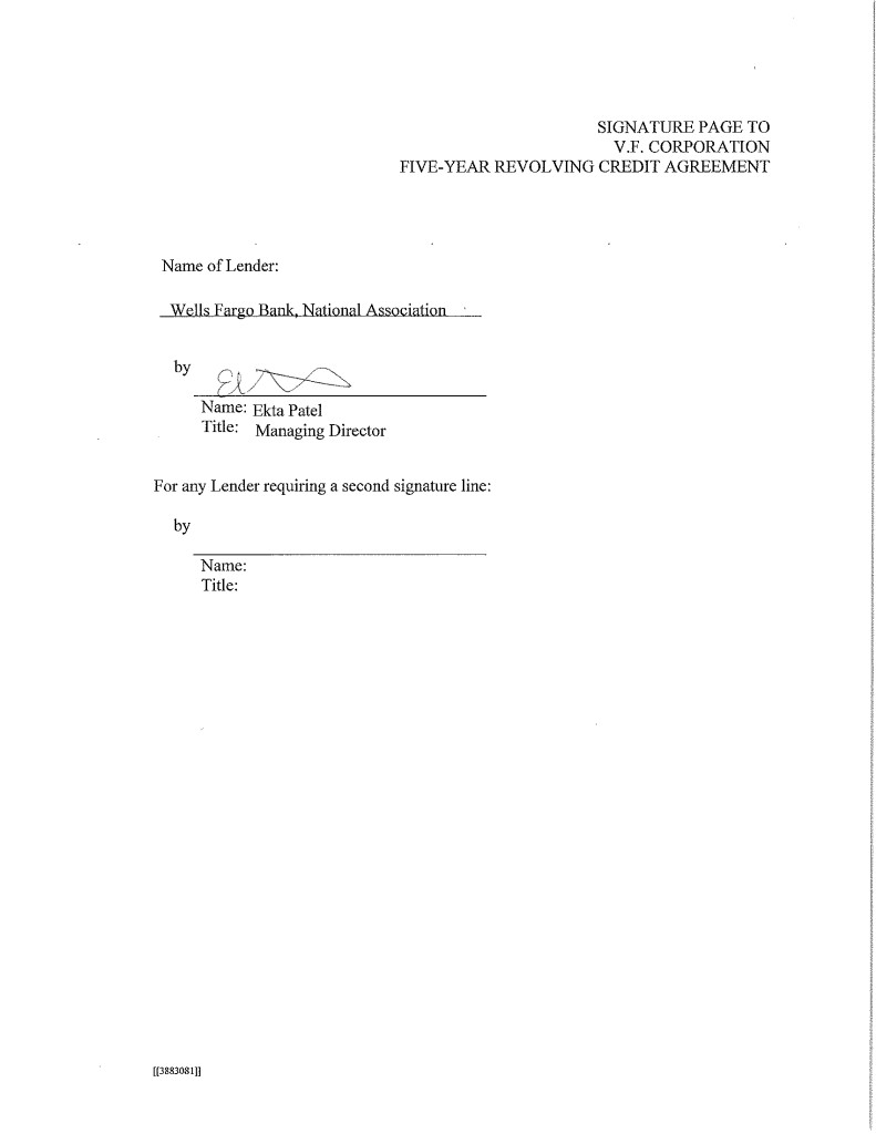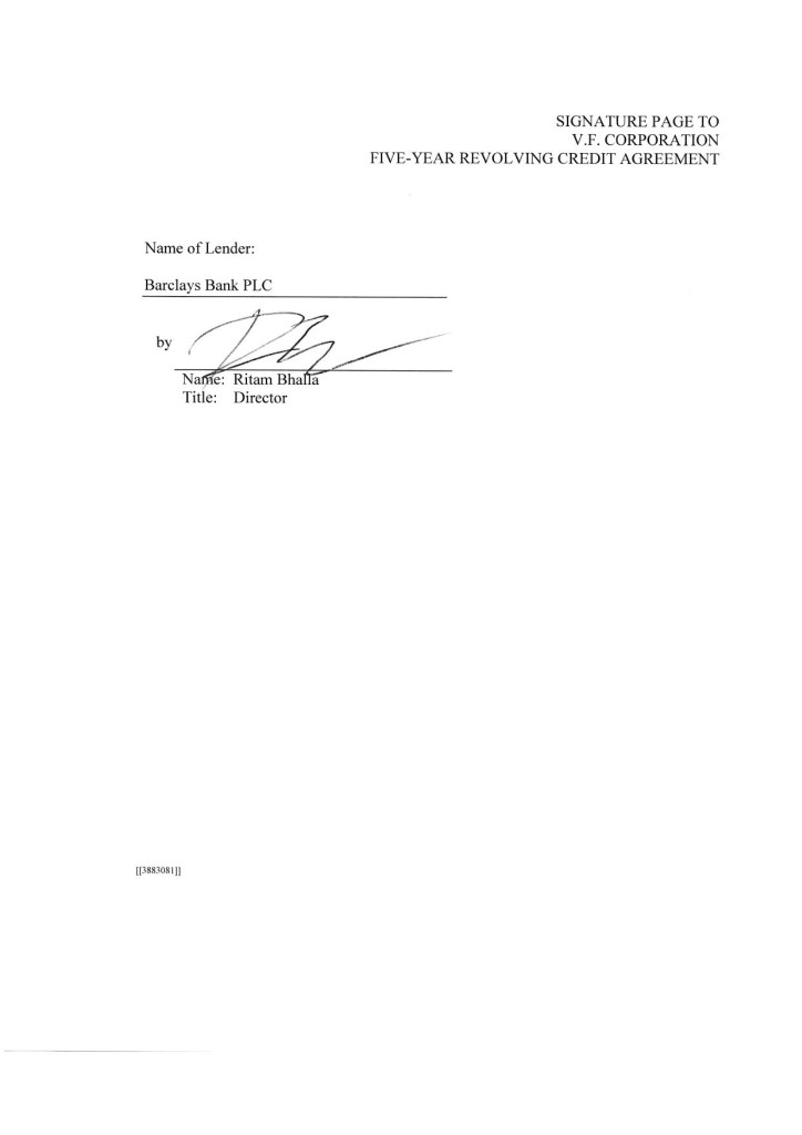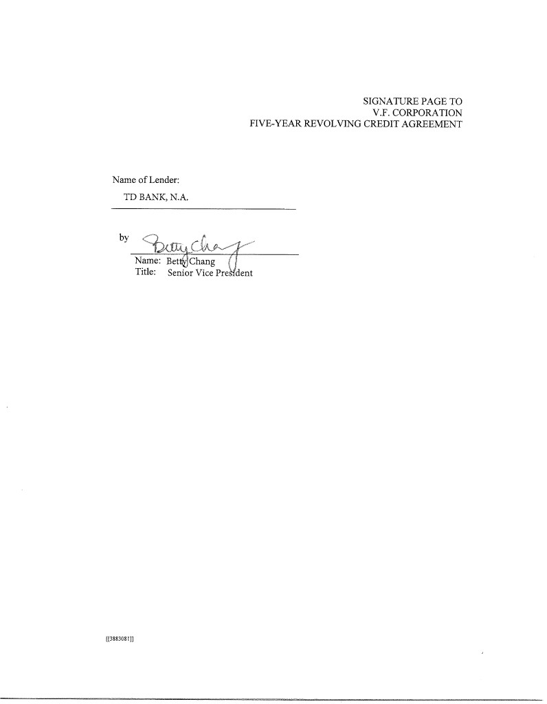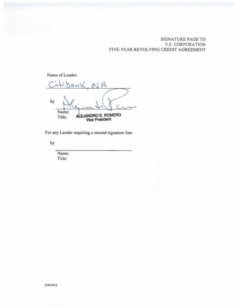 3 IN WITNESS WHEREOF, the parties hereto have caused this Agreement to be duly executed by their duly authorized officers, all as of the day and year first above written. V.F. CORPORATION, by Name: Title: by Name: Title: JPMORGAN CHASE BANK, N.A., as Administrative Agent, by Name: Title: [INSERT NAME OF INCREASING LENDER], by Name: Title: [JPMORGAN CHASE BANK, N.A., as an L/C Issuer and the Swing Line Lender, by _____________________________ Name: Title: [[3885807]]