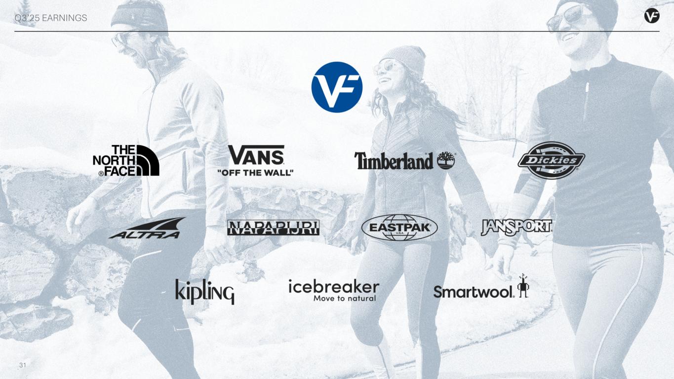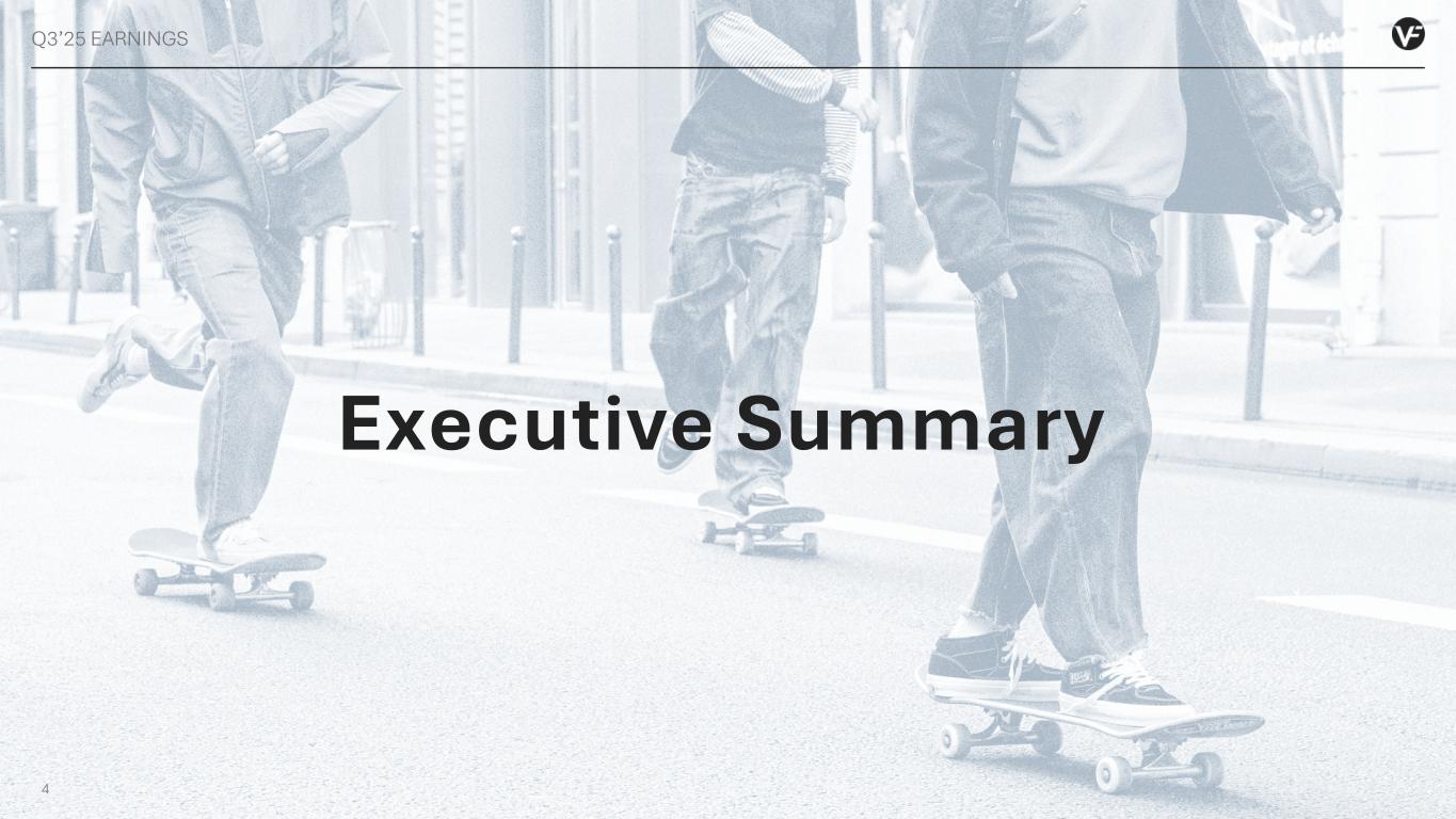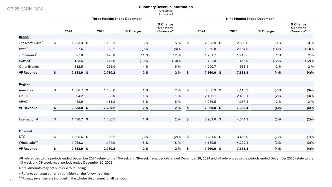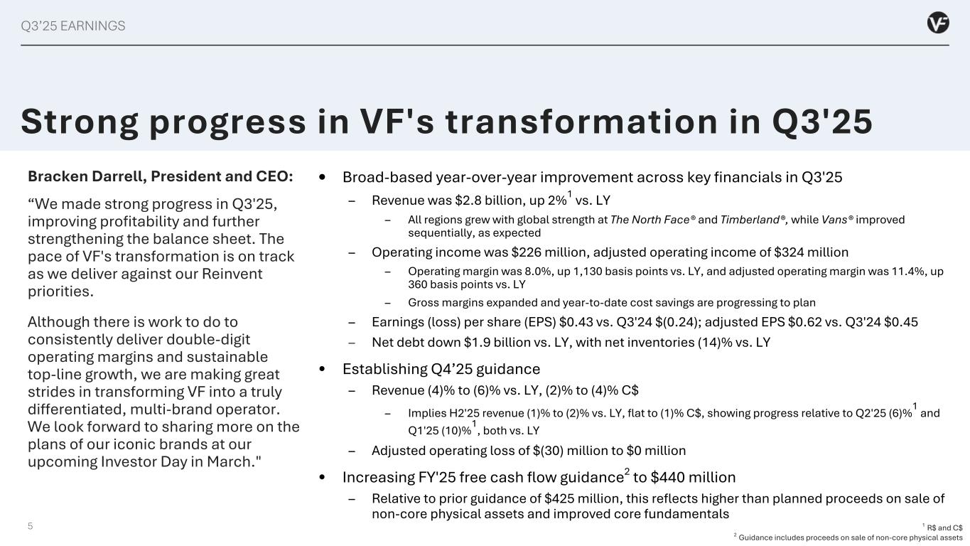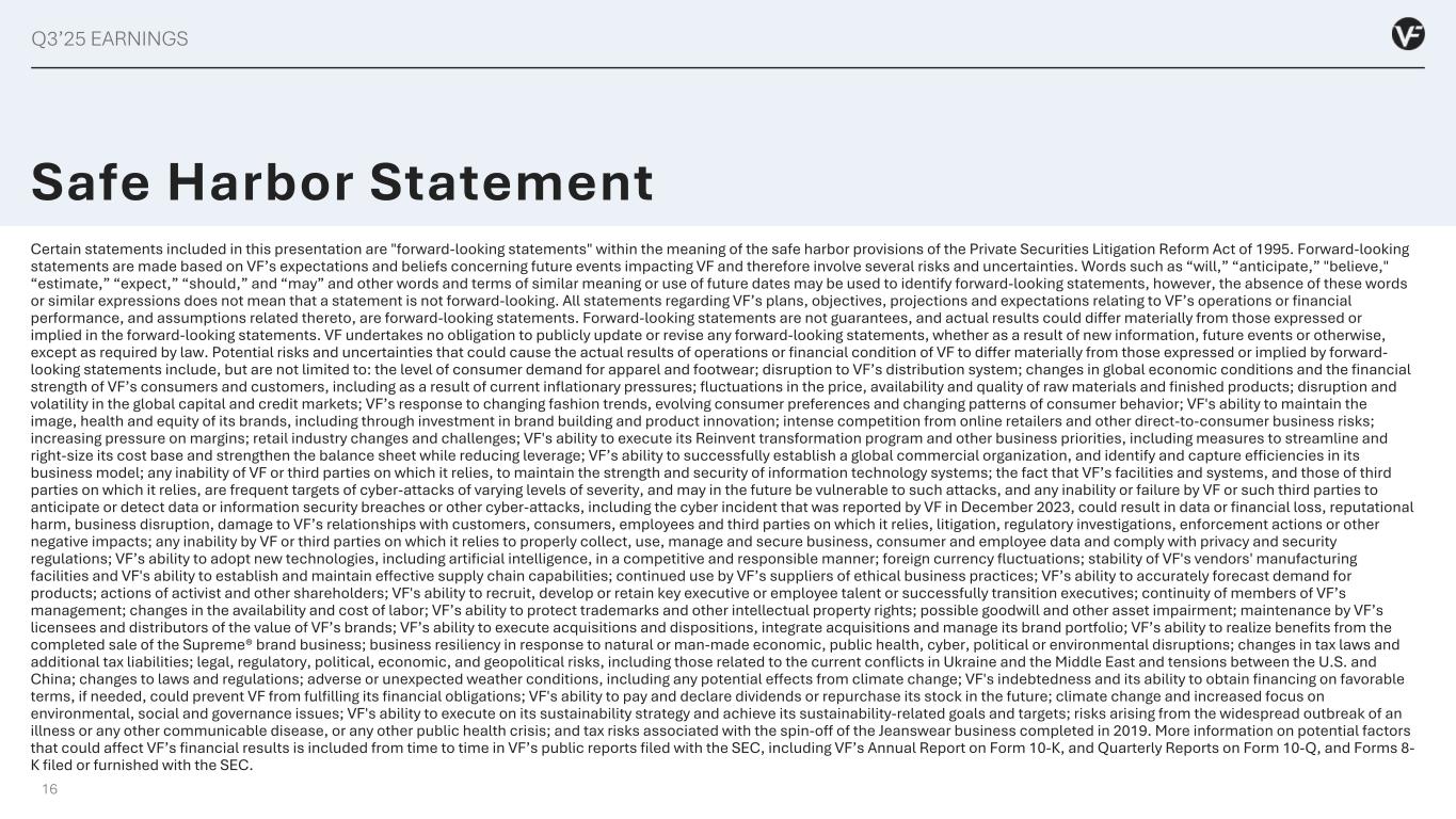 Financial Presentation Disclosure All per share amounts are presented on a diluted basis. This presentation refers to “reported” (R$) and “constant dollar” (C$) or “constant currency” amounts, terms that are described under the heading below “Constant Currency - Excluding the Impact of Foreign Currency.” Unless otherwise noted, “reported” and “constant dollar” or “constant currency” amounts are the same, and amounts will be as "reported" unless otherwise specified. This presentation also refers to “continuing” and “discontinued” operations amounts, which are concepts described under the heading “Discontinued Operations - Supreme.” Unless otherwise noted, results presented are based on continuing operations. This presentation also refers to “adjusted” amounts, a term that is described under the heading "Adjusted Amounts - Excluding Reinvent, a Noncash Impairment Charge and Transaction and Deal Related Activities". Unless otherwise noted, “reported” and “adjusted” amounts are the same. VF operates and reports using a 52/53 week fiscal year ending on the Saturday closest to March 31 of each year. This presentation refers to VF's third quarter of fiscal 2025 as Q3'25, and similarly Q3'24 denotes VF's third quarter of fiscal 2024, etc. VF defines "free cash flow" as cash flow from continuing operations less capital expenditures and software purchases and defines "net debt" as long-term debt, the current portion of long-term debt, short-term borrowings, and operating lease liabilities, less cash and cash equivalents per VF's consolidated balance sheet. Discontinued Operations - Supreme On July 16, 2024, VF entered into a definitive Stock and Asset Purchase Agreement with EssilorLuxottica S.A. to sell the Supreme® brand business (“Supreme”). On October 1, 2024, VF completed the sale of Supreme. Accordingly, the company has reported the related held-for-sale assets and liabilities as assets and liabilities of discontinued operations and included the operating results and cash flows of the business in discontinued operations for all periods presented, through the date of sale. Constant Currency - Excluding the Impact of Foreign Currency This presentation refers to “reported” amounts in accordance with U.S. generally accepted accounting principles (“GAAP”), which include translation and transactional impacts from foreign currency exchange rates. This presentation also refers to both “constant dollar” and “constant currency” amounts, which exclude the impact of translating foreign currencies into U.S. dollars. Reconciliations of GAAP measures to constant currency amounts are presented in the supplemental financial information included with this presentation, which identifies and quantifies all excluded items, and provides management’s view of why this information is useful to investors. Adjusted Amounts - Excluding Reinvent, a Noncash Impairment Charge and Transaction and Deal Related Activities The adjusted amounts in this presentation exclude costs related to Reinvent, VF's transformation program. Costs, including restructuring charges and project-related costs, were approximately $47 million in the third quarter of fiscal 2025 and $106 million in the first nine months of fiscal 2025. The adjusted amounts in this presentation exclude a noncash impairment charge related to the Dickies indefinite-lived trademark intangible asset of $51 million in the third quarter and first nine months of fiscal 2025. The adjusted amounts in this presentation exclude transaction and deal related activities associated with the review of strategic alternatives for the Global Packs business, consisting of the Kipling®, Eastpak® and JanSport® brands. Total transaction and deal related activities include costs of approximately $0.5 million in the first nine months of fiscal 2025. Combined, the above items negatively impacted earnings per share by $0.19 during the third quarter of fiscal 2025 and $0.31 during the first nine months of fiscal 2025. All adjusted amounts referenced herein exclude the effects of these amounts. Reconciliations of measures calculated in accordance with GAAP to adjusted amounts are presented in the supplemental financial information included with this presentation, which identifies and quantifies all excluded items, and provides management’s view of why this information is useful to investors. The company does not provide a reconciliation of forward-looking measures where the company believes such a reconciliation would imply a degree of precision and certainty that could be confusing to investors and is unable to reasonably predict certain items contained in the GAAP measures without unreasonable efforts. This is due to the inherent difficulty of forecasting the timing or amount of various items that have not yet occurred and are out of the company's control or cannot be reasonably predicted. For the same reasons, the company is unable to address the probable significance of the unavailable information. Q3’25 EARNINGS 2