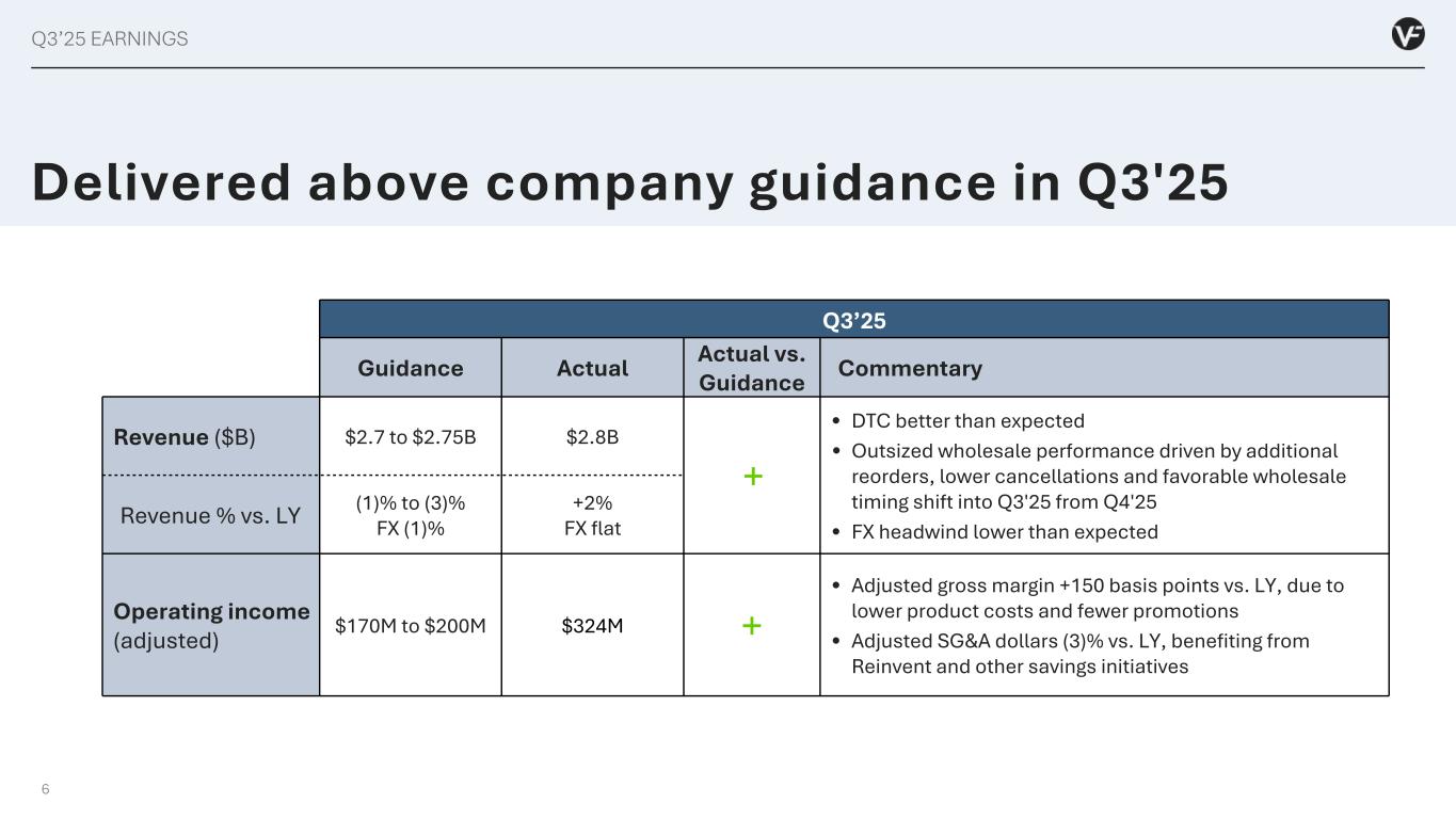 Strong progress in VF's transformation in Q3'25 Bracken Darrell, President and CEO: “We made strong progress in Q3'25, improving profitability and further strengthening the balance sheet. The pace of VF's transformation is on track as we deliver against our Reinvent priorities. Although there is work to do to consistently deliver double-digit operating margins and sustainable top-line growth, we are making great strides in transforming VF into a truly differentiated, multi-brand operator. We look forward to sharing more on the plans of our iconic brands at our upcoming Investor Day in March." 1 R$ and C$ 2 Guidance includes proceeds on sale of non-core physical assets Q3’25 EARNINGS 5 • Broad-based year-over-year improvement across key financials in Q3'25 – Revenue was $2.8 billion, up 2%1 vs. LY – All regions grew with global strength at The North Face® and Timberland®, while Vans® improved sequentially, as expected – Operating income was $226 million, adjusted operating income of $324 million – Operating margin was 8.0%, up 1,130 basis points vs. LY, and adjusted operating margin was 11.4%, up 360 basis points vs. LY – Gross margins expanded and year-to-date cost savings are progressing to plan – Earnings (loss) per share (EPS) $0.43 vs. Q3'24 $(0.24); adjusted EPS $0.62 vs. Q3'24 $0.45 – Net debt down $1.9 billion vs. LY, with net inventories (14)% vs. LY • Establishing Q4’25 guidance – Revenue (4)% to (6)% vs. LY, (2)% to (4)% C$ – Implies H2'25 revenue (1)% to (2)% vs. LY, flat to (1)% C$, showing progress relative to Q2'25 (6)%1 and Q1'25 (10)%1, both vs. LY – Adjusted operating loss of $(30) million to $0 million • Increasing FY'25 free cash flow guidance2 to $440 million – Relative to prior guidance of $425 million, this reflects higher than planned proceeds on sale of non-core physical assets and improved core fundamentals