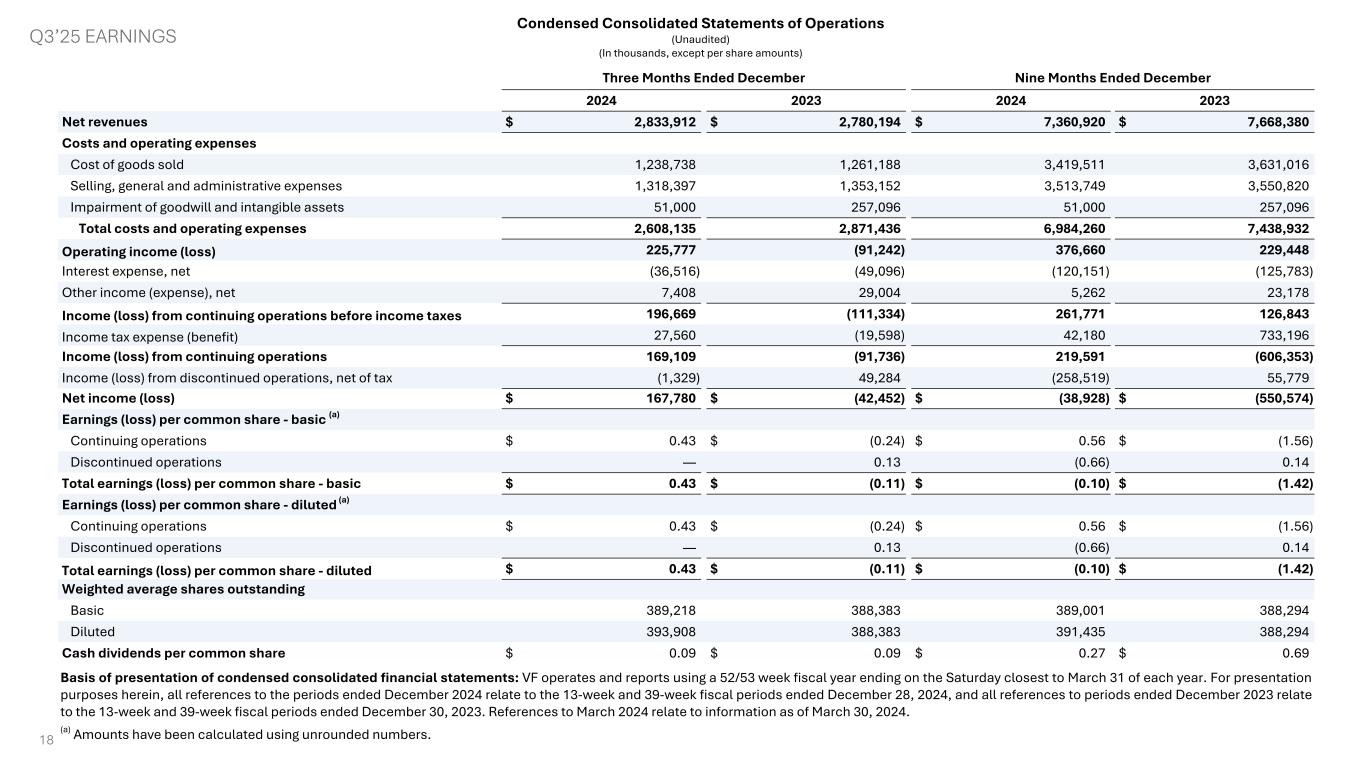Three Months Ended December Nine Months Ended December 2024 2023 2024 2023 Net revenues $ 2,833,912 $ 2,780,194 $ 7,360,920 $ 7,668,380 Costs and operating expenses Cost of goods sold 1,238,738 1,261,188 3,419,511 3,631,016 Selling, general and administrative expenses 1,318,397 1,353,152 3,513,749 3,550,820 Impairment of goodwill and intangible assets 51,000 257,096 51,000 257,096 Total costs and operating expenses 2,608,135 2,871,436 6,984,260 7,438,932 Operating income (loss) 225,777 (91,242) 376,660 229,448 Interest expense, net (36,516) (49,096) (120,151) (125,783) Other income (expense), net 7,408 29,004 5,262 23,178 Income (loss) from continuing operations before income taxes 196,669 (111,334) 261,771 126,843 Income tax expense (benefit) 27,560 (19,598) 42,180 733,196 Income (loss) from continuing operations 169,109 (91,736) 219,591 (606,353) Income (loss) from discontinued operations, net of tax (1,329) 49,284 (258,519) 55,779 Net income (loss) $ 167,780 $ (42,452) $ (38,928) $ (550,574) Earnings (loss) per common share - basic (a) Continuing operations $ 0.43 $ (0.24) $ 0.56 $ (1.56) Discontinued operations — 0.13 (0.66) 0.14 Total earnings (loss) per common share - basic $ 0.43 $ (0.11) $ (0.10) $ (1.42) Earnings (loss) per common share - diluted (a) Continuing operations $ 0.43 $ (0.24) $ 0.56 $ (1.56) Discontinued operations — 0.13 (0.66) 0.14 Total earnings (loss) per common share - diluted $ 0.43 $ (0.11) $ (0.10) $ (1.42) Weighted average shares outstanding Basic 389,218 388,383 389,001 388,294 Diluted 393,908 388,383 391,435 388,294 Cash dividends per common share $ 0.09 $ 0.09 $ 0.27 $ 0.69 Condensed Consolidated Statements of Operations (Unaudited) (In thousands, except per share amounts) Basis of presentation of condensed consolidated financial statements: VF operates and reports using a 52/53 week fiscal year ending on the Saturday closest to March 31 of each year. For presentation purposes herein, all references to the periods ended December 2024 relate to the 13-week and 39-week fiscal periods ended December 28, 2024, and all references to periods ended December 2023 relate to the 13-week and 39-week fiscal periods ended December 30, 2023. References to March 2024 relate to information as of March 30, 2024. (a) Amounts have been calculated using unrounded numbers. Q3’25 EARNINGS 18