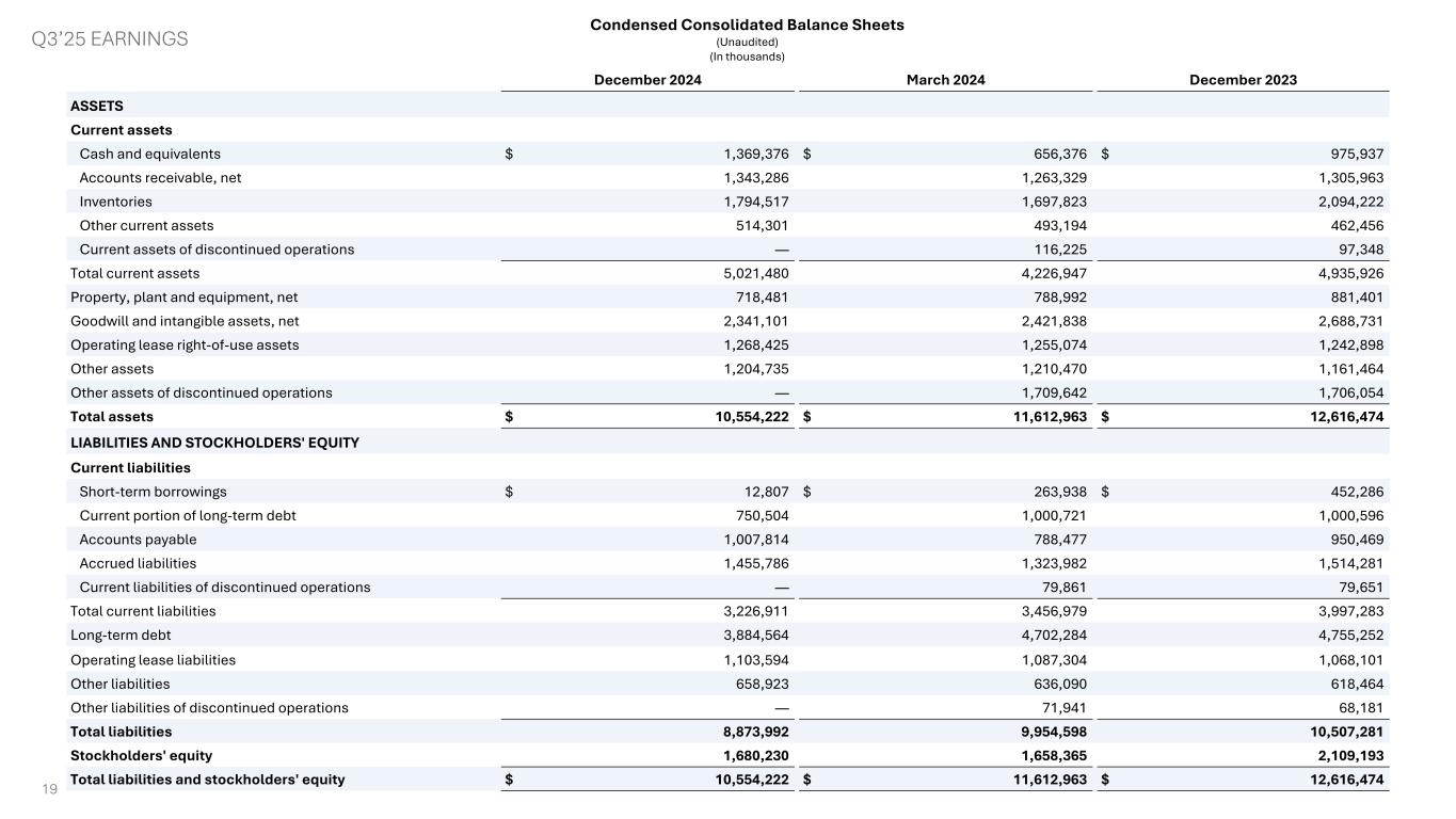 Condensed Consolidated Balance Sheets (Unaudited) (In thousands) December 2024 March 2024 December 2023 ASSETS Current assets Cash and equivalents $ 1,369,376 $ 656,376 $ 975,937 Accounts receivable, net 1,343,286 1,263,329 1,305,963 Inventories 1,794,517 1,697,823 2,094,222 Other current assets 514,301 493,194 462,456 Current assets of discontinued operations — 116,225 97,348 Total current assets 5,021,480 4,226,947 4,935,926 Property, plant and equipment, net 718,481 788,992 881,401 Goodwill and intangible assets, net 2,341,101 2,421,838 2,688,731 Operating lease right-of-use assets 1,268,425 1,255,074 1,242,898 Other assets 1,204,735 1,210,470 1,161,464 Other assets of discontinued operations — 1,709,642 1,706,054 Total assets $ 10,554,222 $ 11,612,963 $ 12,616,474 LIABILITIES AND STOCKHOLDERS' EQUITY Current liabilities Short-term borrowings $ 12,807 $ 263,938 $ 452,286 Current portion of long-term debt 750,504 1,000,721 1,000,596 Accounts payable 1,007,814 788,477 950,469 Accrued liabilities 1,455,786 1,323,982 1,514,281 Current liabilities of discontinued operations — 79,861 79,651 Total current liabilities 3,226,911 3,456,979 3,997,283 Long-term debt 3,884,564 4,702,284 4,755,252 Operating lease liabilities 1,103,594 1,087,304 1,068,101 Other liabilities 658,923 636,090 618,464 Other liabilities of discontinued operations — 71,941 68,181 Total liabilities 8,873,992 9,954,598 10,507,281 Stockholders' equity 1,680,230 1,658,365 2,109,193 Total liabilities and stockholders' equity $ 10,554,222 $ 11,612,963 $ 12,616,474 Q3’25 EARNINGS 19
