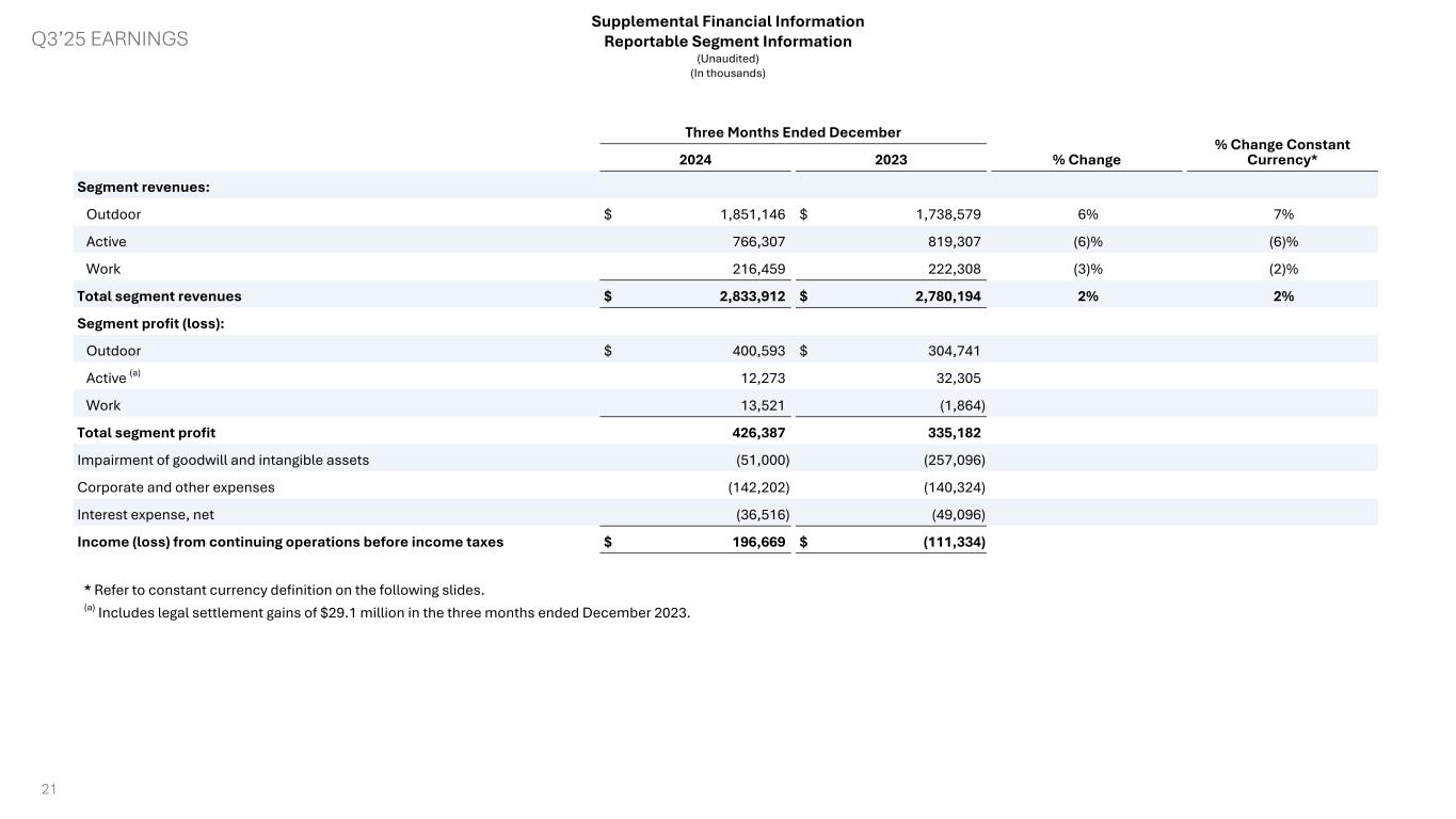 Nine Months Ended December % Change Constant Currency*2024 2023 % Change Segment revenues: Outdoor $ 4,300,017 $ 4,281,955 0% 0% Active 2,449,972 2,735,214 (10)% (10)% Work 610,931 651,211 (6)% (6)% Total segment revenues $ 7,360,920 $ 7,668,380 (4)% (4)% Segment profit: Outdoor $ 604,592 $ 557,830 Active (a) 185,032 254,629 Work 39,257 13,482 Total segment profit 828,881 825,941 Impairment of goodwill and intangible assets (51,000) (257,096) Corporate and other expenses (395,959) (316,219) Interest expense, net (120,151) (125,783) Income from continuing operations before income taxes $ 261,771 $ 126,843 Supplemental Financial Information Reportable Segment Information (Unaudited) (In thousands) * Refer to constant currency definition on the following slides. (a) Includes legal settlement gains of $29.1 million in the nine months ended December 2023. Q3’25 EARNINGS 22