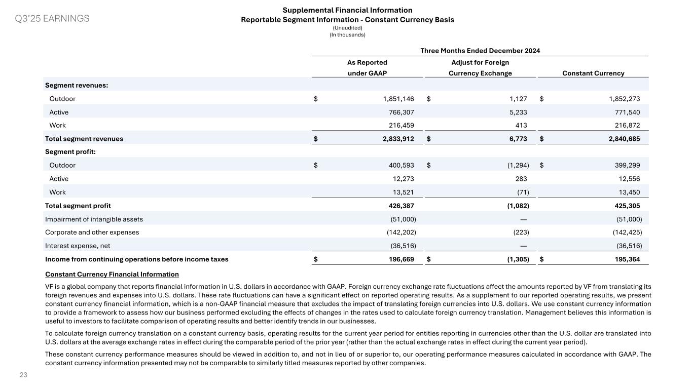 Supplemental Financial Information Reportable Segment Information - Constant Currency Basis (Unaudited) (In thousands) Nine Months Ended December 2024 As Reported Adjust for Foreign under GAAP Currency Exchange Constant Currency Segment revenues: Outdoor $ 4,300,017 $ (3,109) $ 4,296,908 Active 2,449,972 8,199 2,458,171 Work 610,931 1,252 612,183 Total segment revenues $ 7,360,920 $ 6,342 $ 7,367,262 Segment profit: Outdoor $ 604,592 $ (4,838) $ 599,754 Active 185,032 (179) 184,853 Work 39,257 (152) 39,105 Total segment profit 828,881 (5,169) 823,712 Impairment of intangible assets (51,000) — (51,000) Corporate and other expenses (395,959) (1,037) (396,996) Interest expense, net (120,151) — (120,151) Income from continuing operations before income taxes $ 261,771 $ (6,206) $ 255,565 Constant Currency Financial Information VF is a global company that reports financial information in U.S. dollars in accordance with GAAP. Foreign currency exchange rate fluctuations affect the amounts reported by VF from translating its foreign revenues and expenses into U.S. dollars. These rate fluctuations can have a significant effect on reported operating results. As a supplement to our reported operating results, we present constant currency financial information, which is a non-GAAP financial measure that excludes the impact of translating foreign currencies into U.S. dollars. We use constant currency information to provide a framework to assess how our business performed excluding the effects of changes in the rates used to calculate foreign currency translation. Management believes this information is useful to investors to facilitate comparison of operating results and better identify trends in our businesses. To calculate foreign currency translation on a constant currency basis, operating results for the current year period for entities reporting in currencies other than the U.S. dollar are translated into U.S. dollars at the average exchange rates in effect during the comparable period of the prior year (rather than the actual exchange rates in effect during the current year period). These constant currency performance measures should be viewed in addition to, and not in lieu of or superior to, our operating performance measures calculated in accordance with GAAP. The constant currency information presented may not be comparable to similarly titled measures reported by other companies. Q3’25 EARNINGS 24
