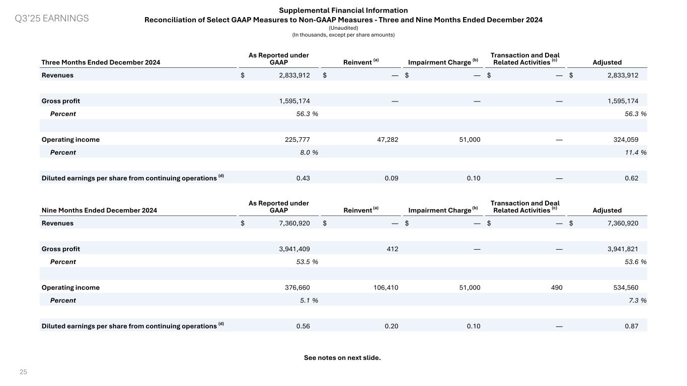 Three Months Ended December 2023 As Reported under GAAP Reinvent (a) Impairment Charges (b) Tax & Legal Items (c) Transaction and Deal Related Activities (d) Adjusted Revenues $ 2,780,194 $ — $ — $ — $ — $ 2,780,194 Gross profit 1,519,006 4,244 — — — 1,523,250 Percent 54.6 % 54.8 % Operating income (loss) (91,242) 50,869 257,096 — 1,003 217,726 Percent (3.3) % 7.8 % Diluted earnings (loss) per share from continuing operations (e) (0.24) 0.10 0.64 (0.06) — 0.45 Nine Months Ended December 2023 As Reported under GAAP Reinvent (a) Impairment Charges (b) Tax & Legal Items (c) Transaction and Deal Related Activities (d) Adjusted Revenues $ 7,668,380 $ — $ — $ — $ — $ 7,668,380 Gross profit 4,037,364 4,244 — — — 4,041,608 Percent 52.6 % 52.7 % Operating income 229,448 50,869 257,096 — 2,449 539,862 Percent 3.0 % 7.0 % Diluted earnings (loss) per share from continuing operations (e) (1.56) 0.10 0.64 1.73 — 0.92 Q3’25 EARNINGS 27 See notes on next slide. Supplemental Financial Information Reconciliation of Select GAAP Measures to Non-GAAP Measures - Three and Nine Months Ended December 2023 (Unaudited) (In thousands, except per share amounts)