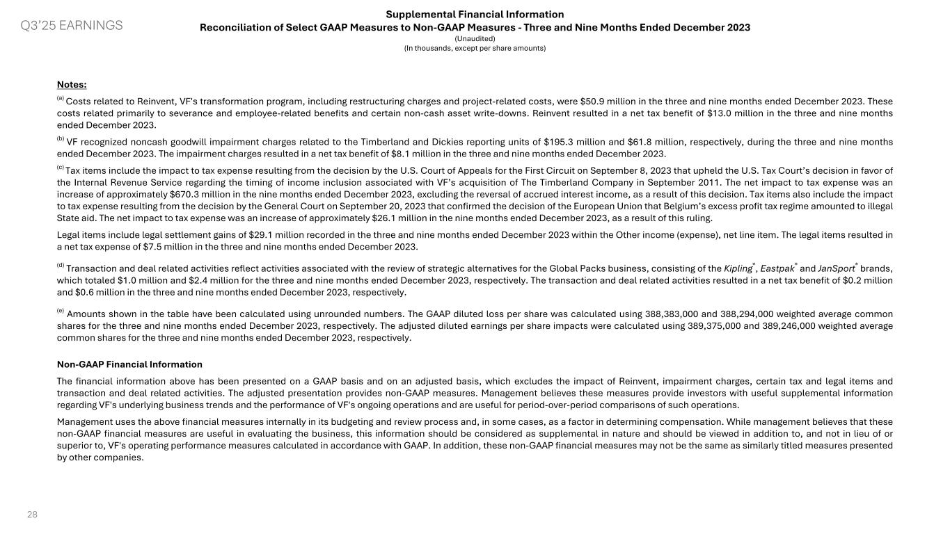 Notes: (a) Costs related to Reinvent, VF's transformation program, including restructuring charges and project-related costs, were $50.9 million in the three and nine months ended December 2023. These costs related primarily to severance and employee-related benefits and certain non-cash asset write-downs. Reinvent resulted in a net tax benefit of $13.0 million in the three and nine months ended December 2023. (b) VF recognized noncash goodwill impairment charges related to the Timberland and Dickies reporting units of $195.3 million and $61.8 million, respectively, during the three and nine months ended December 2023. The impairment charges resulted in a net tax benefit of $8.1 million in the three and nine months ended December 2023. (c) Tax items include the impact to tax expense resulting from the decision by the U.S. Court of Appeals for the First Circuit on September 8, 2023 that upheld the U.S. Tax Court’s decision in favor of the Internal Revenue Service regarding the timing of income inclusion associated with VF’s acquisition of The Timberland Company in September 2011. The net impact to tax expense was an increase of approximately $670.3 million in the nine months ended December 2023, excluding the reversal of accrued interest income, as a result of this decision. Tax items also include the impact to tax expense resulting from the decision by the General Court on September 20, 2023 that confirmed the decision of the European Union that Belgium’s excess profit tax regime amounted to illegal State aid. The net impact to tax expense was an increase of approximately $26.1 million in the nine months ended December 2023, as a result of this ruling. Legal items include legal settlement gains of $29.1 million recorded in the three and nine months ended December 2023 within the Other income (expense), net line item. The legal items resulted in a net tax expense of $7.5 million in the three and nine months ended December 2023. (d) Transaction and deal related activities reflect activities associated with the review of strategic alternatives for the Global Packs business, consisting of the Kipling®, Eastpak® and JanSport® brands, which totaled $1.0 million and $2.4 million for the three and nine months ended December 2023, respectively. The transaction and deal related activities resulted in a net tax benefit of $0.2 million and $0.6 million in the three and nine months ended December 2023, respectively. (e) Amounts shown in the table have been calculated using unrounded numbers. The GAAP diluted loss per share was calculated using 388,383,000 and 388,294,000 weighted average common shares for the three and nine months ended December 2023, respectively. The adjusted diluted earnings per share impacts were calculated using 389,375,000 and 389,246,000 weighted average common shares for the three and nine months ended December 2023, respectively. Non-GAAP Financial Information The financial information above has been presented on a GAAP basis and on an adjusted basis, which excludes the impact of Reinvent, impairment charges, certain tax and legal items and transaction and deal related activities. The adjusted presentation provides non-GAAP measures. Management believes these measures provide investors with useful supplemental information regarding VF's underlying business trends and the performance of VF's ongoing operations and are useful for period-over-period comparisons of such operations. Management uses the above financial measures internally in its budgeting and review process and, in some cases, as a factor in determining compensation. While management believes that these non-GAAP financial measures are useful in evaluating the business, this information should be considered as supplemental in nature and should be viewed in addition to, and not in lieu of or superior to, VF's operating performance measures calculated in accordance with GAAP. In addition, these non-GAAP financial measures may not be the same as similarly titled measures presented by other companies. Q3’25 EARNINGS 28 Supplemental Financial Information Reconciliation of Select GAAP Measures to Non-GAAP Measures - Three and Nine Months Ended December 2023 (Unaudited) (In thousands, except per share amounts)