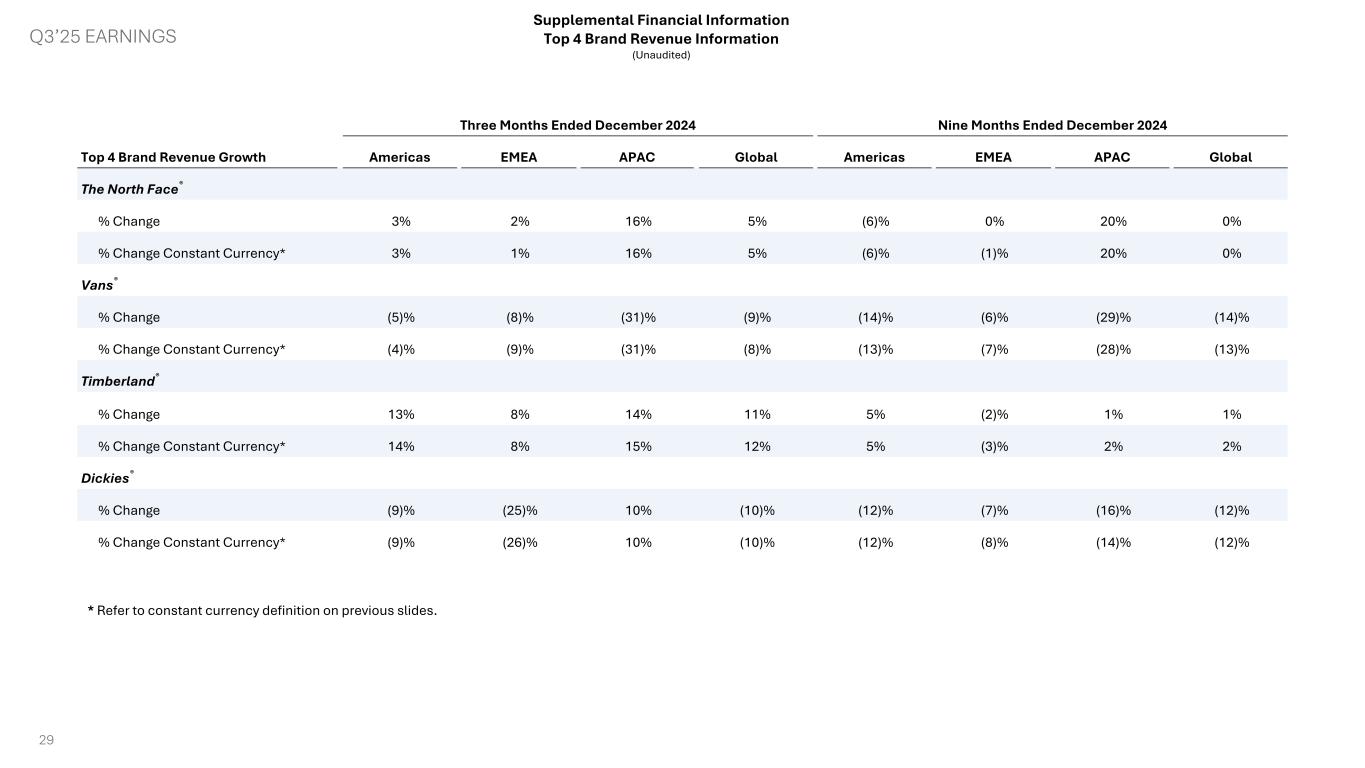 Supplemental Financial Information Top 4 Brand Revenue Information (Unaudited) Three Months Ended December 2024 Nine Months Ended December 2024 Top 4 Brand Revenue Growth Americas EMEA APAC Global Americas EMEA APAC Global The North Face® % Change 3% 2% 16% 5% (6)% 0% 20% 0% % Change Constant Currency* 3% 1% 16% 5% (6)% (1)% 20% 0% Vans® % Change (5)% (8)% (31)% (9)% (14)% (6)% (29)% (14)% % Change Constant Currency* (4)% (9)% (31)% (8)% (13)% (7)% (28)% (13)% Timberland® % Change 13% 8% 14% 11% 5% (2)% 1% 1% % Change Constant Currency* 14% 8% 15% 12% 5% (3)% 2% 2% Dickies® % Change (9)% (25)% 10% (10)% (12)% (7)% (16)% (12)% % Change Constant Currency* (9)% (26)% 10% (10)% (12)% (8)% (14)% (12)% * Refer to constant currency definition on previous slides. Q3’25 EARNINGS 29