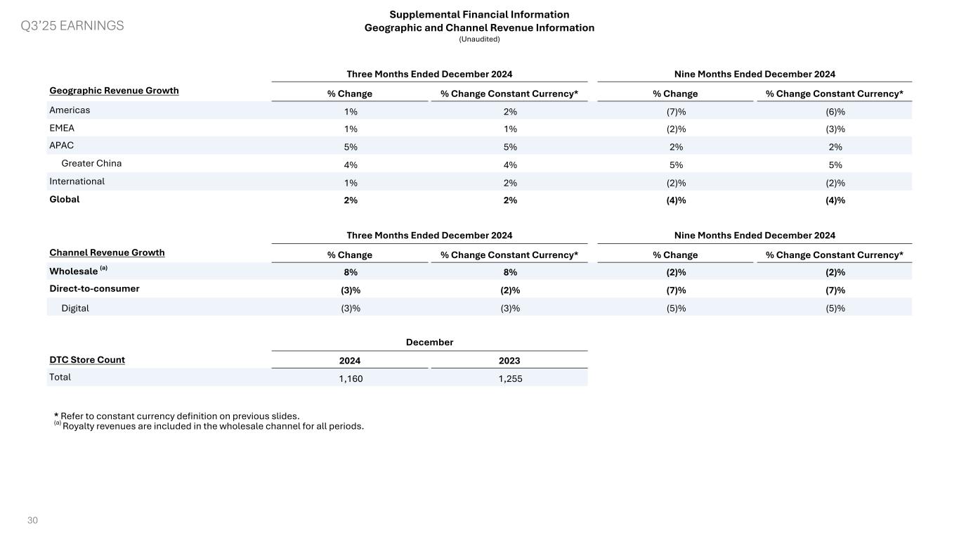 Supplemental Financial Information Geographic and Channel Revenue Information (Unaudited) Three Months Ended December 2024 Nine Months Ended December 2024 Geographic Revenue Growth % Change % Change Constant Currency* % Change % Change Constant Currency* Americas 1% 2% (7)% (6)% EMEA 1% 1% (2)% (3)% APAC 5% 5% 2% 2% Greater China 4% 4% 5% 5% International 1% 2% (2)% (2)% Global 2% 2% (4)% (4)% Three Months Ended December 2024 Nine Months Ended December 2024 Channel Revenue Growth % Change % Change Constant Currency* % Change % Change Constant Currency* Wholesale (a) 8% 8% (2)% (2)% Direct-to-consumer (3)% (2)% (7)% (7)% Digital (3)% (3)% (5)% (5)% December DTC Store Count 2024 2023 Total 1,160 1,255 * Refer to constant currency definition on previous slides. (a) Royalty revenues are included in the wholesale channel for all periods. Q3’25 EARNINGS 30