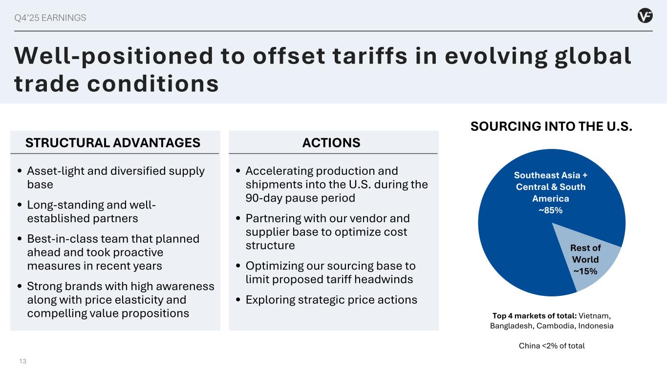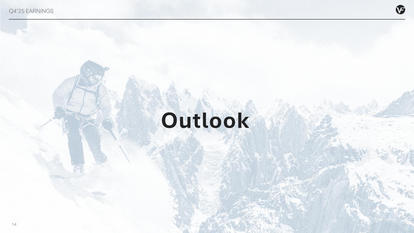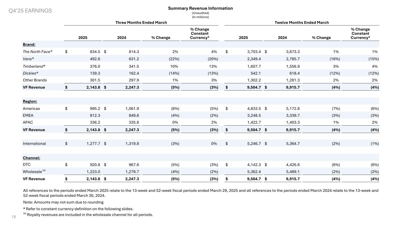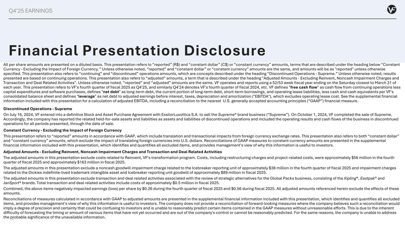 Financial Presentation Disclosure All per share amounts are presented on a diluted basis. This presentation refers to “reported” (R$) and “constant dollar” (C$) or “constant currency” amounts, terms that are described under the heading below “Constant Currency - Excluding the Impact of Foreign Currency.” Unless otherwise noted, “reported” and “constant dollar” or “constant currency” amounts are the same, and amounts will be as "reported" unless otherwise specified. This presentation also refers to “continuing” and “discontinued” operations amounts, which are concepts described under the heading “Discontinued Operations - Supreme.” Unless otherwise noted, results presented are based on continuing operations. This presentation also refers to “adjusted” amounts, a term that is described under the heading "Adjusted Amounts - Excluding Reinvent, Noncash Impairment Charges and Transaction and Deal Related Activities". Unless otherwise noted, “reported” and “adjusted” amounts are the same. VF operates and reports using a 52/53 week fiscal year ending on the Saturday closest to March 31 of each year. This presentation refers to VF's fourth quarter of fiscal 2025 as Q4'25, and similarly Q4'24 denotes VF's fourth quarter of fiscal 2024, etc. VF defines "free cash flow" as cash flow from continuing operations less capital expenditures and software purchases, defines "net debt" as long-term debt, the current portion of long-term debt, short-term borrowings, and operating lease liabilities, less cash and cash equivalents per VF's consolidated balance sheet and defines "leverage" as net debt to adjusted earnings before interest, taxes, depreciation and amortization ("EBITDA"), which excludes operating lease cost. See the supplemental financial information included with this presentation for a calculation of adjusted EBITDA, including a reconciliation to the nearest U.S. generally accepted accounting principles (“GAAP”) financial measure. Discontinued Operations - Supreme On July 16, 2024, VF entered into a definitive Stock and Asset Purchase Agreement with EssilorLuxottica S.A. to sell the Supreme® brand business (“Supreme”). On October 1, 2024, VF completed the sale of Supreme. Accordingly, the company has reported the related held-for-sale assets and liabilities as assets and liabilities of discontinued operations and included the operating results and cash flows of the business in discontinued operations for all periods presented, through the date of sale. Constant Currency - Excluding the Impact of Foreign Currency This presentation refers to “reported” amounts in accordance with GAAP, which include translation and transactional impacts from foreign currency exchange rates. This presentation also refers to both “constant dollar” and “constant currency” amounts, which exclude the impact of translating foreign currencies into U.S. dollars. Reconciliations of GAAP measures to constant currency amounts are presented in the supplemental financial information included with this presentation, which identifies and quantifies all excluded items, and provides management’s view of why this information is useful to investors. Adjusted Amounts - Excluding Reinvent, Noncash Impairment Charges and Transaction and Deal Related Activities The adjusted amounts in this presentation exclude costs related to Reinvent, VF's transformation program. Costs, including restructuring charges and project-related costs, were approximately $56 million in the fourth quarter of fiscal 2025 and approximately $163 million in fiscal 2025. The adjusted amounts in this presentation exclude a noncash goodwill impairment charge related to the Icebreaker reporting unit of approximately $38 million in the fourth quarter of fiscal 2025 and impairment charges related to the Dickies indefinite-lived trademark intangible asset and Icebreaker reporting unit goodwill of approximately $89 million in fiscal 2025. The adjusted amounts in this presentation exclude transaction and deal related activities associated with the review of strategic alternatives for the Global Packs business, consisting of the Kipling®, Eastpak® and JanSport® brands. Total transaction and deal related activities include costs of approximately $0.5 million in fiscal 2025. Combined, the above items negatively impacted earnings (loss) per share by $0.26 during the fourth quarter of fiscal 2025 and $0.56 during fiscal 2025. All adjusted amounts referenced herein exclude the effects of these amounts. Reconciliations of measures calculated in accordance with GAAP to adjusted amounts are presented in the supplemental financial information included with this presentation, which identifies and quantifies all excluded items, and provides management’s view of why this information is useful to investors. The company does not provide a reconciliation of forward-looking measures where the company believes such a reconciliation would imply a degree of precision and certainty that could be confusing to investors and is unable to reasonably predict certain items contained in the GAAP measures without unreasonable efforts. This is due to the inherent difficulty of forecasting the timing or amount of various items that have not yet occurred and are out of the company's control or cannot be reasonably predicted. For the same reasons, the company is unable to address the probable significance of the unavailable information. Q4’25 EARNINGS 2