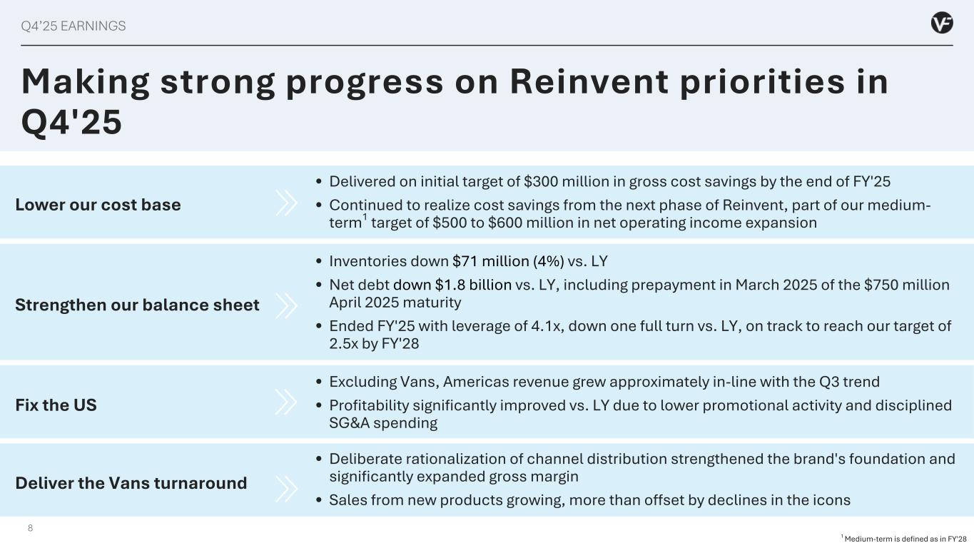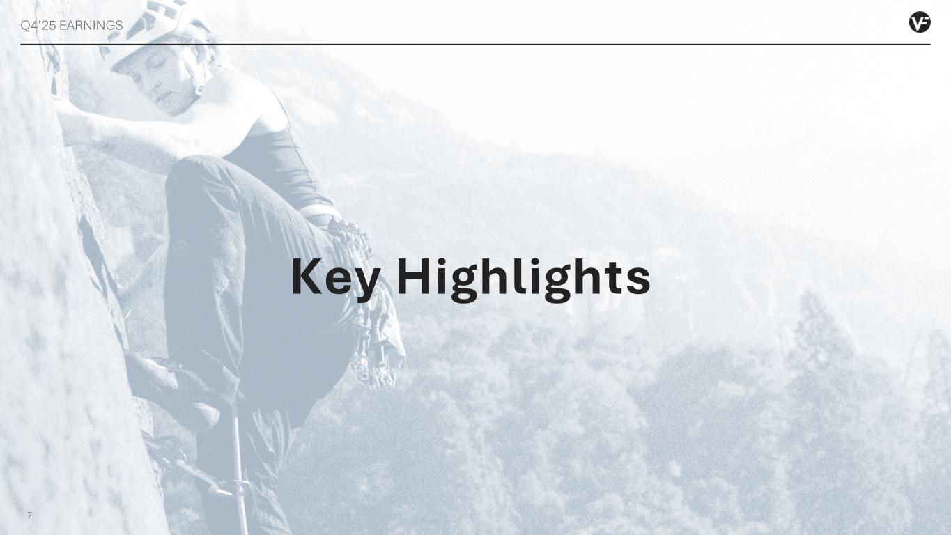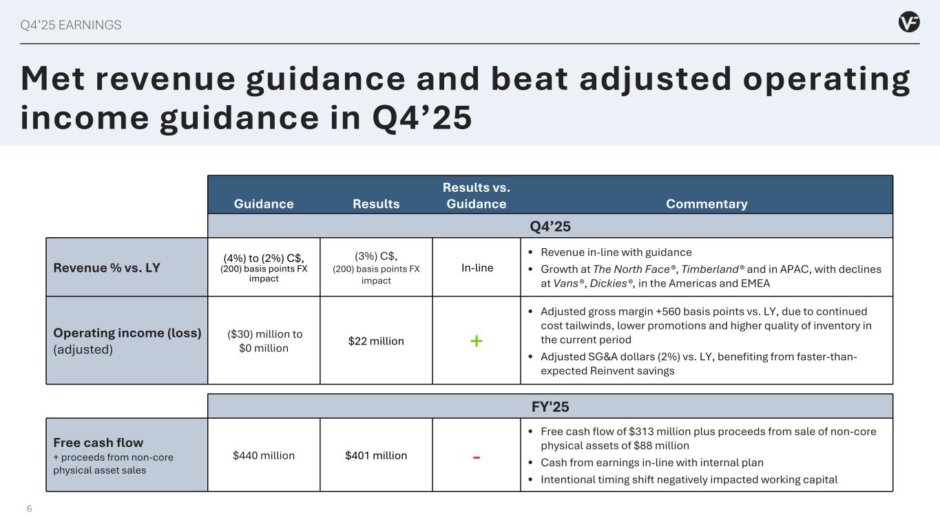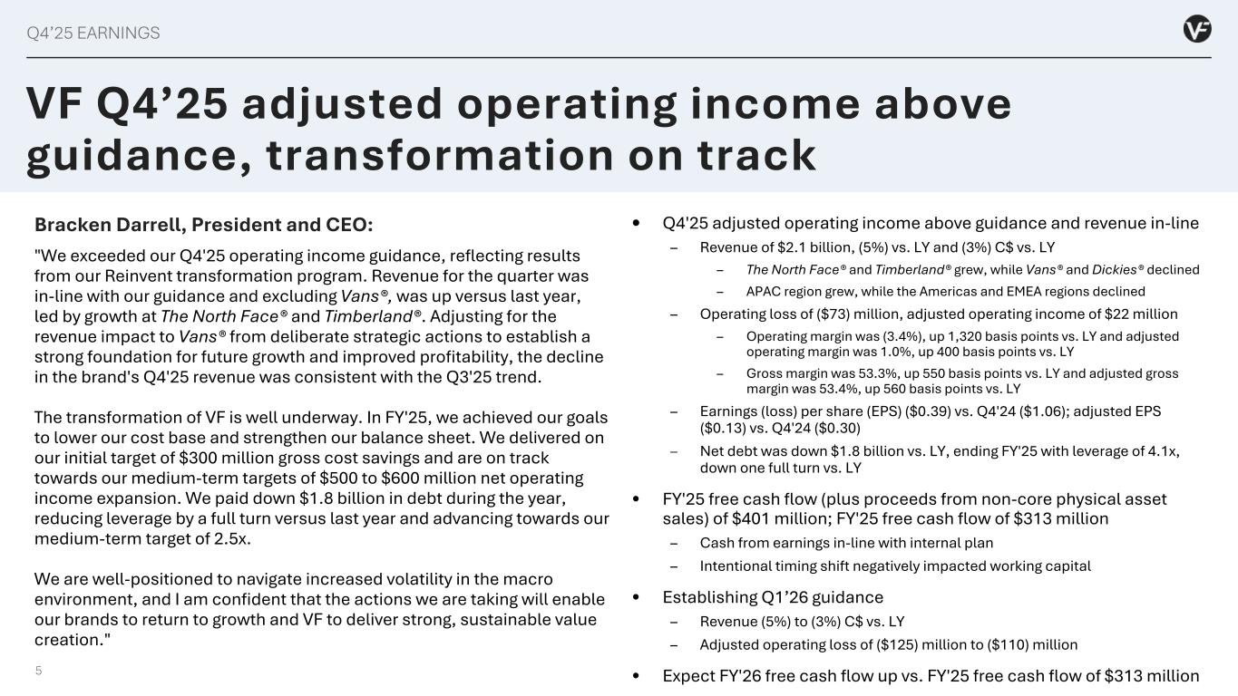 Bracken Darrell, President and CEO: "We exceeded our Q4'25 operating income guidance, reflecting results from our Reinvent transformation program. Revenue for the quarter was in-line with our guidance and excluding Vans®, was up versus last year, led by growth at The North Face® and Timberland®. Adjusting for the revenue impact to Vans® from deliberate strategic actions to establish a strong foundation for future growth and improved profitability, the decline in the brand's Q4'25 revenue was consistent with the Q3'25 trend. The transformation of VF is well underway. In FY'25, we achieved our goals to lower our cost base and strengthen our balance sheet. We delivered on our initial target of $300 million gross cost savings and are on track towards our medium-term targets of $500 to $600 million net operating income expansion. We paid down $1.8 billion in debt during the year, reducing leverage by a full turn versus last year and advancing towards our medium-term target of 2.5x. We are well-positioned to navigate increased volatility in the macro environment, and I am confident that the actions we are taking will enable our brands to return to growth and VF to deliver strong, sustainable value creation." • Q4'25 adjusted operating income above guidance and revenue in-line – Revenue of $2.1 billion, (5%) vs. LY and (3%) C$ vs. LY – The North Face® and Timberland® grew, while Vans® and Dickies® declined – APAC region grew, while the Americas and EMEA regions declined – Operating loss of ($73) million, adjusted operating income of $22 million – Operating margin was (3.4%), up 1,320 basis points vs. LY and adjusted operating margin was 1.0%, up 400 basis points vs. LY – Gross margin was 53.3%, up 550 basis points vs. LY and adjusted gross margin was 53.4%, up 560 basis points vs. LY – Earnings (loss) per share (EPS) ($0.39) vs. Q4'24 ($1.06); adjusted EPS ($0.13) vs. Q4'24 ($0.30) – Net debt was down $1.8 billion vs. LY, ending FY'25 with leverage of 4.1x, down one full turn vs. LY • FY'25 free cash flow (plus proceeds from non-core physical asset sales) of $401 million; FY'25 free cash flow of $313 million – Cash from earnings in-line with internal plan – Intentional timing shift negatively impacted working capital • Establishing Q1’26 guidance – Revenue (5%) to (3%) C$ vs. LY – Adjusted operating loss of ($125) million to ($110) million • Expect FY'26 free cash flow up vs. FY'25 free cash flow of $313 million VF Q4’25 adjusted operating income above guidance, transformation on track Q4’25 EARNINGS 5
