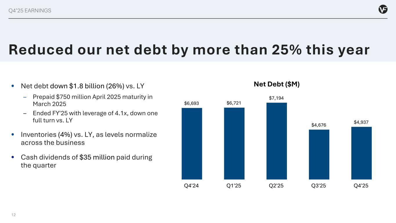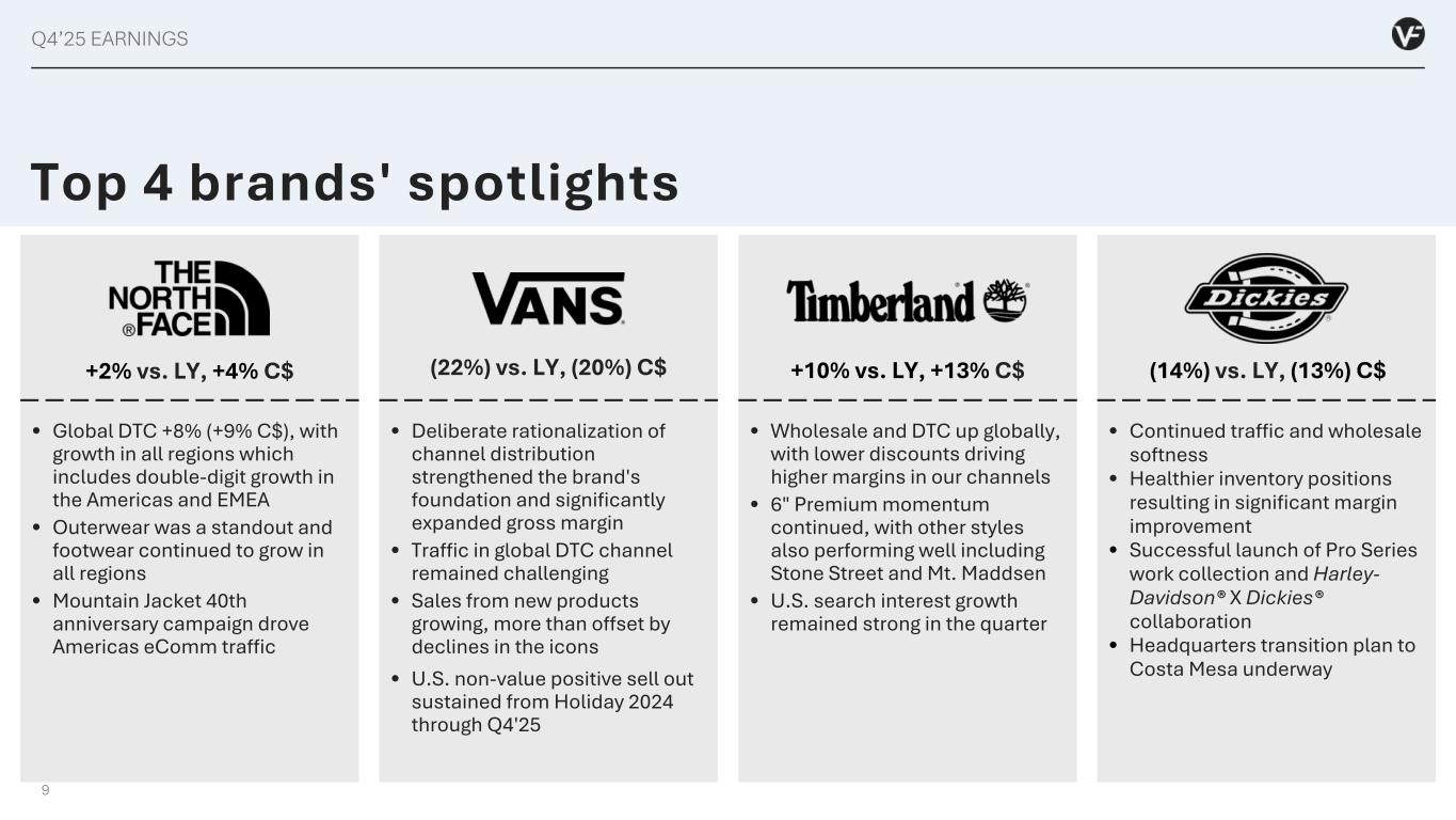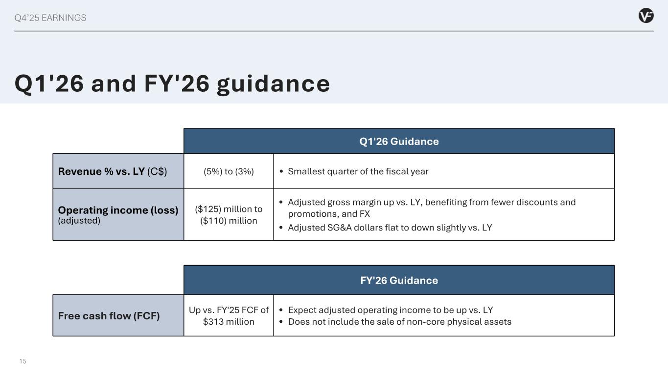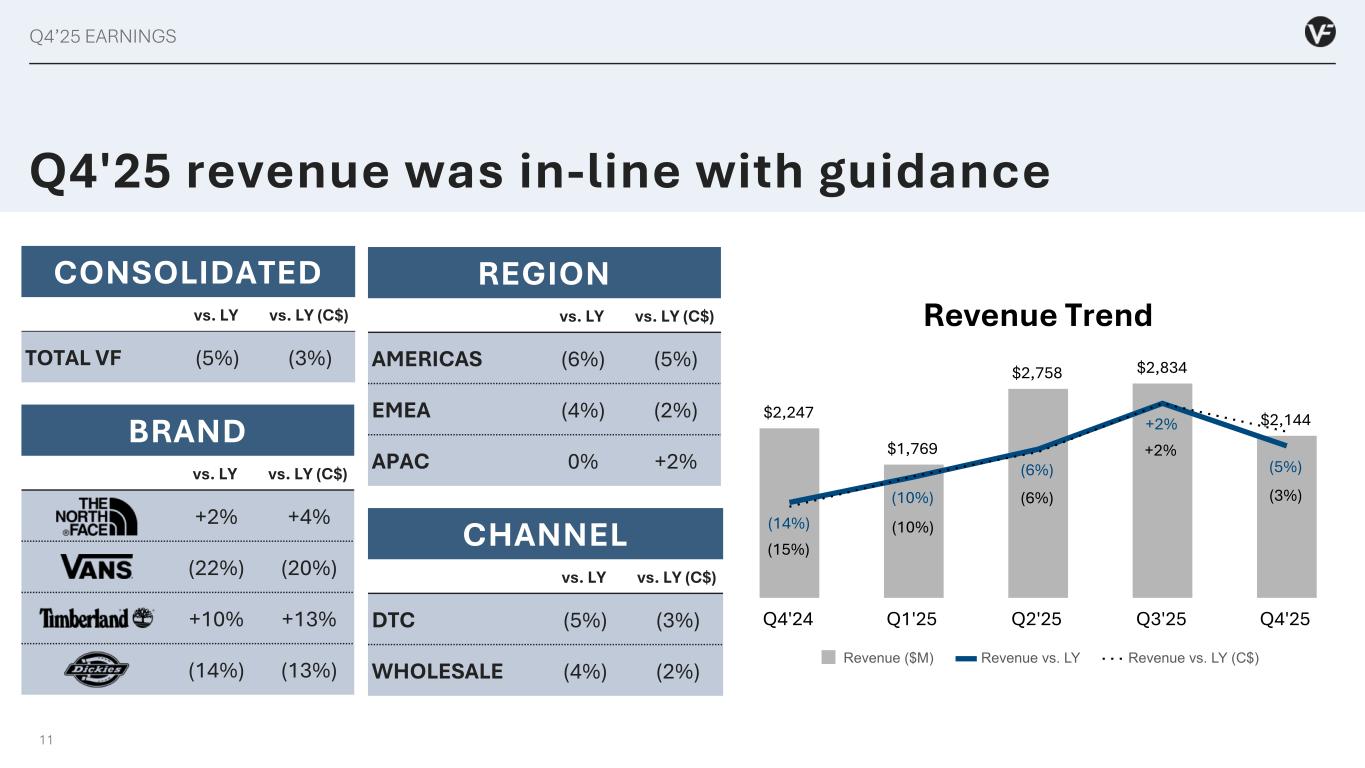 Bracken Darrell, President and CEO: "We exceeded our Q4'25 operating income guidance, reflecting results from our Reinvent transformation program. Revenue for the quarter was in-line with our guidance and excluding Vans®, was up versus last year, led by growth at The North Face® and Timberland®. Adjusting for the revenue impact to Vans® from deliberate strategic actions to establish a strong foundation for future growth and improved profitability, the decline in the brand's Q4'25 revenue was consistent with the Q3'25 trend. The transformation of VF is well underway. In FY'25, we achieved our goals to lower our cost base and strengthen our balance sheet. We delivered on our initial target of $300 million gross cost savings and are on track towards our medium-term targets of $500 to $600 million net operating income expansion. We paid down $1.8 billion in debt during the year, reducing leverage by a full turn versus last year and advancing towards our medium-term target of 2.5x. We are well-positioned to navigate increased volatility in the macro environment, and I am confident that the actions we are taking will enable our brands to return to growth and VF to deliver strong, sustainable value creation." • Q4'25 adjusted operating income above guidance and revenue in-line – Revenue of $2.1 billion, (5%) vs. LY and (3%) C$ vs. LY – The North Face® and Timberland® grew, while Vans® and Dickies® declined – APAC region grew, while the Americas and EMEA regions declined – Operating loss of ($73) million, adjusted operating income of $22 million – Operating margin was (3.4%), up 1,320 basis points vs. LY and adjusted operating margin was 1.0%, up 400 basis points vs. LY – Gross margin was 53.3%, up 550 basis points vs. LY and adjusted gross margin was 53.4%, up 560 basis points vs. LY – Earnings (loss) per share (EPS) ($0.39) vs. Q4'24 ($1.06); adjusted EPS ($0.13) vs. Q4'24 ($0.30) – Net debt was down $1.8 billion vs. LY, ending FY'25 with leverage of 4.1x, down one full turn vs. LY • FY'25 free cash flow (plus proceeds from non-core physical asset sales) of $401 million; FY'25 free cash flow of $313 million – Cash from earnings in-line with internal plan – Intentional timing shift negatively impacted working capital • Establishing Q1’26 guidance – Revenue (5%) to (3%) C$ vs. LY – Adjusted operating loss of ($125) million to ($110) million • Expect FY'26 free cash flow up vs. FY'25 free cash flow of $313 million VF Q4’25 adjusted operating income above guidance, transformation on track Q4’25 EARNINGS 5