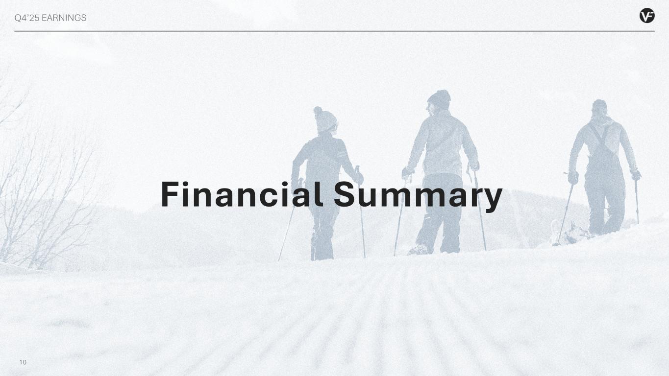 • Global DTC +8% (+9% C$), with growth in all regions which includes double-digit growth in the Americas and EMEA • Outerwear was a standout and footwear continued to grow in all regions • Mountain Jacket 40th anniversary campaign drove Americas eComm traffic Top 4 brands' spotlights • Deliberate rationalization of channel distribution strengthened the brand's foundation and significantly expanded gross margin • Traffic in global DTC channel remained challenging • Sales from new products growing, more than offset by declines in the icons • U.S. non-value positive sell out sustained from Holiday 2024 through Q4'25 +2% vs. LY, +4% C$ (22%) vs. LY, (20%) C$ +10% vs. LY, +13% C$ • Continued traffic and wholesale softness • Healthier inventory positions resulting in significant margin improvement • Successful launch of Pro Series work collection and Harley- Davidson® X Dickies® collaboration • Headquarters transition plan to Costa Mesa underway (14%) vs. LY, (13%) C$ Q4’25 EARNINGS 9 • Wholesale and DTC up globally, with lower discounts driving higher margins in our channels • 6" Premium momentum continued, with other styles also performing well including Stone Street and Mt. Maddsen • U.S. search interest growth remained strong in the quarter