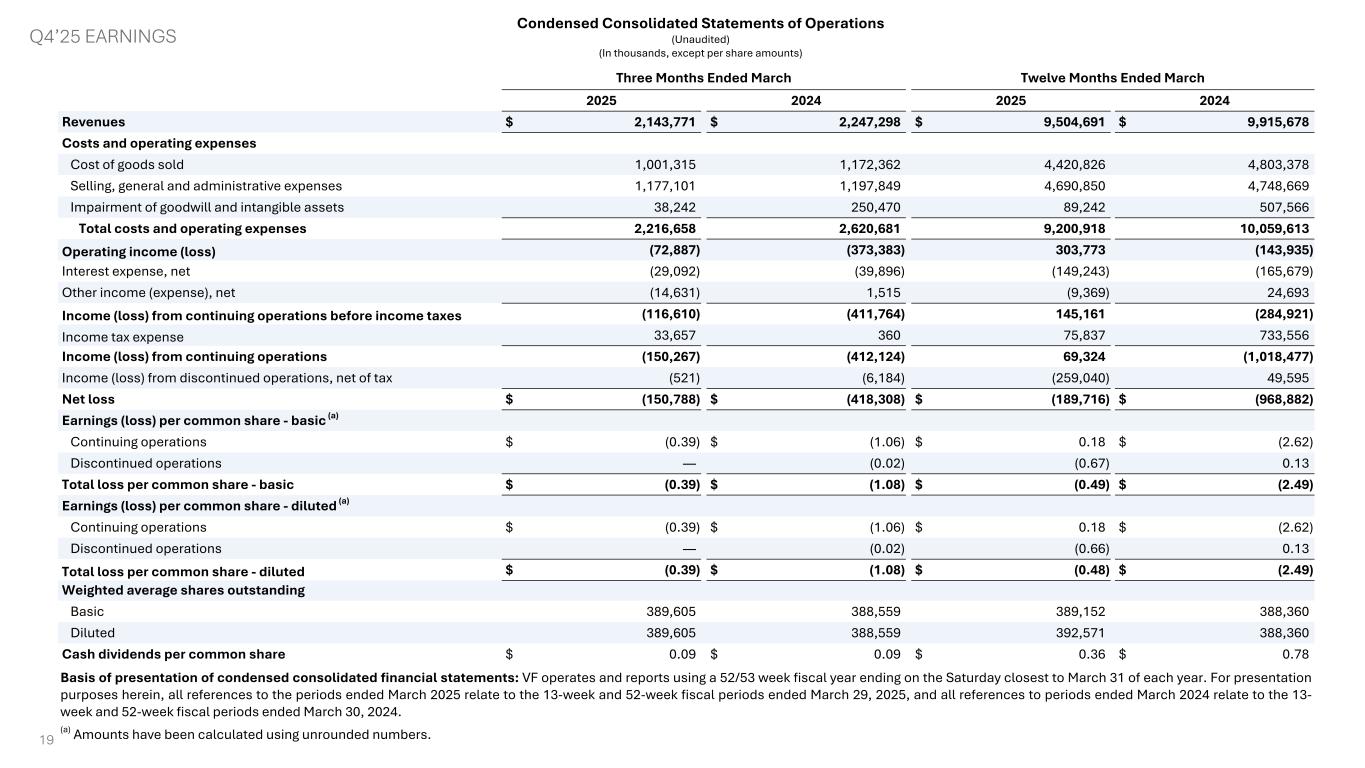 Three Months Ended March Twelve Months Ended March 2025 2024 2025 2024 Revenues $ 2,143,771 $ 2,247,298 $ 9,504,691 $ 9,915,678 Costs and operating expenses Cost of goods sold 1,001,315 1,172,362 4,420,826 4,803,378 Selling, general and administrative expenses 1,177,101 1,197,849 4,690,850 4,748,669 Impairment of goodwill and intangible assets 38,242 250,470 89,242 507,566 Total costs and operating expenses 2,216,658 2,620,681 9,200,918 10,059,613 Operating income (loss) (72,887) (373,383) 303,773 (143,935) Interest expense, net (29,092) (39,896) (149,243) (165,679) Other income (expense), net (14,631) 1,515 (9,369) 24,693 Income (loss) from continuing operations before income taxes (116,610) (411,764) 145,161 (284,921) Income tax expense 33,657 360 75,837 733,556 Income (loss) from continuing operations (150,267) (412,124) 69,324 (1,018,477) Income (loss) from discontinued operations, net of tax (521) (6,184) (259,040) 49,595 Net loss $ (150,788) $ (418,308) $ (189,716) $ (968,882) Earnings (loss) per common share - basic (a) Continuing operations $ (0.39) $ (1.06) $ 0.18 $ (2.62) Discontinued operations — (0.02) (0.67) 0.13 Total loss per common share - basic $ (0.39) $ (1.08) $ (0.49) $ (2.49) Earnings (loss) per common share - diluted (a) Continuing operations $ (0.39) $ (1.06) $ 0.18 $ (2.62) Discontinued operations — (0.02) (0.66) 0.13 Total loss per common share - diluted $ (0.39) $ (1.08) $ (0.48) $ (2.49) Weighted average shares outstanding Basic 389,605 388,559 389,152 388,360 Diluted 389,605 388,559 392,571 388,360 Cash dividends per common share $ 0.09 $ 0.09 $ 0.36 $ 0.78 Condensed Consolidated Statements of Operations (Unaudited) (In thousands, except per share amounts) Basis of presentation of condensed consolidated financial statements: VF operates and reports using a 52/53 week fiscal year ending on the Saturday closest to March 31 of each year. For presentation purposes herein, all references to the periods ended March 2025 relate to the 13-week and 52-week fiscal periods ended March 29, 2025, and all references to periods ended March 2024 relate to the 13- week and 52-week fiscal periods ended March 30, 2024. (a) Amounts have been calculated using unrounded numbers. Q4’25 EARNINGS 19