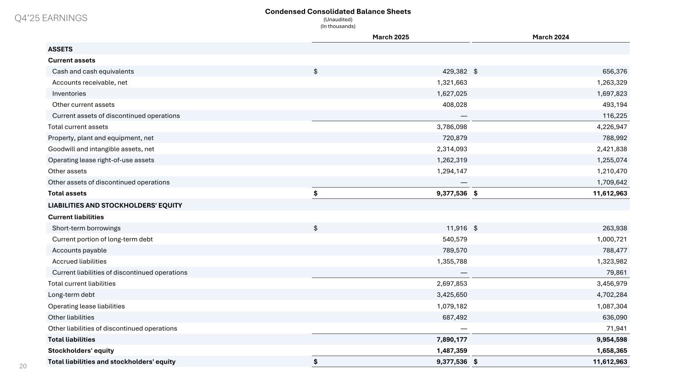 Condensed Consolidated Balance Sheets (Unaudited) (In thousands) March 2025 March 2024 ASSETS Current assets Cash and cash equivalents $ 429,382 $ 656,376 Accounts receivable, net 1,321,663 1,263,329 Inventories 1,627,025 1,697,823 Other current assets 408,028 493,194 Current assets of discontinued operations — 116,225 Total current assets 3,786,098 4,226,947 Property, plant and equipment, net 720,879 788,992 Goodwill and intangible assets, net 2,314,093 2,421,838 Operating lease right-of-use assets 1,262,319 1,255,074 Other assets 1,294,147 1,210,470 Other assets of discontinued operations — 1,709,642 Total assets $ 9,377,536 $ 11,612,963 LIABILITIES AND STOCKHOLDERS' EQUITY Current liabilities Short-term borrowings $ 11,916 $ 263,938 Current portion of long-term debt 540,579 1,000,721 Accounts payable 789,570 788,477 Accrued liabilities 1,355,788 1,323,982 Current liabilities of discontinued operations — 79,861 Total current liabilities 2,697,853 3,456,979 Long-term debt 3,425,650 4,702,284 Operating lease liabilities 1,079,182 1,087,304 Other liabilities 687,492 636,090 Other liabilities of discontinued operations — 71,941 Total liabilities 7,890,177 9,954,598 Stockholders' equity 1,487,359 1,658,365 Total liabilities and stockholders' equity $ 9,377,536 $ 11,612,963 Q4’25 EARNINGS 20