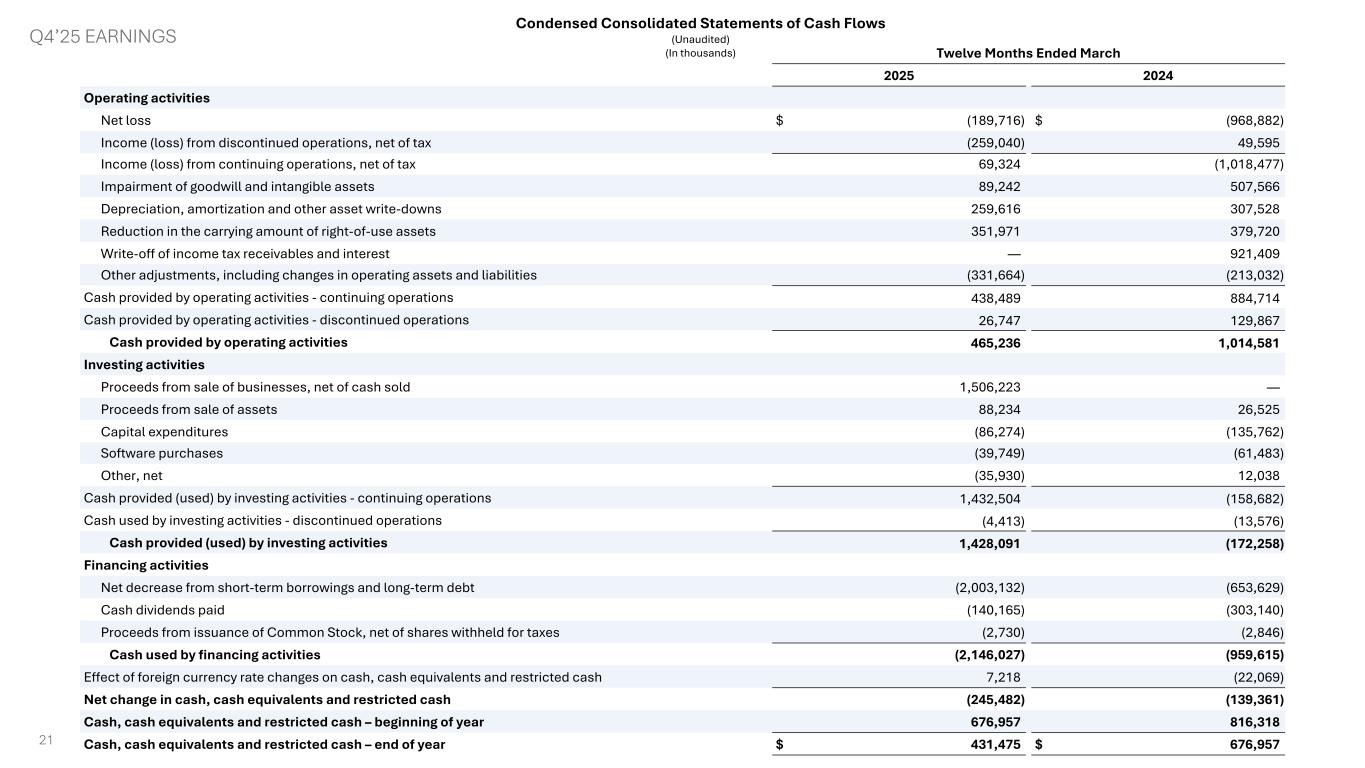 Condensed Consolidated Statements of Cash Flows (Unaudited) (In thousands) Twelve Months Ended March 2025 2024 Operating activities Net loss $ (189,716) $ (968,882) Income (loss) from discontinued operations, net of tax (259,040) 49,595 Income (loss) from continuing operations, net of tax 69,324 (1,018,477) Impairment of goodwill and intangible assets 89,242 507,566 Depreciation, amortization and other asset write-downs 259,616 307,528 Reduction in the carrying amount of right-of-use assets 351,971 379,720 Write-off of income tax receivables and interest — 921,409 Other adjustments, including changes in operating assets and liabilities (331,664) (213,032) Cash provided by operating activities - continuing operations 438,489 884,714 Cash provided by operating activities - discontinued operations 26,747 129,867 Cash provided by operating activities 465,236 1,014,581 Investing activities Proceeds from sale of businesses, net of cash sold 1,506,223 — Proceeds from sale of assets 88,234 26,525 Capital expenditures (86,274) (135,762) Software purchases (39,749) (61,483) Other, net (35,930) 12,038 Cash provided (used) by investing activities - continuing operations 1,432,504 (158,682) Cash used by investing activities - discontinued operations (4,413) (13,576) Cash provided (used) by investing activities 1,428,091 (172,258) Financing activities Net decrease from short-term borrowings and long-term debt (2,003,132) (653,629) Cash dividends paid (140,165) (303,140) Proceeds from issuance of Common Stock, net of shares withheld for taxes (2,730) (2,846) Cash used by financing activities (2,146,027) (959,615) Effect of foreign currency rate changes on cash, cash equivalents and restricted cash 7,218 (22,069) Net change in cash, cash equivalents and restricted cash (245,482) (139,361) Cash, cash equivalents and restricted cash – beginning of year 676,957 816,318 Cash, cash equivalents and restricted cash – end of year $ 431,475 $ 676,957 Q4’25 EARNINGS 21