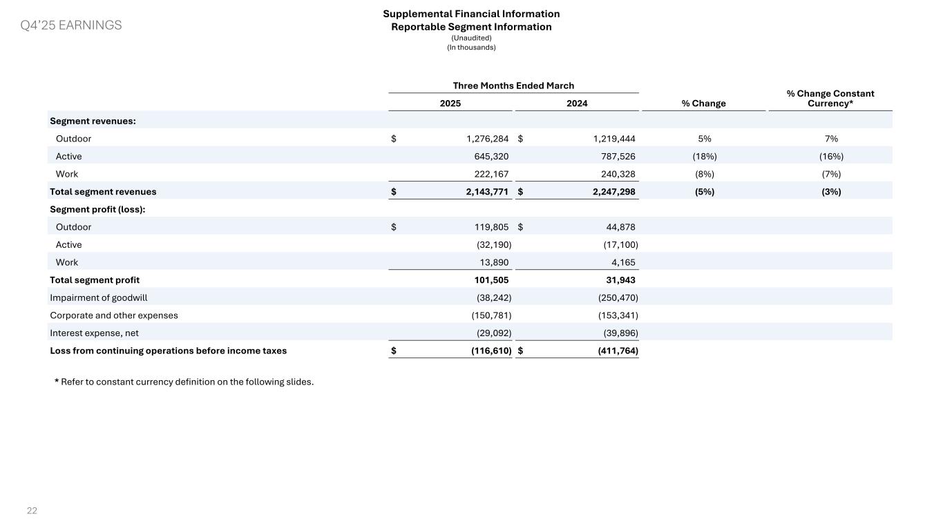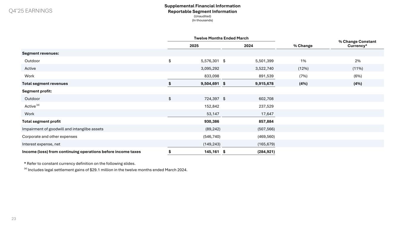 Three Months Ended March % Change Constant Currency*2025 2024 % Change Segment revenues: Outdoor $ 1,276,284 $ 1,219,444 5% 7% Active 645,320 787,526 (18%) (16%) Work 222,167 240,328 (8%) (7%) Total segment revenues $ 2,143,771 $ 2,247,298 (5%) (3%) Segment profit (loss): Outdoor $ 119,805 $ 44,878 Active (32,190) (17,100) Work 13,890 4,165 Total segment profit 101,505 31,943 Impairment of goodwill (38,242) (250,470) Corporate and other expenses (150,781) (153,341) Interest expense, net (29,092) (39,896) Loss from continuing operations before income taxes $ (116,610) $ (411,764) Supplemental Financial Information Reportable Segment Information (Unaudited) (In thousands) * Refer to constant currency definition on the following slides. Q4’25 EARNINGS 22