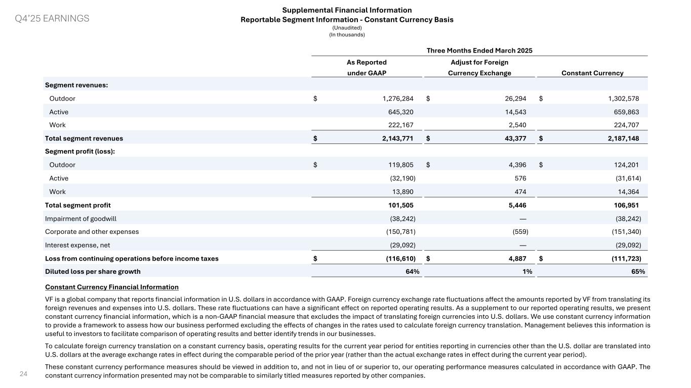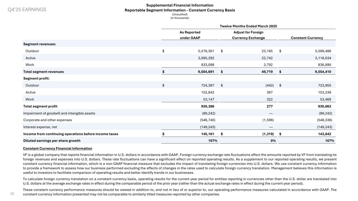 Supplemental Financial Information Reportable Segment Information - Constant Currency Basis (Unaudited) (In thousands) Three Months Ended March 2025 As Reported Adjust for Foreign under GAAP Currency Exchange Constant Currency Segment revenues: Outdoor $ 1,276,284 $ 26,294 $ 1,302,578 Active 645,320 14,543 659,863 Work 222,167 2,540 224,707 Total segment revenues $ 2,143,771 $ 43,377 $ 2,187,148 Segment profit (loss): Outdoor $ 119,805 $ 4,396 $ 124,201 Active (32,190) 576 (31,614) Work 13,890 474 14,364 Total segment profit 101,505 5,446 106,951 Impairment of goodwill (38,242) — (38,242) Corporate and other expenses (150,781) (559) (151,340) Interest expense, net (29,092) — (29,092) Loss from continuing operations before income taxes $ (116,610) $ 4,887 $ (111,723) Diluted loss per share growth 64% 1% 65% Constant Currency Financial Information VF is a global company that reports financial information in U.S. dollars in accordance with GAAP. Foreign currency exchange rate fluctuations affect the amounts reported by VF from translating its foreign revenues and expenses into U.S. dollars. These rate fluctuations can have a significant effect on reported operating results. As a supplement to our reported operating results, we present constant currency financial information, which is a non-GAAP financial measure that excludes the impact of translating foreign currencies into U.S. dollars. We use constant currency information to provide a framework to assess how our business performed excluding the effects of changes in the rates used to calculate foreign currency translation. Management believes this information is useful to investors to facilitate comparison of operating results and better identify trends in our businesses. To calculate foreign currency translation on a constant currency basis, operating results for the current year period for entities reporting in currencies other than the U.S. dollar are translated into U.S. dollars at the average exchange rates in effect during the comparable period of the prior year (rather than the actual exchange rates in effect during the current year period). These constant currency performance measures should be viewed in addition to, and not in lieu of or superior to, our operating performance measures calculated in accordance with GAAP. The constant currency information presented may not be comparable to similarly titled measures reported by other companies. Q4’25 EARNINGS 24