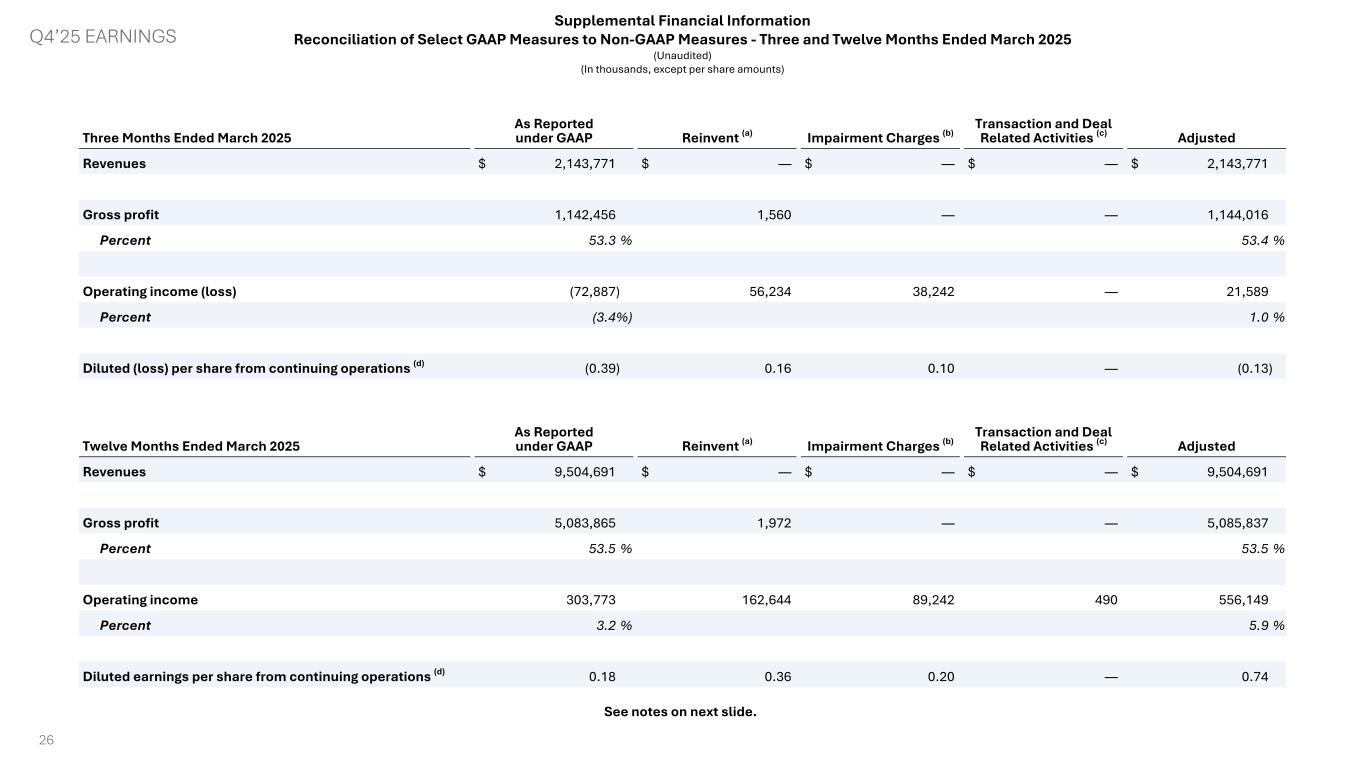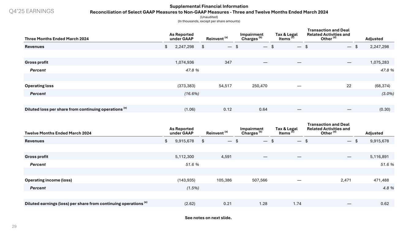 Three Months Ended March 2024 As Reported under GAAP Reinvent (a) Impairment Charges (b) Tax & Legal Items (c) Transaction and Deal Related Activities and Other (d) Adjusted Revenues $ 2,247,298 $ — $ — $ — $ — $ 2,247,298 Gross profit 1,074,936 347 — — — 1,075,283 Percent 47.8 % 47.8 % Operating loss (373,383) 54,517 250,470 — 22 (68,374) Percent (16.6%) (3.0%) Diluted loss per share from continuing operations (e) (1.06) 0.12 0.64 — — (0.30) Twelve Months Ended March 2024 As Reported under GAAP Reinvent (a) Impairment Charges (b) Tax & Legal Items (c) Transaction and Deal Related Activities and Other (d) Adjusted Revenues $ 9,915,678 $ — $ — $ — $ — $ 9,915,678 Gross profit 5,112,300 4,591 — — — 5,116,891 Percent 51.6 % 51.6 % Operating income (loss) (143,935) 105,386 507,566 — 2,471 471,488 Percent (1.5%) 4.8 % Diluted earnings (loss) per share from continuing operations (e) (2.62) 0.21 1.28 1.74 — 0.62 Q4’25 EARNINGS 29 See notes on next slide. Supplemental Financial Information Reconciliation of Select GAAP Measures to Non-GAAP Measures - Three and Twelve Months Ended March 2024 (Unaudited) (In thousands, except per share amounts)