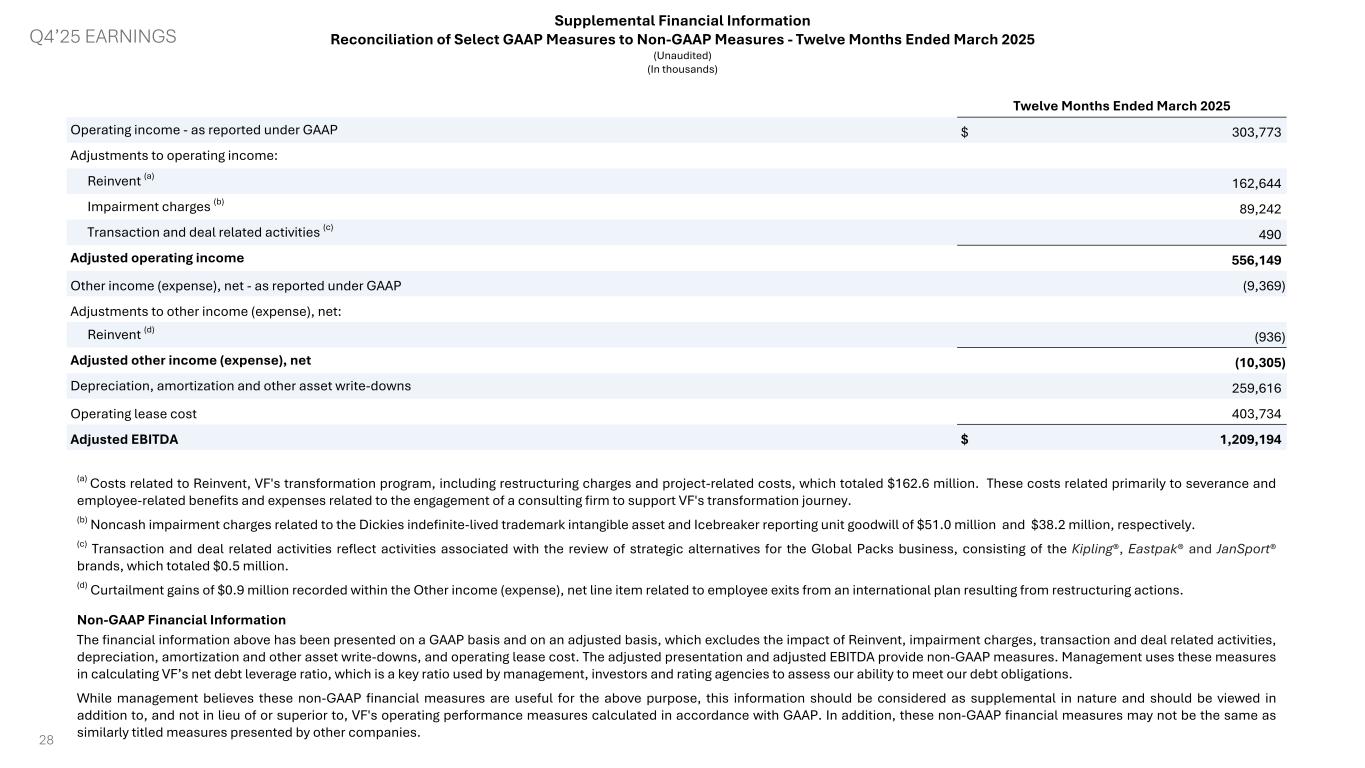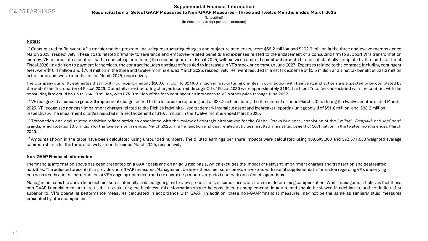 Notes: (a) Costs related to Reinvent, VF's transformation program, including restructuring charges and project-related costs, were $56.2 million and $162.6 million in the three and twelve months ended March 2025, respectively. These costs related primarily to severance and employee-related benefits and expenses related to the engagement of a consulting firm to support VF's transformation journey. VF entered into a contract with a consulting firm during the second quarter of Fiscal 2025, with services under the contract expected to be substantially complete by the third quarter of Fiscal 2026. In addition to payment for services, the contract includes contingent fees tied to increases in VF's stock price through June 2027. Expenses related to the contract, including contingent fees, were $16.4 million and $76.4 million in the three and twelve months ended March 2025, respectively. Reinvent resulted in a net tax expense of $5.5 million and a net tax benefit of $21.2 million in the three and twelve months ended March 2025, respectively. The Company currently estimates that it will incur approximately $200.0 million to $210.0 million in restructuring charges in connection with Reinvent, and actions are expected to be completed by the end of the first quarter of Fiscal 2026. Cumulative restructuring charges incurred through Q4 of Fiscal 2025 were approximately $190.1 million. Total fees associated with the contract with the consulting firm could be up to $141.0 million, with $75.0 million of the fees contingent on increases to VF’s stock price through June 2027. (b) VF recognized a noncash goodwill impairment charge related to the Icebreaker reporting unit of $38.2 million during the three months ended March 2025. During the twelve months ended March 2025, VF recognized noncash impairment charges related to the Dickies indefinite-lived trademark intangible asset and Icebreaker reporting unit goodwill of $51.0 million and $38.2 million, respectively. The impairment charges resulted in a net tax benefit of $10.5 million in the twelve months ended March 2025. (c) Transaction and deal related activities reflect activities associated with the review of strategic alternatives for the Global Packs business, consisting of the Kipling®, Eastpak® and JanSport® brands, which totaled $0.5 million for the twelve months ended March 2025. The transaction and deal related activities resulted in a net tax benefit of $0.1 million in the twelve months ended March 2025. (d) Amounts shown in the table have been calculated using unrounded numbers. The diluted earnings per share impacts were calculated using 389,605,000 and 392,571,000 weighted average common shares for the three and twelve months ended March 2025, respectively. Non-GAAP Financial Information The financial information above has been presented on a GAAP basis and on an adjusted basis, which excludes the impact of Reinvent, impairment charges and transaction and deal related activities. The adjusted presentation provides non-GAAP measures. Management believes these measures provide investors with useful supplemental information regarding VF's underlying business trends and the performance of VF's ongoing operations and are useful for period-over-period comparisons of such operations. Management uses the above financial measures internally in its budgeting and review process and, in some cases, as a factor in determining compensation. While management believes that these non-GAAP financial measures are useful in evaluating the business, this information should be considered as supplemental in nature and should be viewed in addition to, and not in lieu of or superior to, VF's operating performance measures calculated in accordance with GAAP. In addition, these non-GAAP financial measures may not be the same as similarly titled measures presented by other companies. Q4’25 EARNINGS 27 Supplemental Financial Information Reconciliation of Select GAAP Measures to Non-GAAP Measures - Three and Twelve Months Ended March 2025 (Unaudited) (In thousands, except per share amounts)