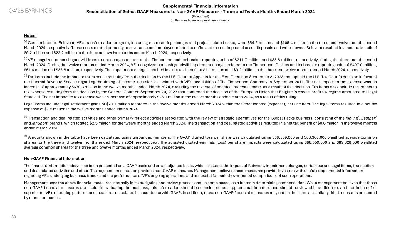 Notes: (a) Costs related to Reinvent, VF's transformation program, including restructuring charges and project-related costs, were $54.5 million and $105.4 million in the three and twelve months ended March 2024, respectively. These costs related primarily to severance and employee-related benefits and the net impact of asset disposals and write-downs. Reinvent resulted in a net tax benefit of $9.2 million and $22.2 million in the three and twelve months ended March 2024, respectively. (b) VF recognized noncash goodwill impairment charges related to the Timberland and Icebreaker reporting units of $211.7 million and $38.8 million, respectively, during the three months ended March 2024. During the twelve months ended March 2024, VF recognized noncash goodwill impairment charges related to the Timberland, Dickies and Icebreaker reporting units of $407.0 million, $61.8 million and $38.8 million, respectively. The impairment charges resulted in a net tax benefit of $1.1 million an d $9.2 million in the three and twelve months ended March 2024, respectively. (c) Tax items include the impact to tax expense resulting from the decision by the U.S. Court of Appeals for the First Circuit on September 8, 2023 that upheld the U.S. Tax Court’s decision in favor of the Internal Revenue Service regarding the timing of income inclusion associated with VF’s acquisition of The Timberland Company in September 2011. The net impact to tax expense was an increase of approximately $670.3 million in the twelve months ended March 2024, excluding the reversal of accrued interest income, as a result of this decision. Tax items also include the impact to tax expense resulting from the decision by the General Court on September 20, 2023 that confirmed the decision of the European Union that Belgium’s excess profit tax regime amounted to illegal State aid. The net impact to tax expense was an increase of approximately $26.1 million in the twelve months ended March 2024, as a result of this ruling. Legal items include legal settlement gains of $29.1 million recorded in the twelve months ended March 2024 within the Other income (expense), net line item. The legal items resulted in a net tax expense of $7.5 million in the twelve months ended March 2024. (d) Transaction and deal related activities and other primarily reflect activities associated with the review of strategic alternatives for the Global Packs business, consisting of the Kipling®, Eastpak® and JanSport® brands, which totaled $2.5 million for the twelve months ended March 2024. The transaction and deal related activities resulted in a net tax benefit of $0.6 million in the twelve months ended March 2024. (e) Amounts shown in the table have been calculated using unrounded numbers. The GAAP diluted loss per share was calculated using 388,559,000 and 388,360,000 weighted average common shares for the three and twelve months ended March 2024, respectively. The adjusted diluted earnings (loss) per share impacts were calculated using 388,559,000 and 389,328,000 weighted average common shares for the three and twelve months ended March 2024, respectively. Non-GAAP Financial Information The financial information above has been presented on a GAAP basis and on an adjusted basis, which excludes the impact of Reinvent, impairment charges, certain tax and legal items, transaction and deal related activities and other. The adjusted presentation provides non-GAAP measures. Management believes these measures provide investors with useful supplemental information regarding VF's underlying business trends and the performance of VF's ongoing operations and are useful for period-over-period comparisons of such operations. Management uses the above financial measures internally in its budgeting and review process and, in some cases, as a factor in determining compensation. While management believes that these non-GAAP financial measures are useful in evaluating the business, this information should be considered as supplemental in nature and should be viewed in addition to, and not in lieu of or superior to, VF's operating performance measures calculated in accordance with GAAP. In addition, these non-GAAP financial measures may not be the same as similarly titled measures presented by other companies. Q4’25 EARNINGS 30 Supplemental Financial Information Reconciliation of Select GAAP Measures to Non-GAAP Measures - Three and Twelve Months Ended March 2024 (Unaudited) (In thousands, except per share amounts)