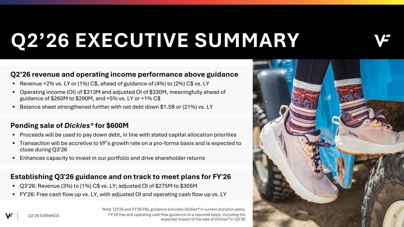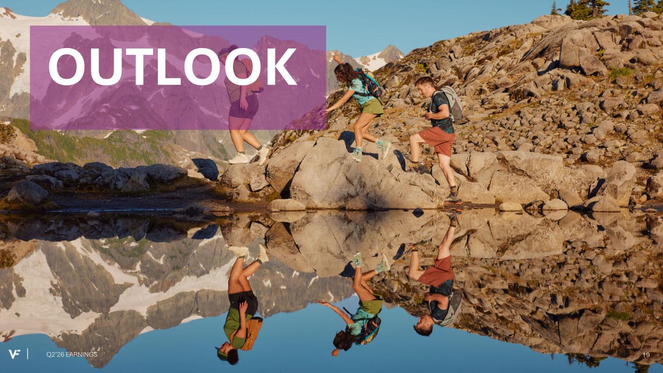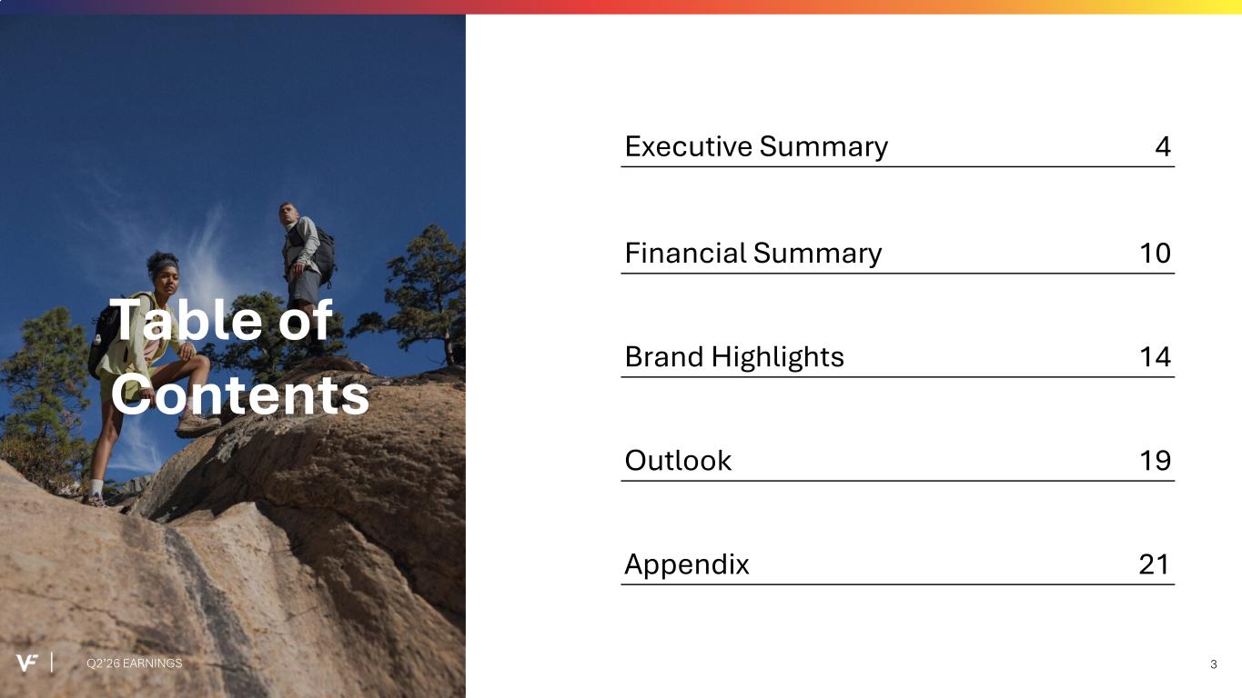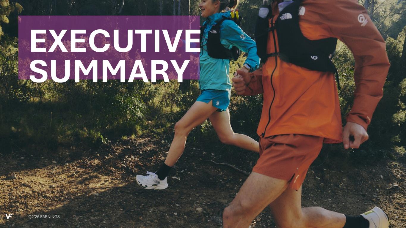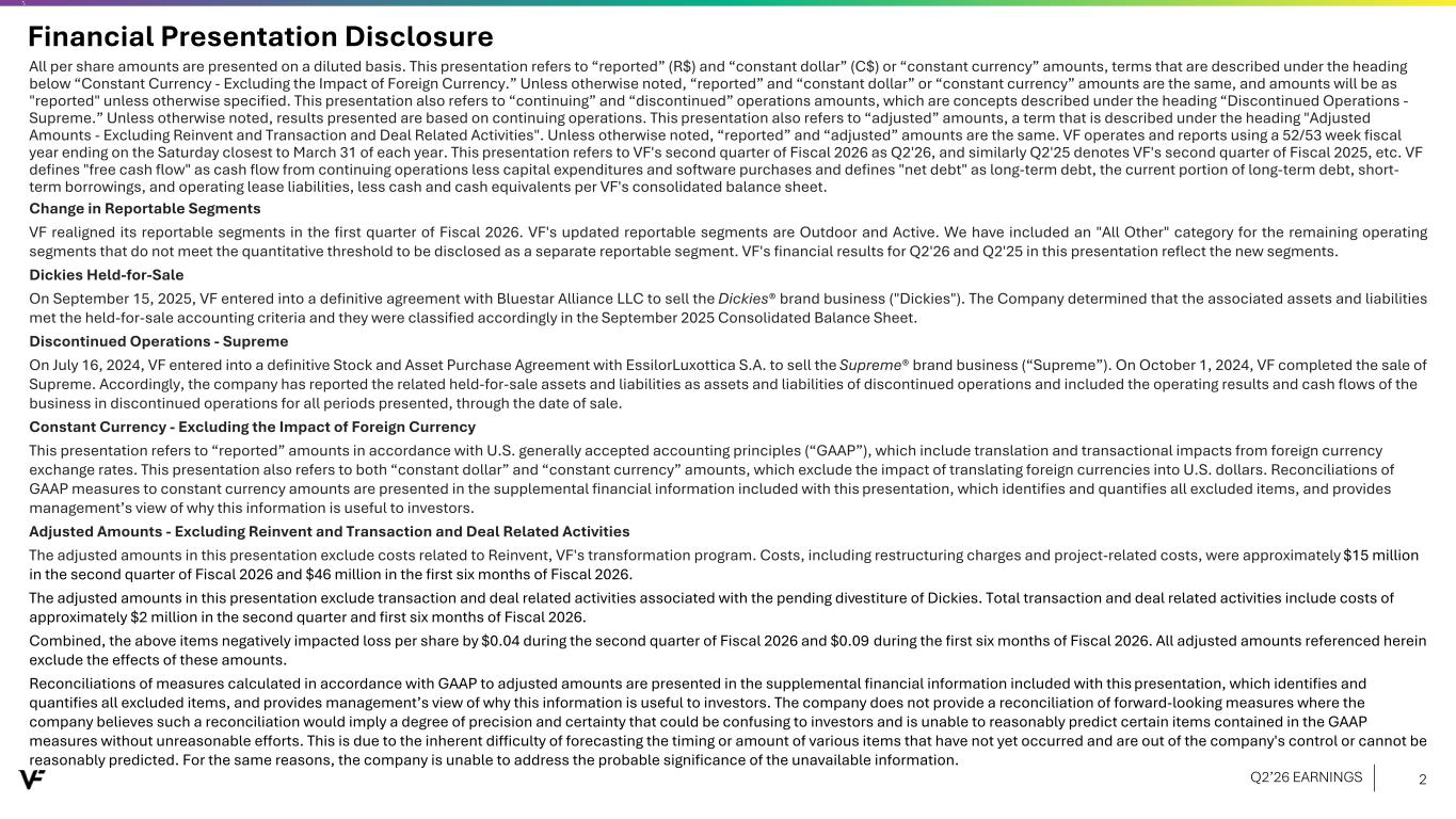 Financial Presentation Disclosure All per share amounts are presented on a diluted basis. This presentation refers to “reported” (R$) and “constant dollar” (C$) or “constant currency” amounts, terms that are described under the heading below “Constant Currency - Excluding the Impact of Foreign Currency.” Unless otherwise noted, “reported” and “constant dollar” or “constant currency” amounts are the same, and amounts will be as "reported" unless otherwise specified. This presentation also refers to “continuing” and “discontinued” operations amounts, which are concepts described under the heading “Discontinued Operations - Supreme.” Unless otherwise noted, results presented are based on continuing operations. This presentation also refers to “adjusted” amounts, a term that is described under the heading "Adjusted Amounts - Excluding Reinvent and Transaction and Deal Related Activities". Unless otherwise noted, “reported” and “adjusted” amounts are the same. VF operates and reports using a 52/53 week fiscal year ending on the Saturday closest to March 31 of each year. This presentation refers to VF's second quarter of Fiscal 2026 as Q2'26, and similarly Q2'25 denotes VF's second quarter of Fiscal 2025, etc. VF defines "free cash flow" as cash flow from continuing operations less capital expenditures and software purchases and defines "net debt" as long-term debt, the current portion of long-term debt, short- term borrowings, and operating lease liabilities, less cash and cash equivalents per VF's consolidated balance sheet. Change in Reportable Segments VF realigned its reportable segments in the first quarter of Fiscal 2026. VF's updated reportable segments are Outdoor and Active. We have included an "All Other" category for the remaining operating segments that do not meet the quantitative threshold to be disclosed as a separate reportable segment. VF's financial results for Q2'26 and Q2'25 in this presentation reflect the new segments. Dickies Held-for-Sale On September 15, 2025, VF entered into a definitive agreement with Bluestar Alliance LLC to sell the Dickies® brand business ("Dickies"). The Company determined that the associated assets and liabilities met the held-for-sale accounting criteria and they were classified accordingly in the September 2025 Consolidated Balance Sheet. Discontinued Operations - Supreme On July 16, 2024, VF entered into a definitive Stock and Asset Purchase Agreement with EssilorLuxottica S.A. to sell the Supreme® brand business (“Supreme”). On October 1, 2024, VF completed the sale of Supreme. Accordingly, the company has reported the related held-for-sale assets and liabilities as assets and liabilities of discontinued operations and included the operating results and cash flows of the business in discontinued operations for all periods presented, through the date of sale. Constant Currency - Excluding the Impact of Foreign Currency This presentation refers to “reported” amounts in accordance with U.S. generally accepted accounting principles (“GAAP”), which include translation and transactional impacts from foreign currency exchange rates. This presentation also refers to both “constant dollar” and “constant currency” amounts, which exclude the impact of translating foreign currencies into U.S. dollars. Reconciliations of GAAP measures to constant currency amounts are presented in the supplemental financial information included with this presentation, which identifies and quantifies all excluded items, and provides management’s view of why this information is useful to investors. Adjusted Amounts - Excluding Reinvent and Transaction and Deal Related Activities The adjusted amounts in this presentation exclude costs related to Reinvent, VF's transformation program. Costs, including restructuring charges and project-related costs, were approximately $15 million in the second quarter of Fiscal 2026 and $46 million in the first six months of Fiscal 2026. The adjusted amounts in this presentation exclude transaction and deal related activities associated with the pending divestiture of Dickies. Total transaction and deal related activities include costs of approximately $2 million in the second quarter and first six months of Fiscal 2026. Combined, the above items negatively impacted loss per share by $0.04 during the second quarter of Fiscal 2026 and $0.09 during the first six months of Fiscal 2026. All adjusted amounts referenced herein exclude the effects of these amounts. Reconciliations of measures calculated in accordance with GAAP to adjusted amounts are presented in the supplemental financial information included with this presentation, which identifies and quantifies all excluded items, and provides management’s view of why this information is useful to investors. The company does not provide a reconciliation of forward-looking measures where the company believes such a reconciliation would imply a degree of precision and certainty that could be confusing to investors and is unable to reasonably predict certain items contained in the GAAP measures without unreasonable efforts. This is due to the inherent difficulty of forecasting the timing or amount of various items that have not yet occurred and are out of the company's control or cannot be reasonably predicted. For the same reasons, the company is unable to address the probable significance of the unavailable information. Q2’26 EARNINGS 2