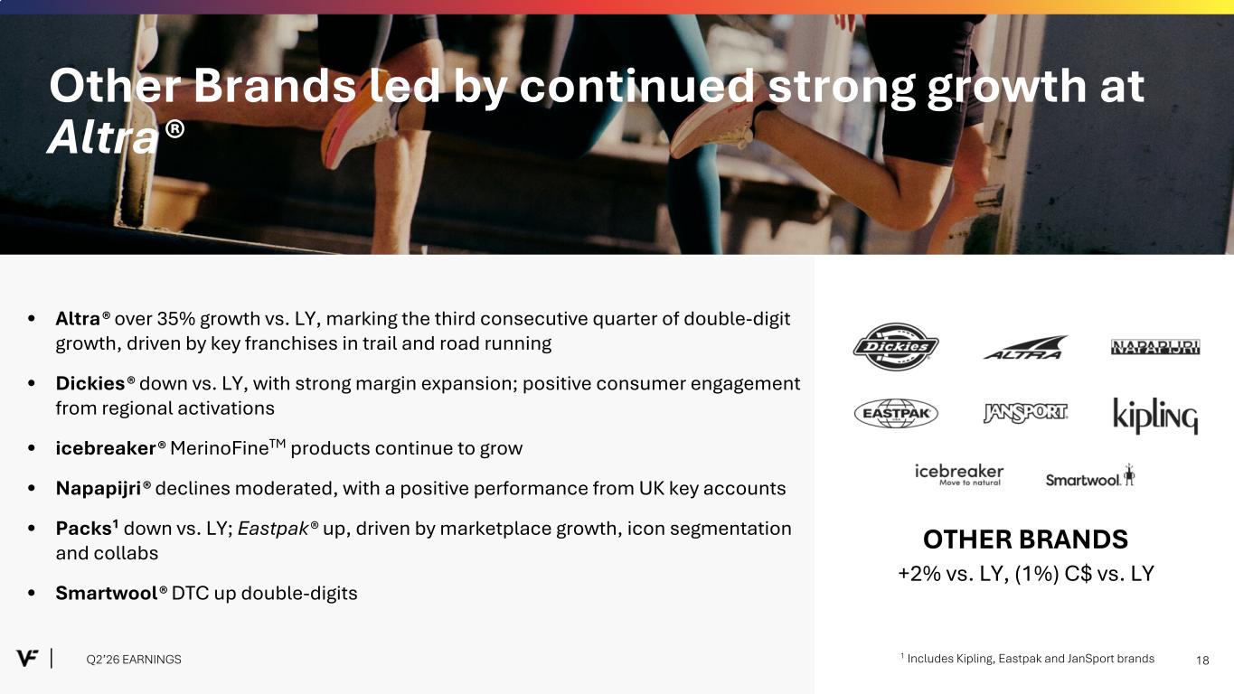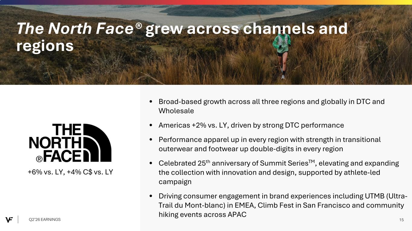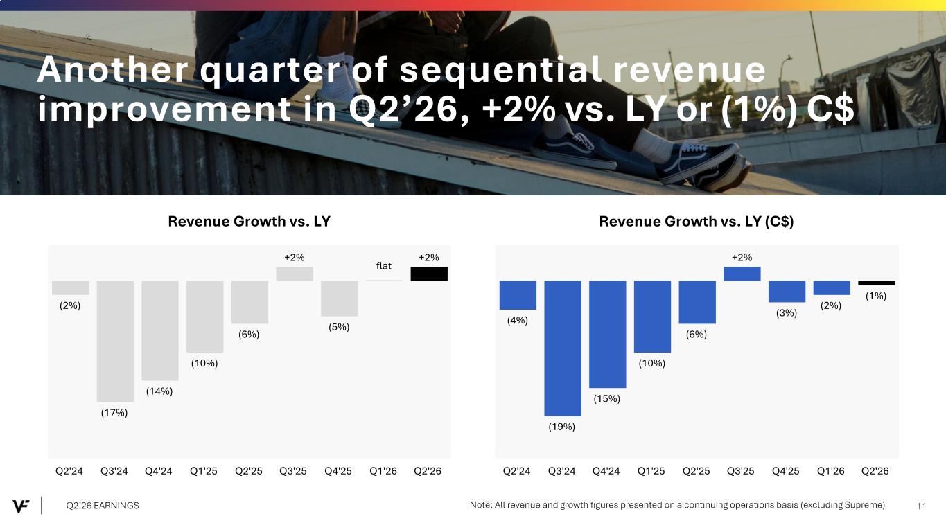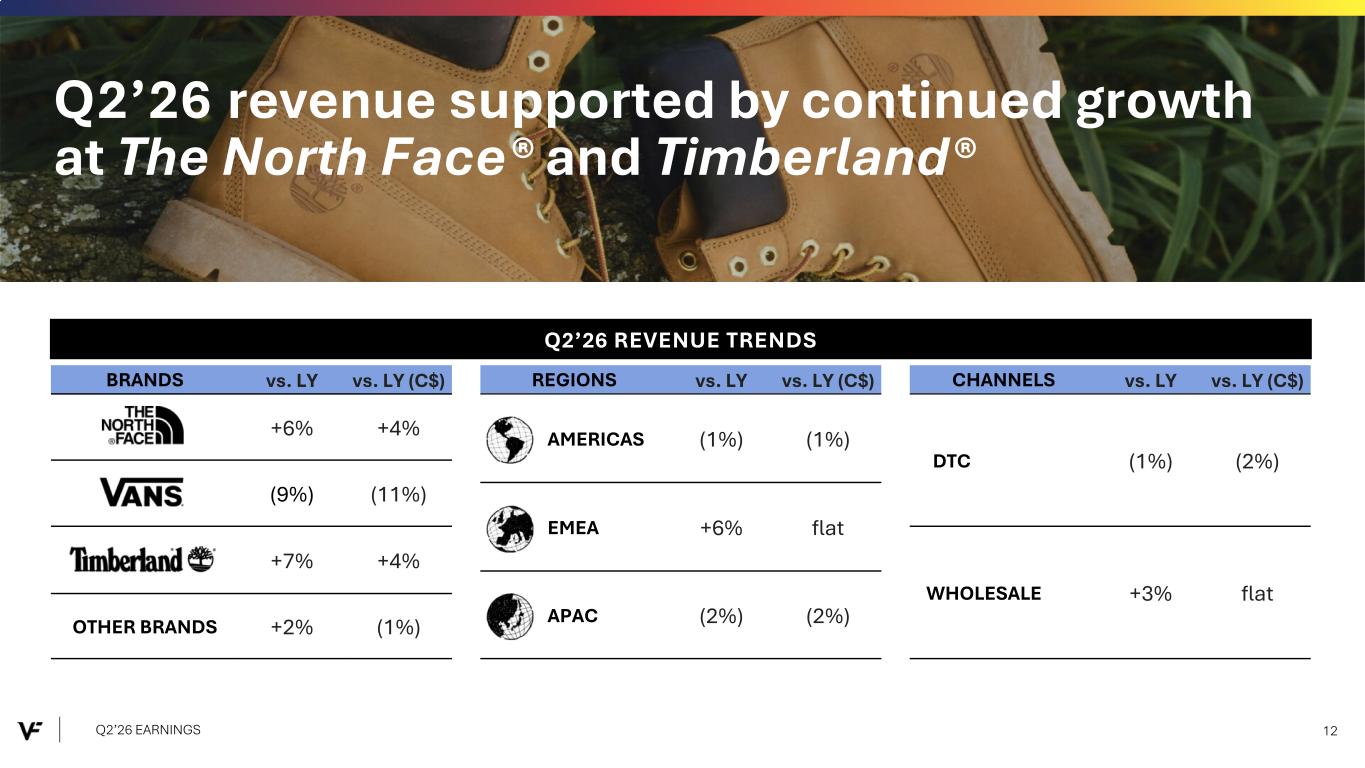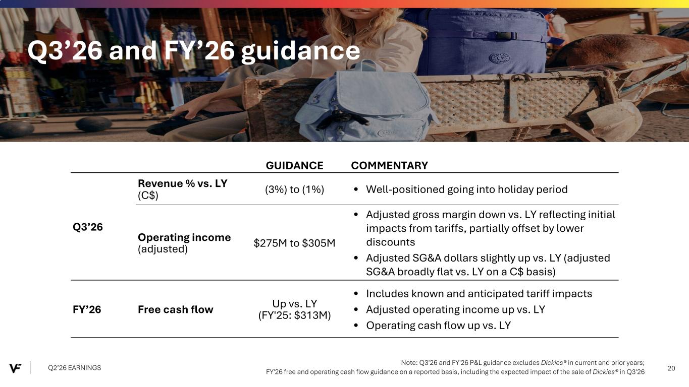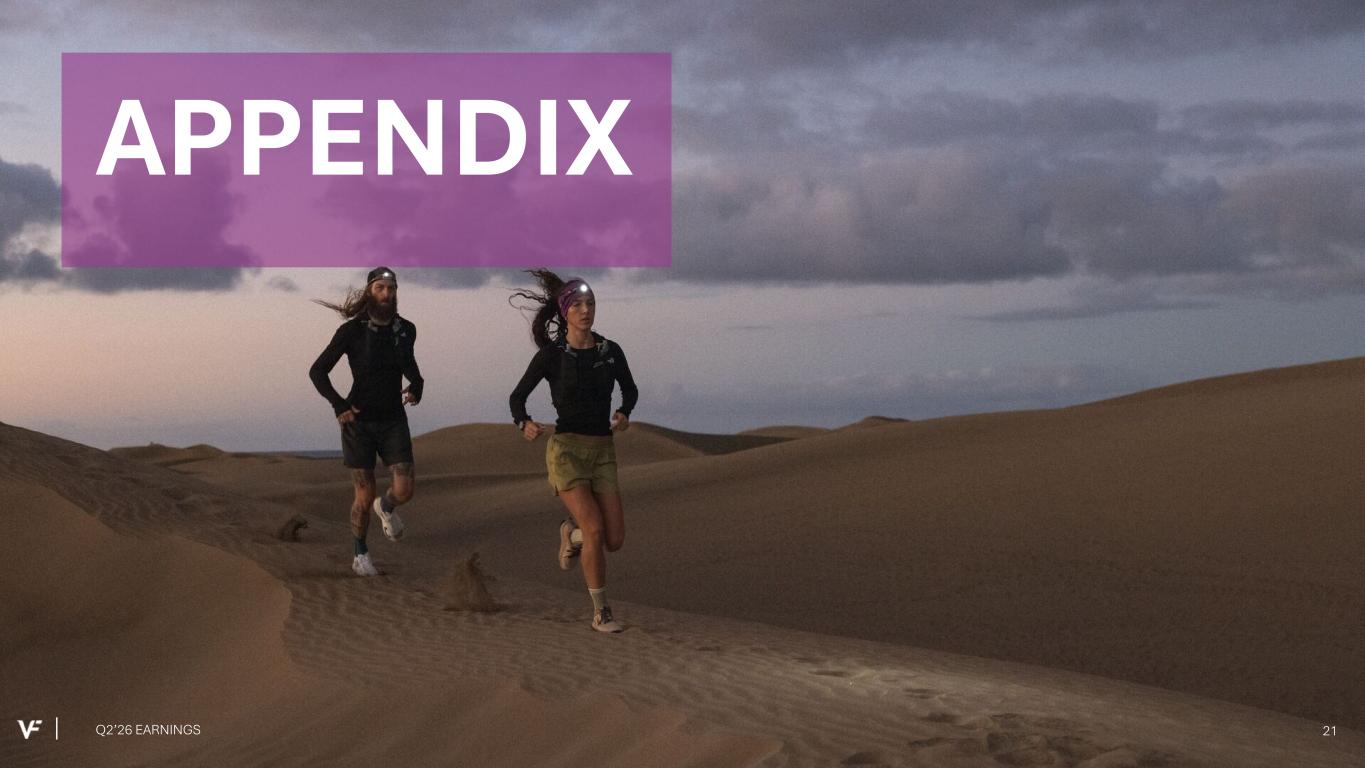 Financial Presentation Disclosure All per share amounts are presented on a diluted basis. This presentation refers to “reported” (R$) and “constant dollar” (C$) or “constant currency” amounts, terms that are described under the heading below “Constant Currency - Excluding the Impact of Foreign Currency.” Unless otherwise noted, “reported” and “constant dollar” or “constant currency” amounts are the same, and amounts will be as "reported" unless otherwise specified. This presentation also refers to “continuing” and “discontinued” operations amounts, which are concepts described under the heading “Discontinued Operations - Supreme.” Unless otherwise noted, results presented are based on continuing operations. This presentation also refers to “adjusted” amounts, a term that is described under the heading "Adjusted Amounts - Excluding Reinvent and Transaction and Deal Related Activities". Unless otherwise noted, “reported” and “adjusted” amounts are the same. VF operates and reports using a 52/53 week fiscal year ending on the Saturday closest to March 31 of each year. This presentation refers to VF's second quarter of Fiscal 2026 as Q2'26, and similarly Q2'25 denotes VF's second quarter of Fiscal 2025, etc. VF defines "free cash flow" as cash flow from continuing operations less capital expenditures and software purchases and defines "net debt" as long-term debt, the current portion of long-term debt, short- term borrowings, and operating lease liabilities, less cash and cash equivalents per VF's consolidated balance sheet. Change in Reportable Segments VF realigned its reportable segments in the first quarter of Fiscal 2026. VF's updated reportable segments are Outdoor and Active. We have included an "All Other" category for the remaining operating segments that do not meet the quantitative threshold to be disclosed as a separate reportable segment. VF's financial results for Q2'26 and Q2'25 in this presentation reflect the new segments. Dickies Held-for-Sale On September 15, 2025, VF entered into a definitive agreement with Bluestar Alliance LLC to sell the Dickies® brand business ("Dickies"). The Company determined that the associated assets and liabilities met the held-for-sale accounting criteria and they were classified accordingly in the September 2025 Consolidated Balance Sheet. Discontinued Operations - Supreme On July 16, 2024, VF entered into a definitive Stock and Asset Purchase Agreement with EssilorLuxottica S.A. to sell the Supreme® brand business (“Supreme”). On October 1, 2024, VF completed the sale of Supreme. Accordingly, the company has reported the related held-for-sale assets and liabilities as assets and liabilities of discontinued operations and included the operating results and cash flows of the business in discontinued operations for all periods presented, through the date of sale. Constant Currency - Excluding the Impact of Foreign Currency This presentation refers to “reported” amounts in accordance with U.S. generally accepted accounting principles (“GAAP”), which include translation and transactional impacts from foreign currency exchange rates. This presentation also refers to both “constant dollar” and “constant currency” amounts, which exclude the impact of translating foreign currencies into U.S. dollars. Reconciliations of GAAP measures to constant currency amounts are presented in the supplemental financial information included with this presentation, which identifies and quantifies all excluded items, and provides management’s view of why this information is useful to investors. Adjusted Amounts - Excluding Reinvent and Transaction and Deal Related Activities The adjusted amounts in this presentation exclude costs related to Reinvent, VF's transformation program. Costs, including restructuring charges and project-related costs, were approximately $15 million in the second quarter of Fiscal 2026 and $46 million in the first six months of Fiscal 2026. The adjusted amounts in this presentation exclude transaction and deal related activities associated with the pending divestiture of Dickies. Total transaction and deal related activities include costs of approximately $2 million in the second quarter and first six months of Fiscal 2026. Combined, the above items negatively impacted loss per share by $0.04 during the second quarter of Fiscal 2026 and $0.09 during the first six months of Fiscal 2026. All adjusted amounts referenced herein exclude the effects of these amounts. Reconciliations of measures calculated in accordance with GAAP to adjusted amounts are presented in the supplemental financial information included with this presentation, which identifies and quantifies all excluded items, and provides management’s view of why this information is useful to investors. The company does not provide a reconciliation of forward-looking measures where the company believes such a reconciliation would imply a degree of precision and certainty that could be confusing to investors and is unable to reasonably predict certain items contained in the GAAP measures without unreasonable efforts. This is due to the inherent difficulty of forecasting the timing or amount of various items that have not yet occurred and are out of the company's control or cannot be reasonably predicted. For the same reasons, the company is unable to address the probable significance of the unavailable information. Q2’26 EARNINGS 2