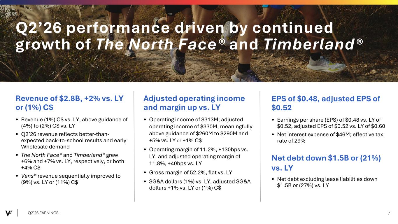 Q2’26 EARNINGS 6 Q2’26 EXECUTIVE SUMMARY Note: Q3'26 and FY'26 P&L guidance excludes Dickies® in current and prior years; FY'26 free and operating cash flow guidance on a reported basis, including the expected impact of the sale of Dickies® in Q3'26 Q2’26 revenue and operating income performance above guidance • Revenue +2% vs. LY or (1%) C$, ahead of guidance of (4%) to (2%) C$ vs. LY • Operating income (OI) of $313M and adjusted OI of $330M, meaningfully ahead of guidance of $260M to $290M, and +5% vs. LY or +1% C$ • Balance sheet strengthened further with net debt down $1.5B or (21%) vs. LY Pending sale of Dickies® for $600M • Proceeds will be used to pay down debt, in line with stated capital allocation priorities • Transaction will be accretive to VF's growth rate on a pro-forma basis and is expected to close during Q3'26 • Enhances capacity to invest in our portfolio and drive shareholder returns Establishing Q3'26 guidance and on track to meet plans for FY'26 • Q3'26: Revenue (3%) to (1%) C$ vs. LY; adjusted OI of $275M to $305M • FY'26: Free cash flow up vs. LY, with adjusted OI and operating cash flow up vs. LY