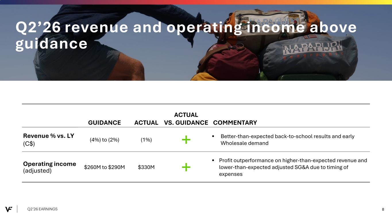 • Revenue (1%) C$ vs. LY, above guidance of (4%) to (2%) C$ vs. LY • Q2’26 revenue reflects better-than- expected back-to-school results and early Wholesale demand • The North Face® and Timberland® grew +6% and +7% vs. LY, respectively, or both +4% C$ • Vans® revenue sequentially improved to (9%) vs. LY or (11%) C$ Q2’26 EARNINGS 7 Revenue of $2.8B, +2% vs. LY or (1%) C$ Adjusted operating income and margin up vs. LY • Operating income of $313M; adjusted operating income of $330M, meaningfully above guidance of $260M to $290M and +5% vs. LY or +1% C$ • Operating margin of 11.2%, +130bps vs. LY, and adjusted operating margin of 11.8%, +40bps vs. LY • Gross margin of 52.2%, flat vs. LY • SG&A dollars (1%) vs. LY, adjusted SG&A dollars +1% vs. LY or (1%) C$ • Earnings per share (EPS) of $0.48 vs. LY of $0.52, adjusted EPS of $0.52 vs. LY of $0.60 • Net interest expense of $46M; effective tax rate of 29% Net debt down $1.5B or (21%) vs. LY • Net debt excluding lease liabilities down $1.5B or (27%) vs. LY EPS of $0.48, adjusted EPS of $0.52 Q2’26 performance driven by continued growth of The North Face® and Timberland®