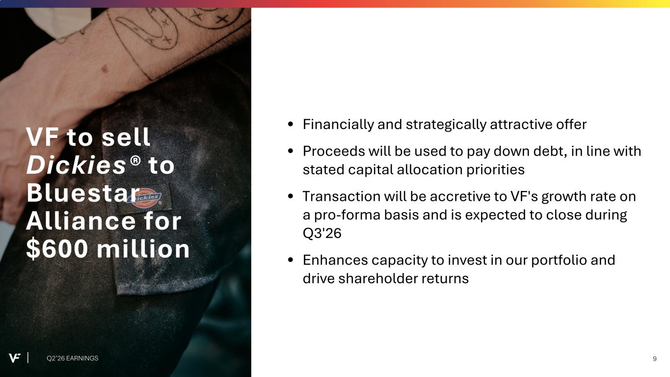 Safe Harbor Statement Certain statements included in this release are "forward-looking statements" within the meaning of the safe harbor provisions of the Private Securities Litigation Reform Act of 1995. Forward-looking statements are made based on VF’s expectations and beliefs concerning future events impacting VF and therefore involve several risks and uncertainties. Words such as “will,” “anticipate,” "believe," “estimate,” “expect,” “should,” and “may” and other words and terms of similar meaning or use of future dates may be used to identify forward-looking statements, however, the absence of these words or similar expressions does not mean that a statement is not forward-looking. All statements regarding VF’s plans, objectives, projections and expectations relating to VF’s operations or financial performance, and assumptions related thereto, are forward-looking statements. Forward-looking statements are not guarantees, and actual results could differ materially from those expressed or implied in the forward-looking statements. VF undertakes no obligation to publicly update or revise any forward-looking statements, whether as a result of new information, future events or otherwise, except as required by law. Potential risks and uncertainties that could cause the actual results of operations or financial condition of VF to differ materially from those expressed or implied by forward-looking statements include, but are not limited to: the level of consumer demand for apparel, footwear and accessories; disruption to VF’s distribution system; changes in global economic conditions and the financial strength of VF’s consumers and customers, including as a result of current inflationary pressures; fluctuations in the price, availability and quality of raw materials and finished products, including as a result of tariffs; disruption and volatility in the global capital and credit markets; VF’s response to changing fashion trends, evolving consumer preferences and changing patterns of consumer behavior; VF's ability to maintain the image, health and equity of its brands, including through investment in brand building and product innovation; intense competition from online retailers and other direct-to- consumer business risks; increasing pressure on margins; retail industry changes and challenges; VF's ability to execute its Reinvent transformation program, "The VF Way" and other business priorities, including measures to streamline and right-size its cost base and strengthen the balance sheet while reducing leverage; VF’s ability to successfully establish a global commercial organization, and identify and capture efficiencies in its business model; any inability of VF or third parties on which it relies, to maintain the strength and security of information technology systems; the fact that VF’s facilities and systems, and those of third parties on which it relies, are frequent targets of cyberattacks of varying levels of severity, and may in the future be vulnerable to such attacks, and any inability or failure by VF or such third parties to anticipate or detect data or information security breaches or other cyberattacks, could result in data or financial loss, reputational harm, business disruption, damage to VF’s relationships with customers, consumers, employees and third parties on which it relies, litigation, regulatory investigations, enforcement actions or other negative impacts; any inability by VF or third parties on which it relies to properly collect, use, manage and secure business, consumer and employee data and comply with privacy and security regulations; VF’s ability to adopt new technologies, including artificial intelligence, in a competitive and responsible manner; foreign currency fluctuations; stability of VF's vendors' manufacturing facilities and VF's ability to establish and maintain effective supply chain capabilities; continued use by VF’s suppliers of ethical business practices; VF’s ability to accurately forecast demand for products; actions of activist and other shareholders; VF's ability to recruit, develop or retain key executive or employee talent or successfully transition executives; continuity of members of VF’s management; changes in the availability and cost of labor; VF’s ability to protect trademarks and other intellectual property rights; possible goodwill and other asset impairment; maintenance by VF’s licensees and distributors of the value of VF’s brands; VF’s ability to execute acquisitions and dispositions, integrate acquisitions and manage its brand portfolio, including the proposed sale of the Dickies® brand; whether and when the required regulatory approvals for the proposed sale of the Dickies® brand will be obtained, whether and when the closing conditions will be satisfied and whether and when the proposed sale of the Dickies® brand will close, if at all; VF’s ability to execute, and realize benefits, successfully, or at all, from the proposed sale of the Dickies® brand; business resiliency in response to natural or man-made economic, public health, cyber, political or environmental disruptions, including any potential effects from changes in tariffs and international trade policy, and the U.S. federal government shutdown; changes in tax laws and additional tax liabilities; legal, regulatory, political, economic, and geopolitical risks, including those related to the current conflicts in Europe, the Middle East and Asia and tensions between the U.S. and China; changes to laws and regulations; adverse or unexpected weather conditions, including any potential effects from climate change; VF's indebtedness and its ability to obtain financing on favorable terms, if needed, could prevent VF from fulfilling its financial obligations; VF's ability to pay and declare dividends or repurchase its stock in the future; climate change and increased focus on environmental, social and govern