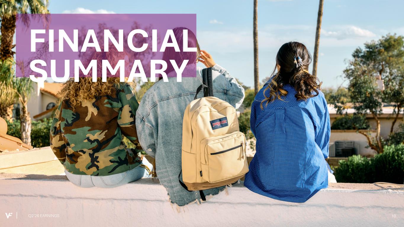 VF to sell Dickies® to Bluestar Alliance for $600 million Q2’26 EARNINGS 9 • Financially and strategically attractive offer • Proceeds will be used to pay down debt, in line with stated capital allocation priorities • Transaction will be accretive to VF's growth rate on a pro-forma basis and is expected to close during Q3'26 • Enhances capacity to invest in our portfolio and drive shareholder returns