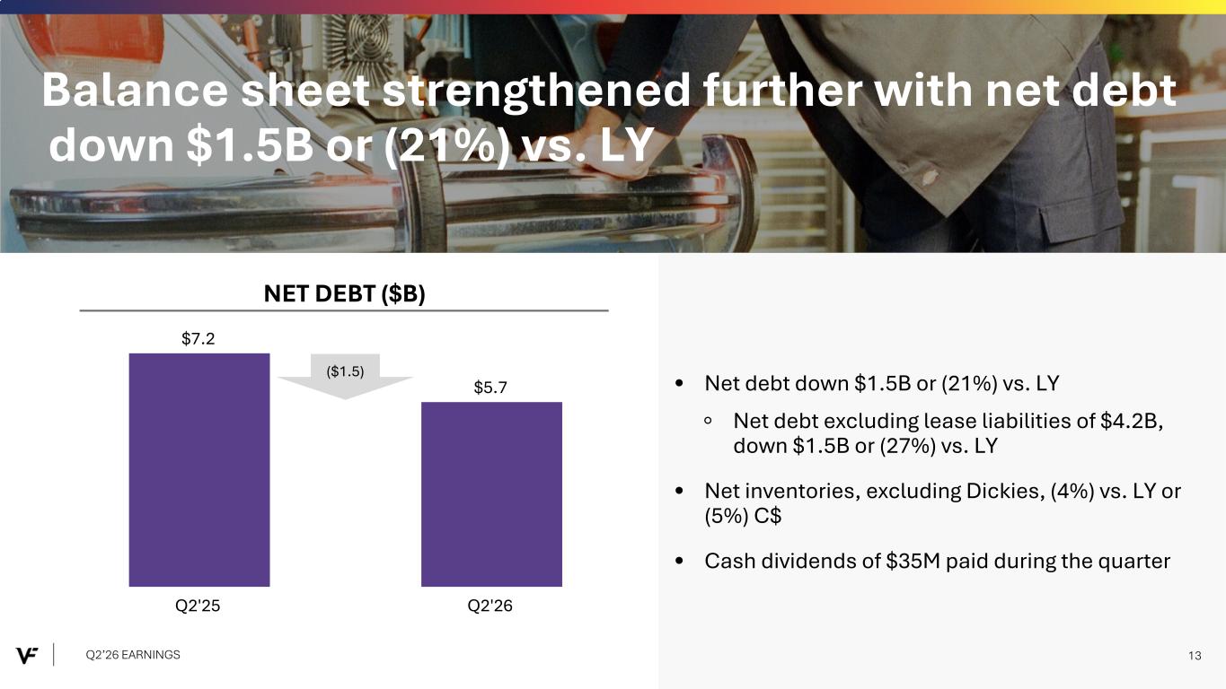 REGIONS vs. LY vs. LY (C$) AMERICAS (1%) (1%) EMEA +6% flat APAC (2%) (2%) BRANDS vs. LY vs. LY (C$) +6% +4% (9%) (11%) +7% +4% OTHER BRANDS +2% (1%) CHANNELS vs. LY vs. LY (C$) DTC (1%) (2%) WHOLESALE +3% flat Q2’26 REVENUE TRENDS Q2’26 EARNINGS 12 Q2’26 revenue supported by continued growth at The North Face® and Timberland®