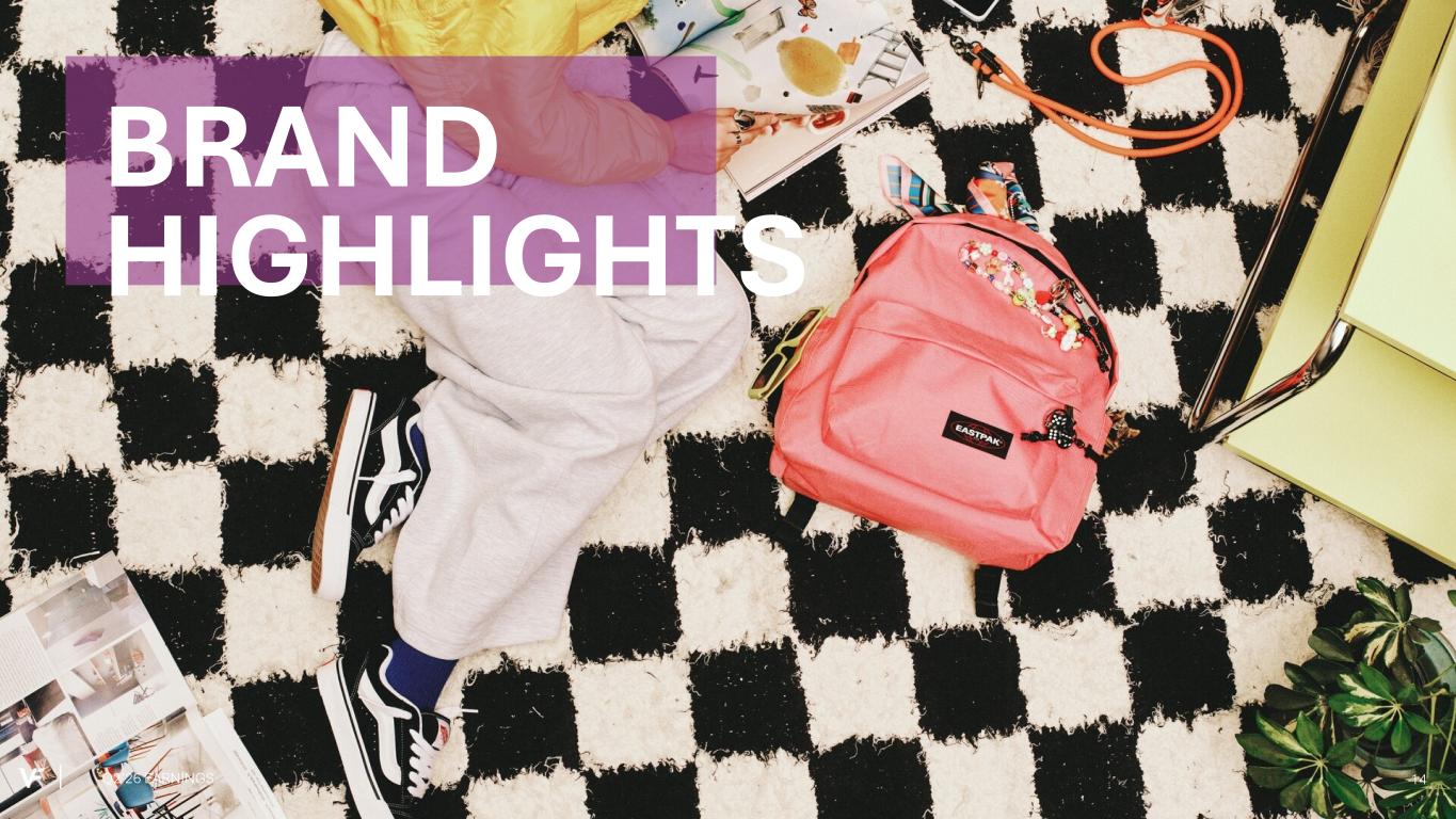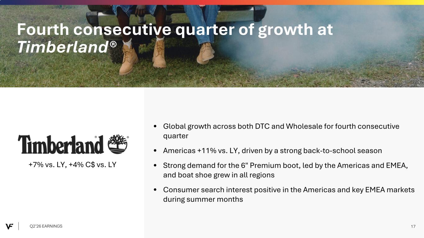 • Revenue sequentially improved, as product newness draws in new consumers ◦ Non-icons up, led by Super Lowpro, Crosspath and Loafers ◦ Authentic and Women's styles of the Old SkoolTM up • Improving digital traffic trends in the Americas and EMEA, particularly during peak consumer moments • Announced multi-year partnership with SZA as Vans' first-ever Artistic Director Vans® Q2’26 performance above expectations, supported by strong back-to-school season Q2’26 EARNINGS 16 (9%) vs. LY, (11%) C$ vs. LY Product newness attracting new consumers at Vans®