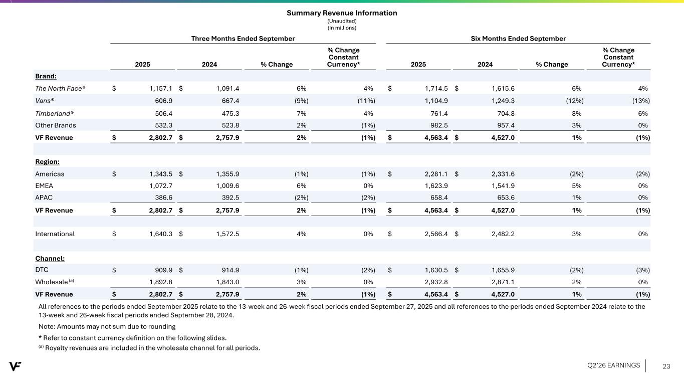 Three Months Ended September Six Months Ended September 2025 2024 % Change % Change Constant Currency* 2025 2024 % Change % Change Constant Currency* Brand: The North Face® $ 1,157.1 $ 1,091.4 6% 4% $ 1,714.5 $ 1,615.6 6% 4% Vans® 606.9 667.4 (9%) (11%) 1,104.9 1,249.3 (12%) (13%) Timberland® 506.4 475.3 7% 4% 761.4 704.8 8% 6% Other Brands 532.3 523.8 2% (1%) 982.5 957.4 3% 0% VF Revenue $ 2,802.7 $ 2,757.9 2% (1%) $ 4,563.4 $ 4,527.0 1% (1%) Region: Americas $ 1,343.5 $ 1,355.9 (1%) (1%) $ 2,281.1 $ 2,331.6 (2%) (2%) EMEA 1,072.7 1,009.6 6% 0% 1,623.9 1,541.9 5% 0% APAC 386.6 392.5 (2%) (2%) 658.4 653.6 1% 0% VF Revenue $ 2,802.7 $ 2,757.9 2% (1%) $ 4,563.4 $ 4,527.0 1% (1%) International $ 1,640.3 $ 1,572.5 4% 0% $ 2,566.4 $ 2,482.2 3% 0% Channel: DTC $ 909.9 $ 914.9 (1%) (2%) $ 1,630.5 $ 1,655.9 (2%) (3%) Wholesale (a) 1,892.8 1,843.0 3% 0% 2,932.8 2,871.1 2% 0% VF Revenue $ 2,802.7 $ 2,757.9 2% (1%) $ 4,563.4 $ 4,527.0 1% (1%) Summary Revenue Information (Unaudited) (In millions) All references to the periods ended September 2025 relate to the 13-week and 26-week fiscal periods ended September 27, 2025 and all references to the periods ended September 2024 relate to the 13-week and 26-week fiscal periods ended September 28, 2024. Note: Amounts may not sum due to rounding * Refer to constant currency definition on the following slides. (a) Royalty revenues are included in the wholesale channel for all periods. Q2’26 EARNINGS 23