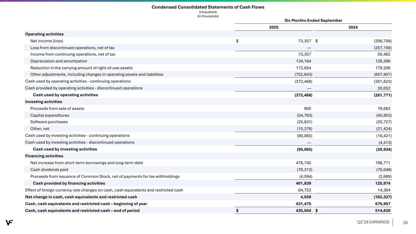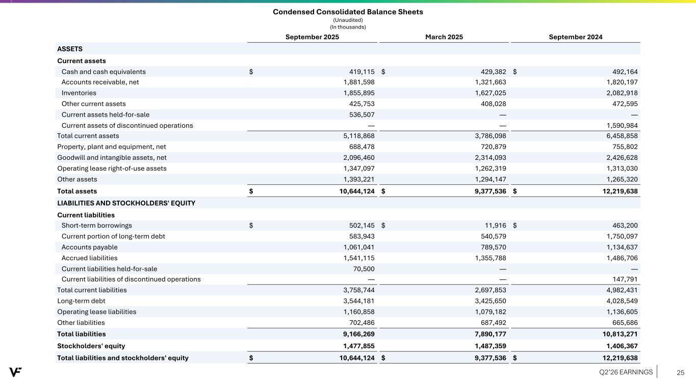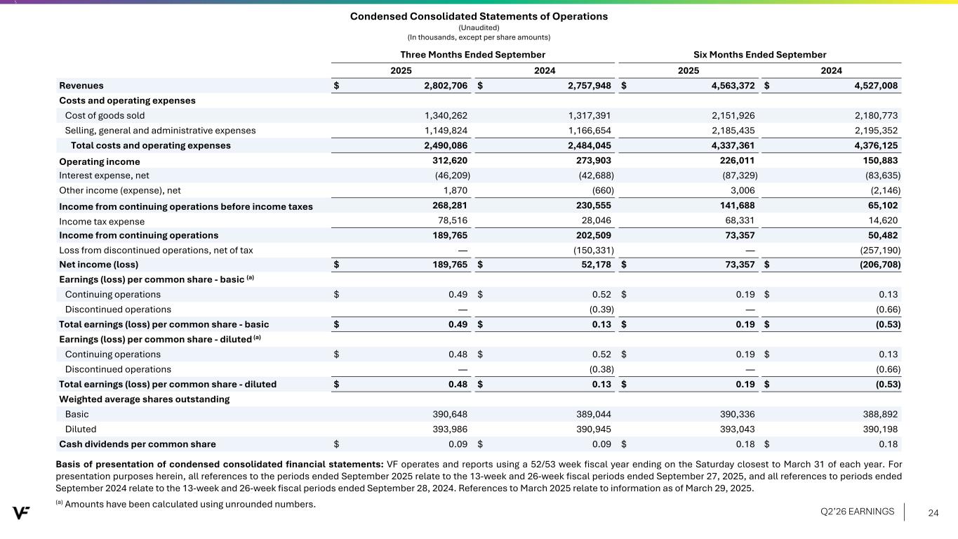 Three Months Ended September Six Months Ended September 2025 2024 2025 2024 Revenues $ 2,802,706 $ 2,757,948 $ 4,563,372 $ 4,527,008 Costs and operating expenses Cost of goods sold 1,340,262 1,317,391 2,151,926 2,180,773 Selling, general and administrative expenses 1,149,824 1,166,654 2,185,435 2,195,352 Total costs and operating expenses 2,490,086 2,484,045 4,337,361 4,376,125 Operating income 312,620 273,903 226,011 150,883 Interest expense, net (46,209) (42,688) (87,329) (83,635) Other income (expense), net 1,870 (660) 3,006 (2,146) Income from continuing operations before income taxes 268,281 230,555 141,688 65,102 Income tax expense 78,516 28,046 68,331 14,620 Income from continuing operations 189,765 202,509 73,357 50,482 Loss from discontinued operations, net of tax — (150,331) — (257,190) Net income (loss) $ 189,765 $ 52,178 $ 73,357 $ (206,708) Earnings (loss) per common share - basic (a) Continuing operations $ 0.49 $ 0.52 $ 0.19 $ 0.13 Discontinued operations — (0.39) — (0.66) Total earnings (loss) per common share - basic $ 0.49 $ 0.13 $ 0.19 $ (0.53) Earnings (loss) per common share - diluted (a) Continuing operations $ 0.48 $ 0.52 $ 0.19 $ 0.13 Discontinued operations — (0.38) — (0.66) Total earnings (loss) per common share - diluted $ 0.48 $ 0.13 $ 0.19 $ (0.53) Weighted average shares outstanding Basic 390,648 389,044 390,336 388,892 Diluted 393,986 390,945 393,043 390,198 Cash dividends per common share $ 0.09 $ 0.09 $ 0.18 $ 0.18 Condensed Consolidated Statements of Operations (Unaudited) (In thousands, except per share amounts) Basis of presentation of condensed consolidated financial statements: VF operates and reports using a 52/53 week fiscal year ending on the Saturday closest to March 31 of each year. For presentation purposes herein, all references to the periods ended September 2025 relate to the 13-week and 26-week fiscal periods ended September 27, 2025, and all references to periods ended September 2024 relate to the 13-week and 26-week fiscal periods ended September 28, 2024. References to March 2025 relate to information as of March 29, 2025. (a) Amounts have been calculated using unrounded numbers. Q2’26 EARNINGS 24