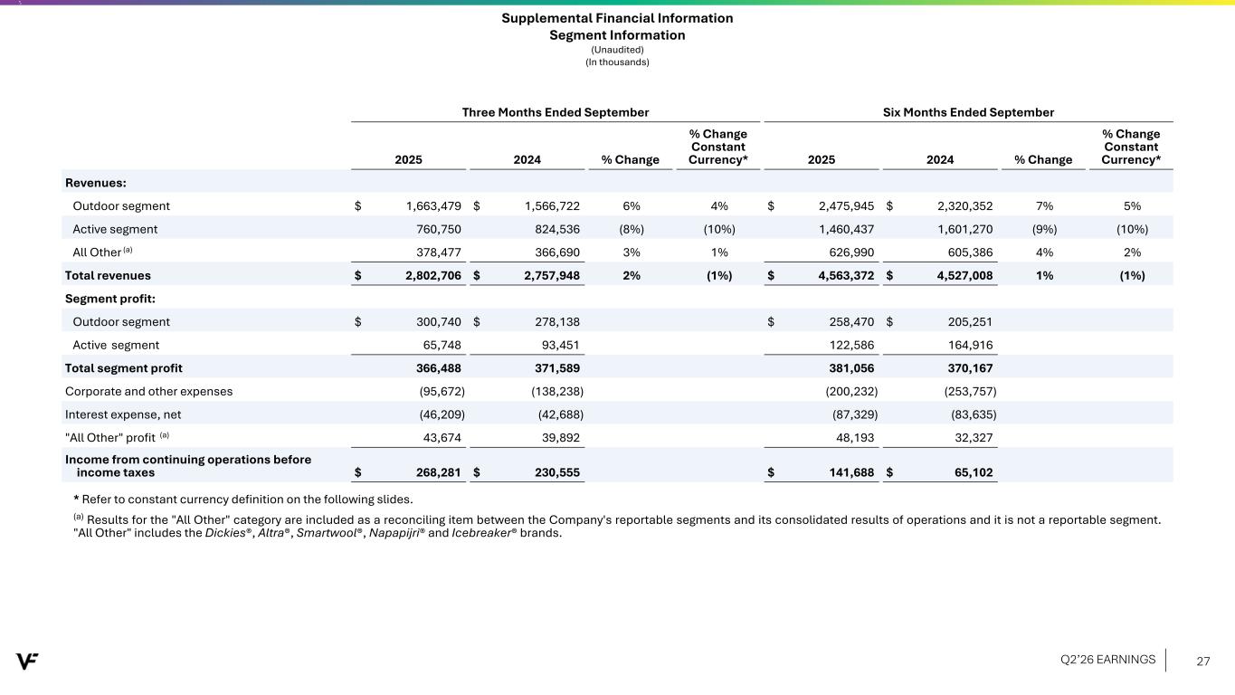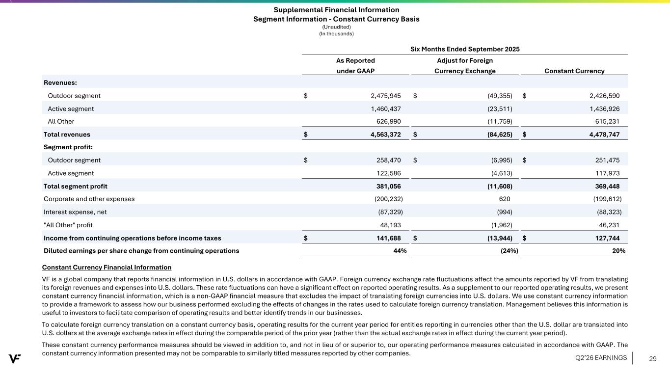 Supplemental Financial Information Segment Information - Constant Currency Basis (Unaudited) (In thousands) Three Months Ended September 2025 As Reported Adjust for Foreign under GAAP Currency Exchange Constant Currency Revenues: Outdoor segment $ 1,663,479 $ (37,330) $ 1,626,149 Active segment 760,750 (16,242) 744,508 All Other 378,477 (8,172) 370,305 Total revenues $ 2,802,706 $ (61,744) $ 2,740,962 Segment profit: Outdoor segment $ 300,740 $ (7,724) $ 293,016 Active segment 65,748 (3,057) 62,691 Total segment profit 366,488 (10,781) 355,707 Corporate and other expenses (95,672) 265 (95,407) Interest expense, net (46,209) (580) (46,789) "All Other" profit 43,674 (1,607) 42,067 Income from continuing operations before income taxes $ 268,281 $ (12,703) $ 255,578 Diluted earnings per share change from continuing operations (7%) (5%) (12%) Constant Currency Financial Information VF is a global company that reports financial information in U.S. dollars in accordance with GAAP. Foreign currency exchange rate fluctuations affect the amounts reported by VF from translating its foreign revenues and expenses into U.S. dollars. These rate fluctuations can have a significant effect on reported operating results. As a supplement to our reported operating results, we present constant currency financial information, which is a non-GAAP financial measure that excludes the impact of translating foreign currencies into U.S. dollars. We use constant currency information to provide a framework to assess how our business performed excluding the effects of changes in the rates used to calculate foreign currency translation. Management believes this information is useful to investors to facilitate comparison of operating results and better identify trends in our businesses. To calculate foreign currency translation on a constant currency basis, operating results for the current year period for entities reporting in currencies other than the U.S. dollar are translated into U.S. dollars at the average exchange rates in effect during the comparable period of the prior year (rather than the actual exchange rates in effect during the current year period). These constant currency performance measures should be viewed in addition to, and not in lieu of or superior to, our operating performance measures calculated in accordance with GAAP. The constant currency information presented may not be comparable to similarly titled measures reported by other companies. Q2’26 EARNINGS 28