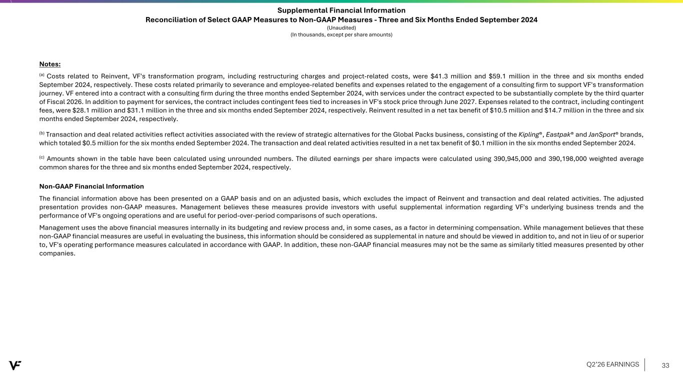Supplemental Financial Information Reconciliation of Select GAAP Measures to Non-GAAP Measures - Three and Six Months Ended September 2024 (Unaudited) (In thousands, except per share amounts) Notes: (a) Costs related to Reinvent, VF's transformation program, including restructuring charges and project-related costs, were $41.3 million and $59.1 million in the three and six months ended September 2024, respectively. These costs related primarily to severance and employee-related benefits and expenses related to the engagement of a consulting firm to support VF's transformation journey. VF entered into a contract with a consulting firm during the three months ended September 2024, with services under the contract expected to be substantially complete by the third quarter of Fiscal 2026. In addition to payment for services, the contract includes contingent fees tied to increases in VF's stock price through June 2027. Expenses related to the contract, including contingent fees, were $28.1 million and $31.1 million in the three and six months ended September 2024, respectively. Reinvent resulted in a net tax benefit of $10.5 million and $14.7 million in the three and six months ended September 2024, respectively. (b) Transaction and deal related activities reflect activities associated with the review of strategic alternatives for the Global Packs business, consisting of the Kipling®, Eastpak® and JanSport® brands, which totaled $0.5 million for the six months ended September 2024. The transaction and deal related activities resulted in a net tax benefit of $0.1 million in the six months ended September 2024. (c) Amounts shown in the table have been calculated using unrounded numbers. The diluted earnings per share impacts were calculated using 390,945,000 and 390,198,000 weighted average common shares for the three and six months ended September 2024, respectively. Non-GAAP Financial Information The financial information above has been presented on a GAAP basis and on an adjusted basis, which excludes the impact of Reinvent and transaction and deal related activities. The adjusted presentation provides non-GAAP measures. Management believes these measures provide investors with useful supplemental information regarding VF's underlying business trends and the performance of VF's ongoing operations and are useful for period-over-period comparisons of such operations. Management uses the above financial measures internally in its budgeting and review process and, in some cases, as a factor in determining compensation. While management believes that these non-GAAP financial measures are useful in evaluating the business, this information should be considered as supplemental in nature and should be viewed in addition to, and not in lieu of or superior to, VF's operating performance measures calculated in accordance with GAAP. In addition, these non-GAAP financial measures may not be the same as similarly titled measures presented by other companies. Q2’26 EARNINGS 33