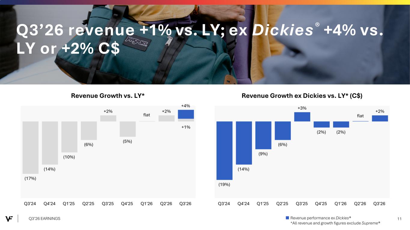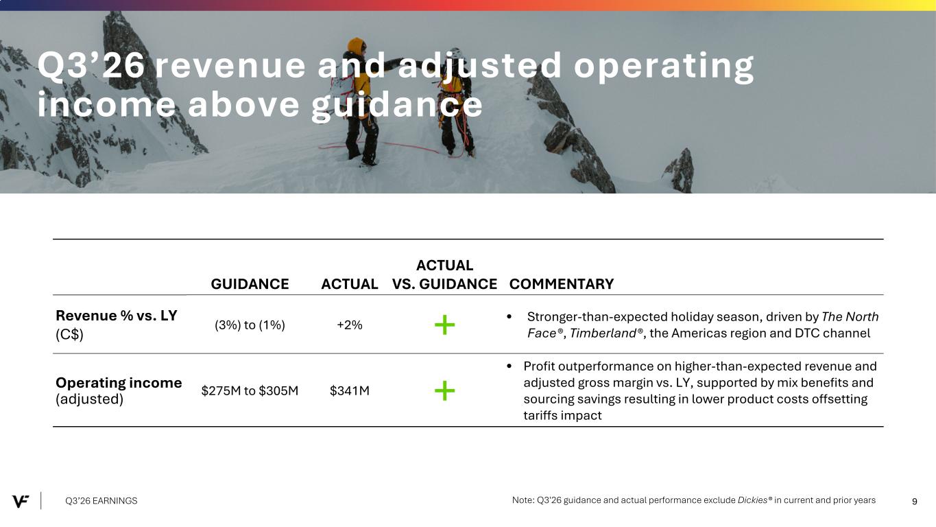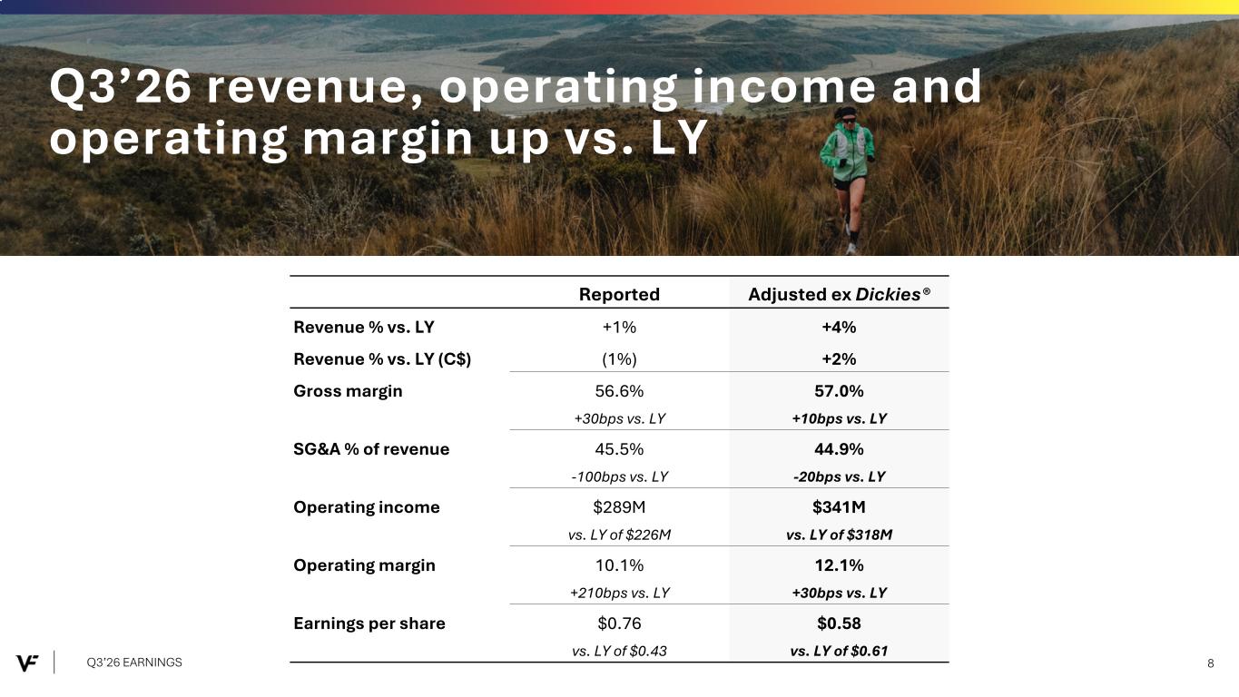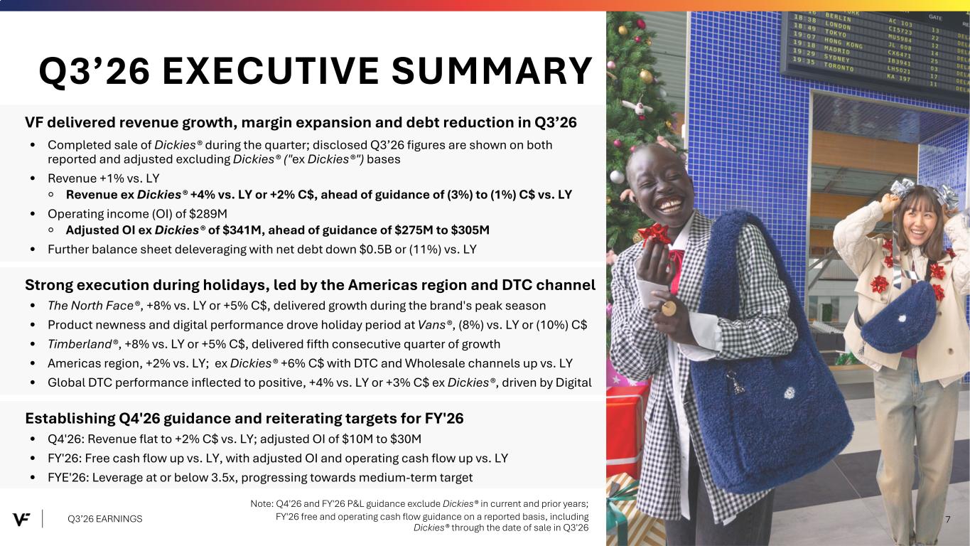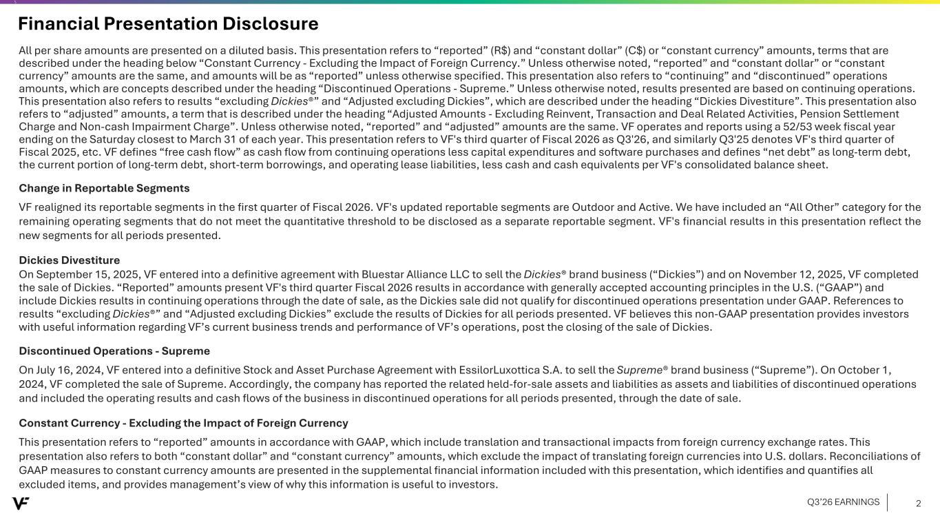 Financial Presentation Disclosure All per share amounts are presented on a diluted basis. This presentation refers to “reported” (R$) and “constant dollar” (C$) or “constant currency” amounts, terms that are described under the heading below “Constant Currency - Excluding the Impact of Foreign Currency.” Unless otherwise noted, “reported” and “constant dollar” or “constant currency” amounts are the same, and amounts will be as “reported” unless otherwise specified. This presentation also refers to “continuing” and “discontinued” operations amounts, which are concepts described under the heading “Discontinued Operations - Supreme.” Unless otherwise noted, results presented are based on continuing operations. This presentation also refers to results “excluding Dickies®” and “Adjusted excluding Dickies”, which are described under the heading “Dickies Divestiture”. This presentation also refers to “adjusted” amounts, a term that is described under the heading “Adjusted Amounts - Excluding Reinvent, Transaction and Deal Related Activities, Pension Settlement Charge and Non-cash Impairment Charge”. Unless otherwise noted, “reported” and “adjusted” amounts are the same. VF operates and reports using a 52/53 week fiscal year ending on the Saturday closest to March 31 of each year. This presentation refers to VF's third quarter of Fiscal 2026 as Q3'26, and similarly Q3'25 denotes VF's third quarter of Fiscal 2025, etc. VF defines “free cash flow” as cash flow from continuing operations less capital expenditures and software purchases and defines “net debt” as long-term debt, the current portion of long-term debt, short-term borrowings, and operating lease liabilities, less cash and cash equivalents per VF's consolidated balance sheet. Change in Reportable Segments VF realigned its reportable segments in the first quarter of Fiscal 2026. VF's updated reportable segments are Outdoor and Active. We have included an “All Other” category for the remaining operating segments that do not meet the quantitative threshold to be disclosed as a separate reportable segment. VF's financial results in this presentation reflect the new segments for all periods presented. Dickies Divestiture On September 15, 2025, VF entered into a definitive agreement with Bluestar Alliance LLC to sell the Dickies® brand business (“Dickies”) and on November 12, 2025, VF completed the sale of Dickies. “Reported” amounts present VF's third quarter Fiscal 2026 results in accordance with generally accepted accounting principles in the U.S. (“GAAP”) and include Dickies results in continuing operations through the date of sale, as the Dickies sale did not qualify for discontinued operations presentation under GAAP. References to results “excluding Dickies®” and “Adjusted excluding Dickies” exclude the results of Dickies for all periods presented. VF believes this non-GAAP presentation provides investors with useful information regarding VF’s current business trends and performance of VF’s operations, post the closing of the sale of Dickies. Discontinued Operations - Supreme On July 16, 2024, VF entered into a definitive Stock and Asset Purchase Agreement with EssilorLuxottica S.A. to sell the Supreme® brand business (“Supreme”). On October 1, 2024, VF completed the sale of Supreme. Accordingly, the company has reported the related held-for-sale assets and liabilities as assets and liabilities of discontinued operations and included the operating results and cash flows of the business in discontinued operations for all periods presented, through the date of sale. Constant Currency - Excluding the Impact of Foreign Currency This presentation refers to “reported” amounts in accordance with GAAP, which include translation and transactional impacts from foreign currency exchange rates. This presentation also refers to both “constant dollar” and “constant currency” amounts, which exclude the impact of translating foreign currencies into U.S. dollars. Reconciliations of GAAP measures to constant currency amounts are presented in the supplemental financial information included with this presentation, which identifies and quantifies all excluded items, and provides management’s view of why this information is useful to investors. Q3’26 EARNINGS 2