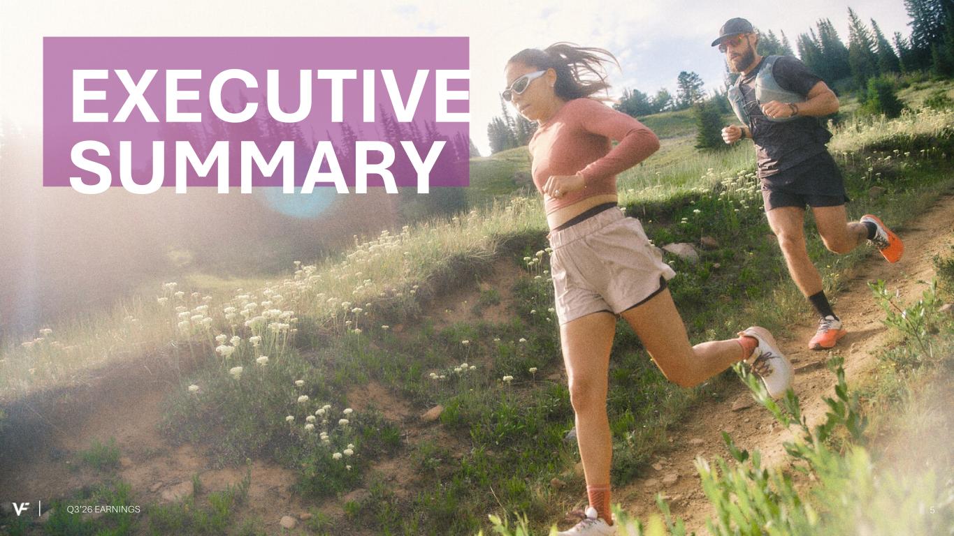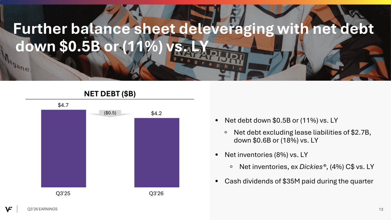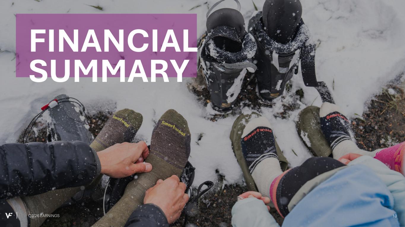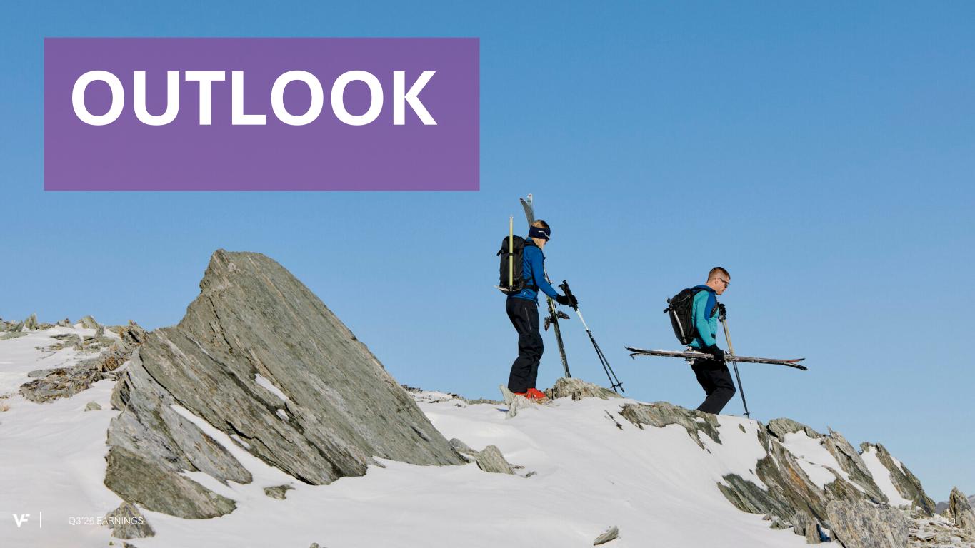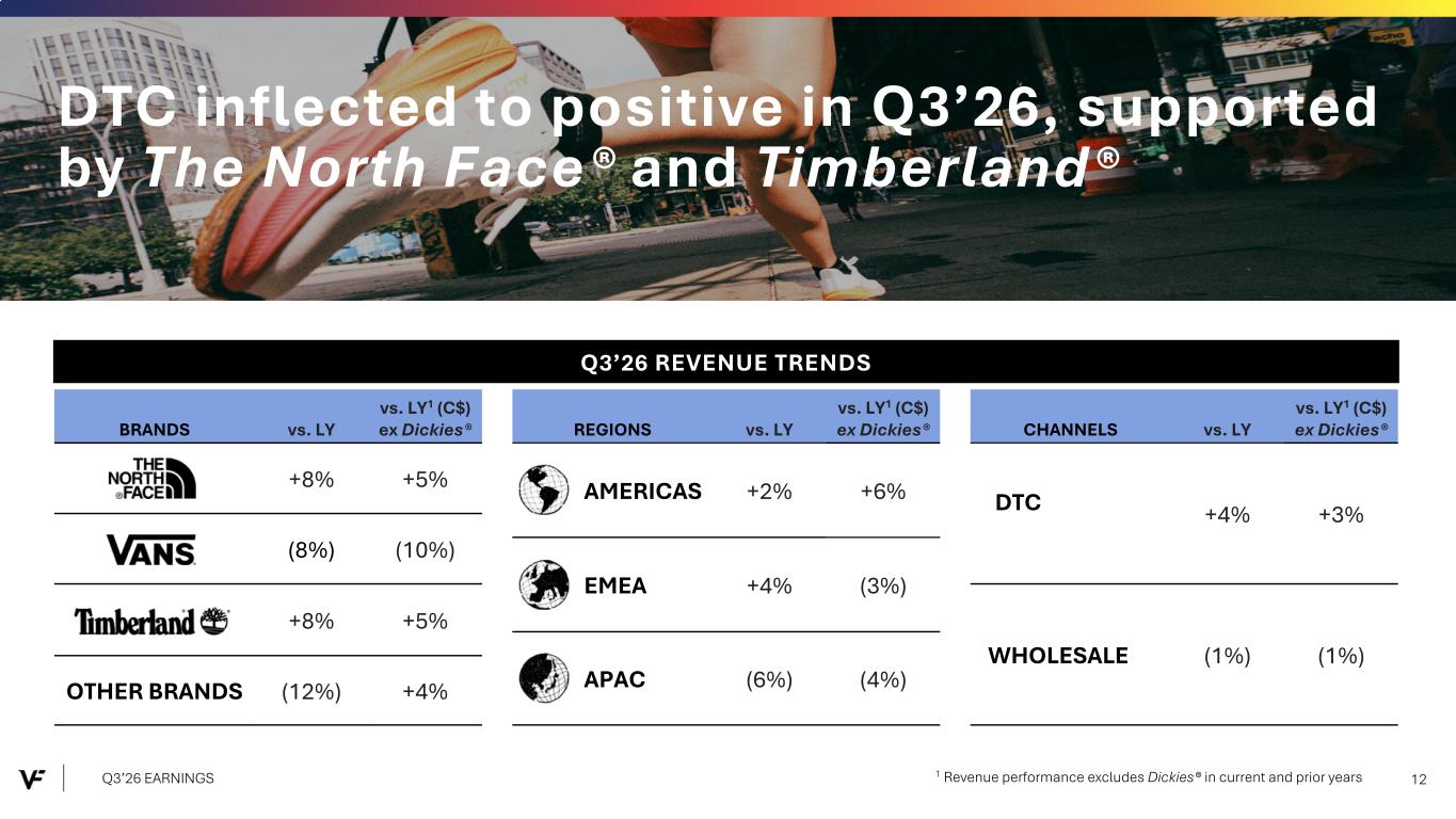Financial Presentation Disclosure All per share amounts are presented on a diluted basis. This presentation refers to “reported” (R$) and “constant dollar” (C$) or “constant currency” amounts, terms that are described under the heading below “Constant Currency - Excluding the Impact of Foreign Currency.” Unless otherwise noted, “reported” and “constant dollar” or “constant currency” amounts are the same, and amounts will be as “reported” unless otherwise specified. This presentation also refers to “continuing” and “discontinued” operations amounts, which are concepts described under the heading “Discontinued Operations - Supreme.” Unless otherwise noted, results presented are based on continuing operations. This presentation also refers to results “excluding Dickies®” and “Adjusted excluding Dickies”, which are described under the heading “Dickies Divestiture”. This presentation also refers to “adjusted” amounts, a term that is described under the heading “Adjusted Amounts - Excluding Reinvent, Transaction and Deal Related Activities, Pension Settlement Charge and Non-cash Impairment Charge”. Unless otherwise noted, “reported” and “adjusted” amounts are the same. VF operates and reports using a 52/53 week fiscal year ending on the Saturday closest to March 31 of each year. This presentation refers to VF's third quarter of Fiscal 2026 as Q3'26, and similarly Q3'25 denotes VF's third quarter of Fiscal 2025, etc. VF defines “free cash flow” as cash flow from continuing operations less capital expenditures and software purchases and defines “net debt” as long-term debt, the current portion of long-term debt, short-term borrowings, and operating lease liabilities, less cash and cash equivalents per VF's consolidated balance sheet. Change in Reportable Segments VF realigned its reportable segments in the first quarter of Fiscal 2026. VF's updated reportable segments are Outdoor and Active. We have included an “All Other” category for the remaining operating segments that do not meet the quantitative threshold to be disclosed as a separate reportable segment. VF's financial results in this presentation reflect the new segments for all periods presented. Dickies Divestiture On September 15, 2025, VF entered into a definitive agreement with Bluestar Alliance LLC to sell the Dickies® brand business (“Dickies”) and on November 12, 2025, VF completed the sale of Dickies. “Reported” amounts present VF's third quarter Fiscal 2026 results in accordance with generally accepted accounting principles in the U.S. (“GAAP”) and include Dickies results in continuing operations through the date of sale, as the Dickies sale did not qualify for discontinued operations presentation under GAAP. References to results “excluding Dickies®” and “Adjusted excluding Dickies” exclude the results of Dickies for all periods presented. VF believes this non-GAAP presentation provides investors with useful information regarding VF’s current business trends and performance of VF’s operations, post the closing of the sale of Dickies. Discontinued Operations - Supreme On July 16, 2024, VF entered into a definitive Stock and Asset Purchase Agreement with EssilorLuxottica S.A. to sell the Supreme® brand business (“Supreme”). On October 1, 2024, VF completed the sale of Supreme. Accordingly, the company has reported the related held-for-sale assets and liabilities as assets and liabilities of discontinued operations and included the operating results and cash flows of the business in discontinued operations for all periods presented, through the date of sale. Constant Currency - Excluding the Impact of Foreign Currency This presentation refers to “reported” amounts in accordance with GAAP, which include translation and transactional impacts from foreign currency exchange rates. This presentation also refers to both “constant dollar” and “constant currency” amounts, which exclude the impact of translating foreign currencies into U.S. dollars. Reconciliations of GAAP measures to constant currency amounts are presented in the supplemental financial information included with this presentation, which identifies and quantifies all excluded items, and provides management’s view of why this information is useful to investors. Q3’26 EARNINGS 2