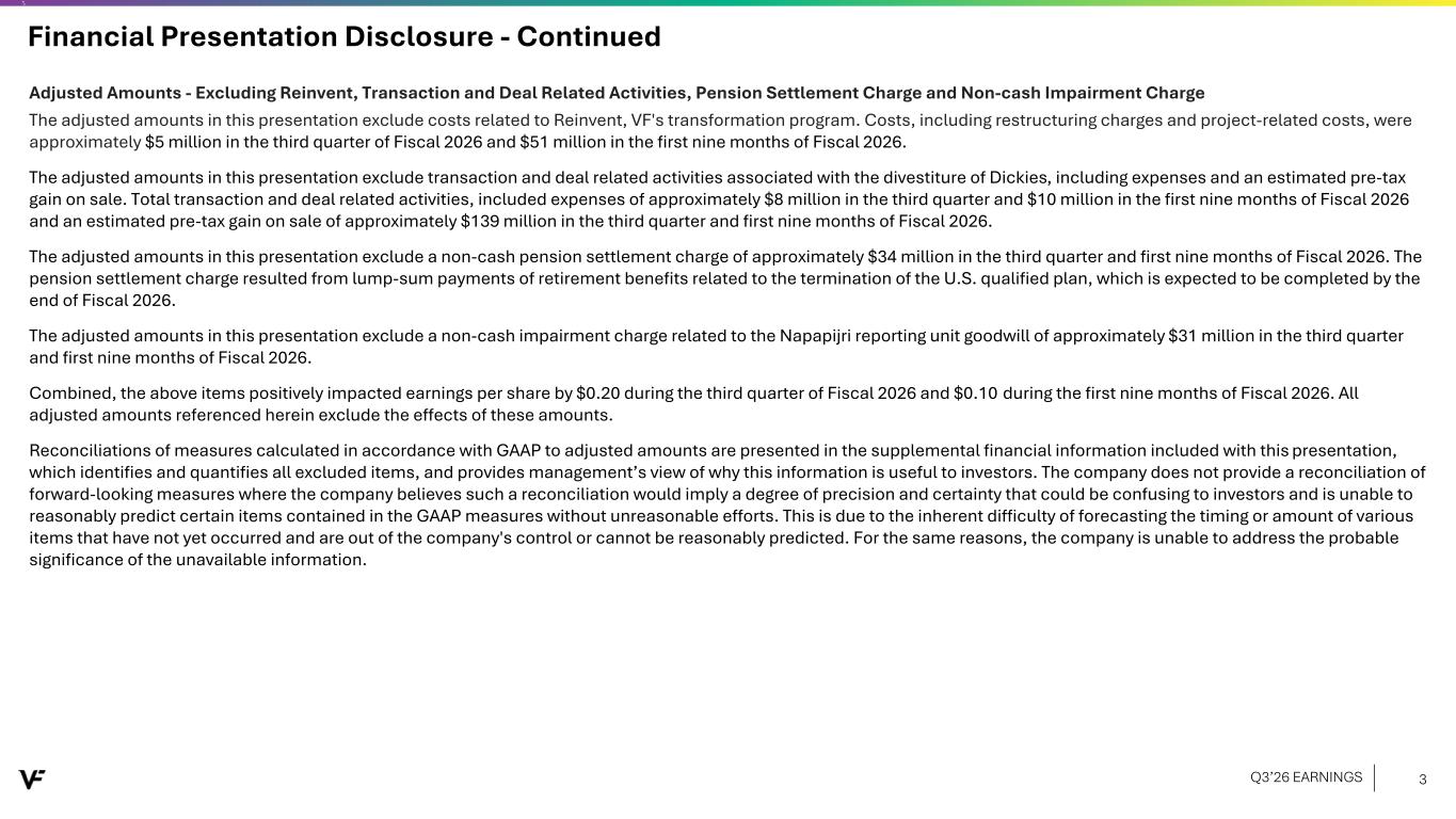 Financial Presentation Disclosure - Continued Adjusted Amounts - Excluding Reinvent, Transaction and Deal Related Activities, Pension Settlement Charge and Non-cash Impairment Charge The adjusted amounts in this presentation exclude costs related to Reinvent, VF's transformation program. Costs, including restructuring charges and project-related costs, were approximately $5 million in the third quarter of Fiscal 2026 and $51 million in the first nine months of Fiscal 2026. The adjusted amounts in this presentation exclude transaction and deal related activities associated with the divestiture of Dickies, including expenses and an estimated pre-tax gain on sale. Total transaction and deal related activities, included expenses of approximately $8 million in the third quarter and $10 million in the first nine months of Fiscal 2026 and an estimated pre-tax gain on sale of approximately $139 million in the third quarter and first nine months of Fiscal 2026. The adjusted amounts in this presentation exclude a non-cash pension settlement charge of approximately $34 million in the third quarter and first nine months of Fiscal 2026. The pension settlement charge resulted from lump-sum payments of retirement benefits related to the termination of the U.S. qualified plan, which is expected to be completed by the end of Fiscal 2026. The adjusted amounts in this presentation exclude a non-cash impairment charge related to the Napapijri reporting unit goodwill of approximately $31 million in the third quarter and first nine months of Fiscal 2026. Combined, the above items positively impacted earnings per share by $0.20 during the third quarter of Fiscal 2026 and $0.10 during the first nine months of Fiscal 2026. All adjusted amounts referenced herein exclude the effects of these amounts. Reconciliations of measures calculated in accordance with GAAP to adjusted amounts are presented in the supplemental financial information included with this presentation, which identifies and quantifies all excluded items, and provides management’s view of why this information is useful to investors. The company does not provide a reconciliation of forward-looking measures where the company believes such a reconciliation would imply a degree of precision and certainty that could be confusing to investors and is unable to reasonably predict certain items contained in the GAAP measures without unreasonable efforts. This is due to the inherent difficulty of forecasting the timing or amount of various items that have not yet occurred and are out of the company's control or cannot be reasonably predicted. For the same reasons, the company is unable to address the probable significance of the unavailable information. Q3’26 EARNINGS 3