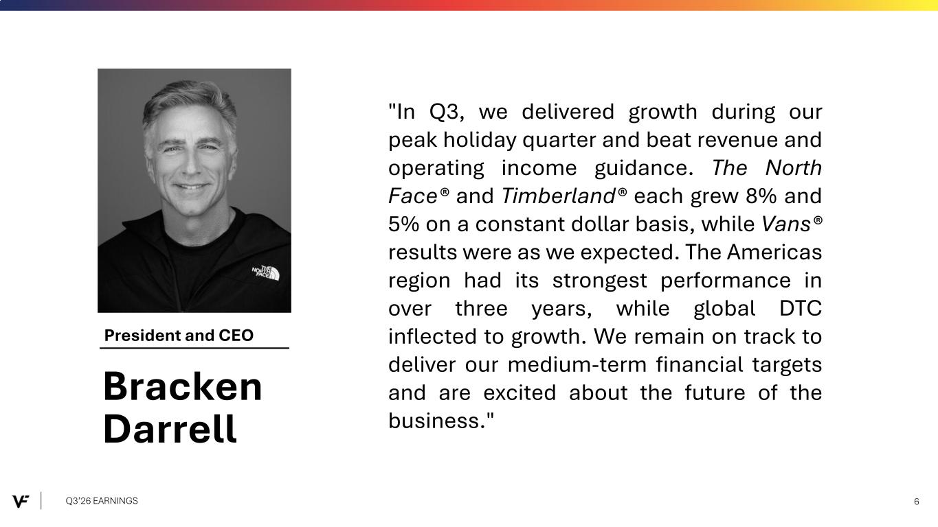 President and CEO "In Q3, we delivered growth during our peak holiday quarter and beat revenue and operating income guidance. The North Face® and Timberland® each grew 8% and 5% on a constant dollar basis, while Vans® results were as we expected. The Americas region had its strongest performance in over three years, while global DTC inflected to growth. We remain on track to deliver our medium-term financial targets and are excited about the future of the business." Q3’26 EARNINGS 6 Bracken Darrell