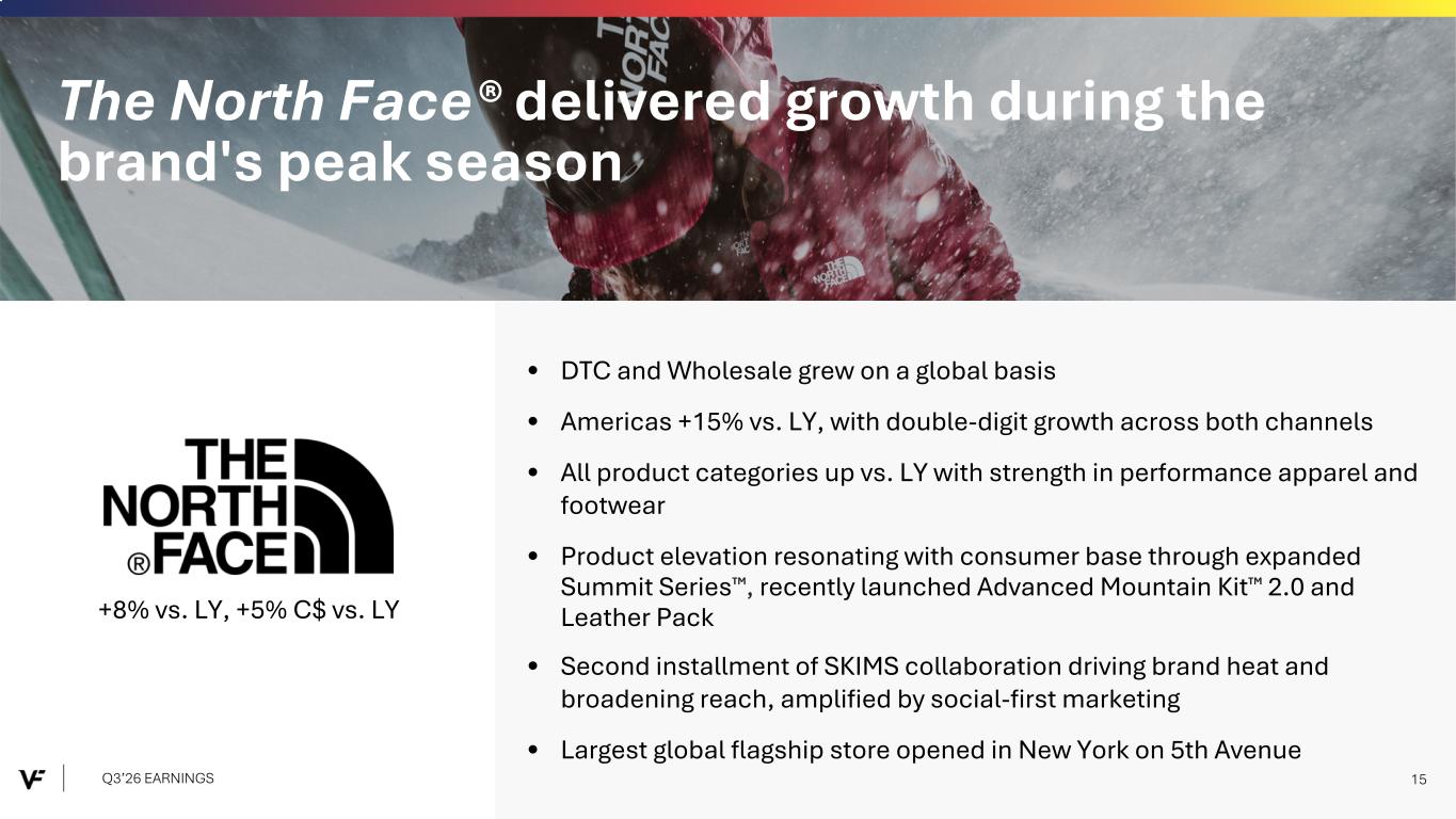 • DTC and Wholesale grew on a global basis • Americas +15% vs. LY, with double-digit growth across both channels • All product categories up vs. LY with strength in performance apparel and footwear • Product elevation resonating with consumer base through expanded Summit Series™, recently launched Advanced Mountain Kit™ 2.0 and Leather Pack • Second installment of SKIMS collaboration driving brand heat and broadening reach, amplified by social-first marketing • Largest global flagship store opened in New York on 5th Avenue +8% vs. LY, +5% C$ vs. LY Q3’26 EARNINGS 15 The North Face® delivered growth during the brand's peak season