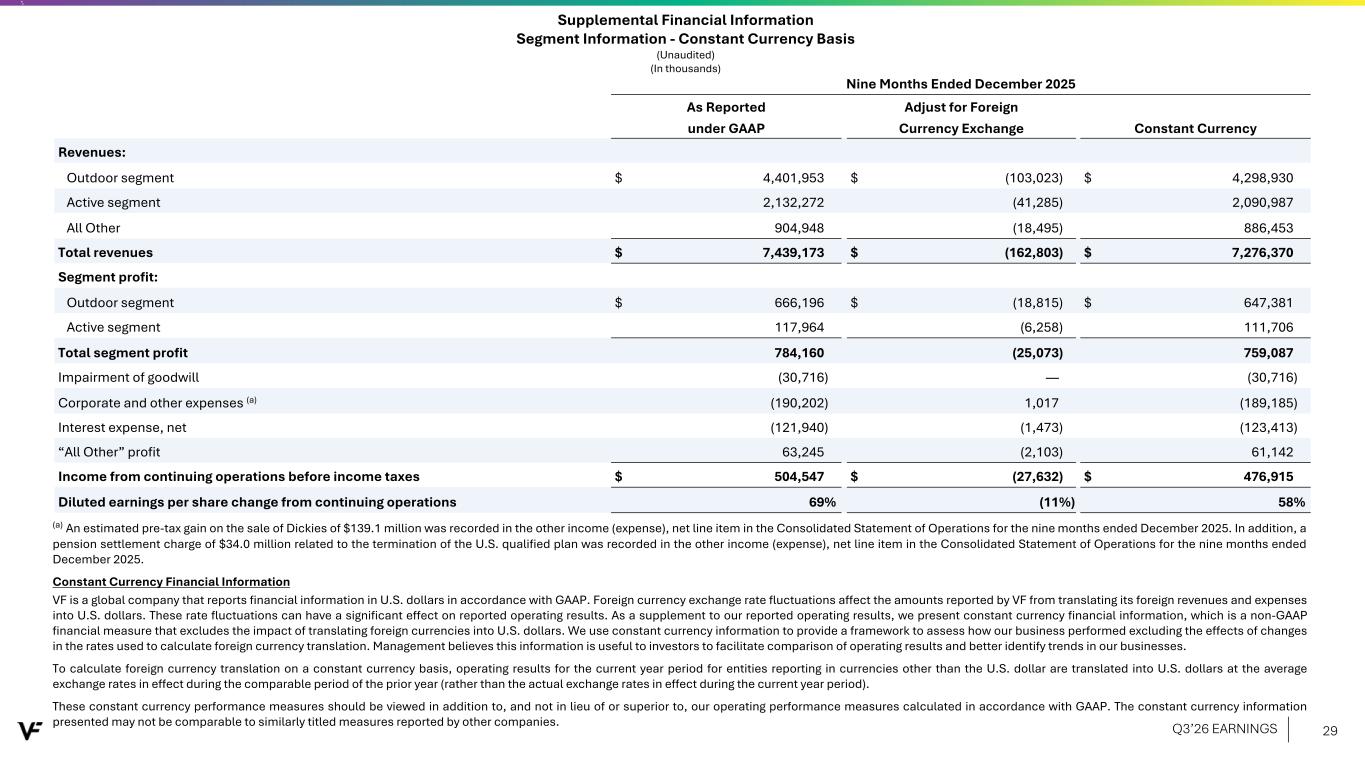 Supplemental Financial Information Segment Information - Constant Currency Basis (Unaudited) (In thousands) Three Months Ended December 2025 As Reported Adjust for Foreign under GAAP Currency Exchange Constant Currency Revenues: Outdoor segment $ 1,926,008 $ (53,668) $ 1,872,340 Active segment 671,835 (17,774) 654,061 All Other 277,958 (6,736) 271,222 Total revenues $ 2,875,801 $ (78,178) $ 2,797,623 Segment profit (loss): Outdoor segment $ 407,726 $ (11,820) $ 395,906 Active segment (4,622) (1,645) (6,267) Total segment profit 403,104 (13,465) 389,639 Impairment of goodwill (30,716) — (30,716) Corporate and other income (expenses) (a) 10,030 397 10,427 Interest expense, net (34,611) (479) (35,090) “All Other” profit 15,052 (141) 14,911 Income from continuing operations before income taxes $ 362,859 $ (13,688) $ 349,171 Diluted earnings per share change from continuing operations 76% (6%) 70% (a) An estimated pre-tax gain on the sale of Dickies of $139.1 million was recorded in the other income (expense), net line item in the Consolidated Statement of Operations for the three months ended December 2025. In addition, a pension settlement charge of $34.0 million related to the termination of the U.S. qualified plan was recorded in the other income (expense), net line item in the Consolidated Statement of Operations for the three months ended December 2025. Constant Currency Financial Information VF is a global company that reports financial information in U.S. dollars in accordance with GAAP. Foreign currency exchange rate fluctuations affect the amounts reported by VF from translating its foreign revenues and expenses into U.S. dollars. These rate fluctuations can have a significant effect on reported operating results. As a supplement to our reported operating results, we present constant currency financial information, which is a non-GAAP financial measure that excludes the impact of translating foreign currencies into U.S. dollars. We use constant currency information to provide a framework to assess how our business performed excluding the effects of changes in the rates used to calculate foreign currency translation. Management believes this information is useful to investors to facilitate comparison of operating results and better identify trends in our businesses. To calculate foreign currency translation on a constant currency basis, operating results for the current year period for entities reporting in currencies other than the U.S. dollar are translated into U.S. dollars at the average exchange rates in effect during the comparable period of the prior year (rather than the actual exchange rates in effect during the current year period). These constant currency performance measures should be viewed in addition to, and not in lieu of or superior to, our operating performance measures calculated in accordance with GAAP. The constant currency information presented may not be comparable to similarly titled measures reported by other companies. Q3’26 EARNINGS 28