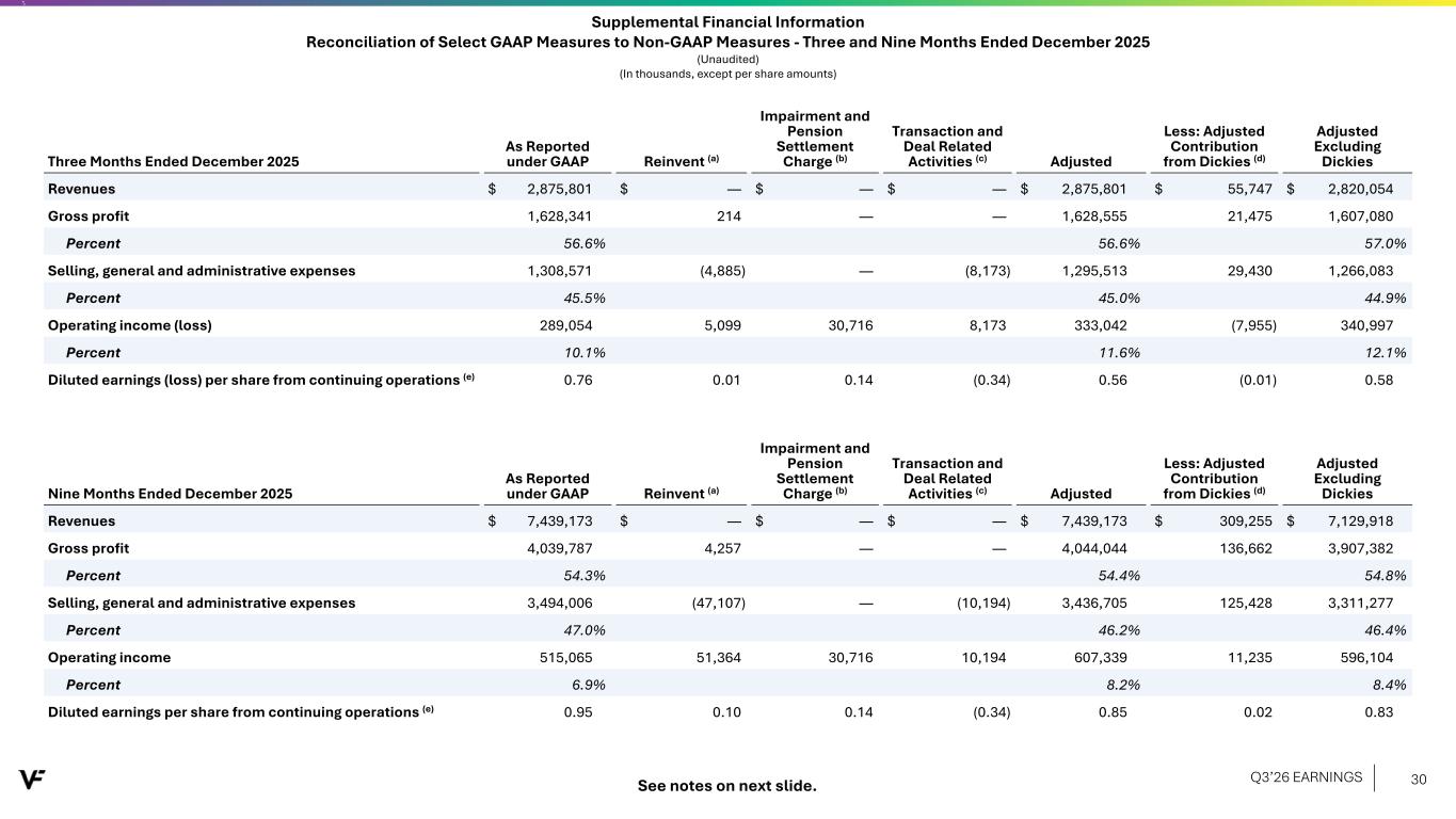 Supplemental Financial Information Reconciliation of Select GAAP Measures to Non-GAAP Measures - Three and Nine Months Ended December 2025 (Unaudited) (In thousands, except per share amounts) Three Months Ended December 2025 As Reported under GAAP Reinvent (a) Impairment and Pension Settlement Charge (b) Transaction and Deal Related Activities (c) Adjusted Less: Adjusted Contribution from Dickies (d) Adjusted Excluding Dickies Revenues $ 2,875,801 $ — $ — $ — $ 2,875,801 $ 55,747 $ 2,820,054 Gross profit 1,628,341 214 — — 1,628,555 21,475 1,607,080 Percent 56.6% 56.6% 57.0% Selling, general and administrative expenses 1,308,571 (4,885) — (8,173) 1,295,513 29,430 1,266,083 Percent 45.5% 45.0% 44.9% Operating income (loss) 289,054 5,099 30,716 8,173 333,042 (7,955) 340,997 Percent 10.1% 11.6% 12.1% Diluted earnings (loss) per share from continuing operations (e) 0.76 0.01 0.14 (0.34) 0.56 (0.01) 0.58 Nine Months Ended December 2025 As Reported under GAAP Reinvent (a) Impairment and Pension Settlement Charge (b) Transaction and Deal Related Activities (c) Adjusted Less: Adjusted Contribution from Dickies (d) Adjusted Excluding Dickies Revenues $ 7,439,173 $ — $ — $ — $ 7,439,173 $ 309,255 $ 7,129,918 Gross profit 4,039,787 4,257 — — 4,044,044 136,662 3,907,382 Percent 54.3% 54.4% 54.8% Selling, general and administrative expenses 3,494,006 (47,107) — (10,194) 3,436,705 125,428 3,311,277 Percent 47.0% 46.2% 46.4% Operating income 515,065 51,364 30,716 10,194 607,339 11,235 596,104 Percent 6.9% 8.2% 8.4% Diluted earnings per share from continuing operations (e) 0.95 0.10 0.14 (0.34) 0.85 0.02 0.83 Q3’26 EARNINGS 30See notes on next slide.