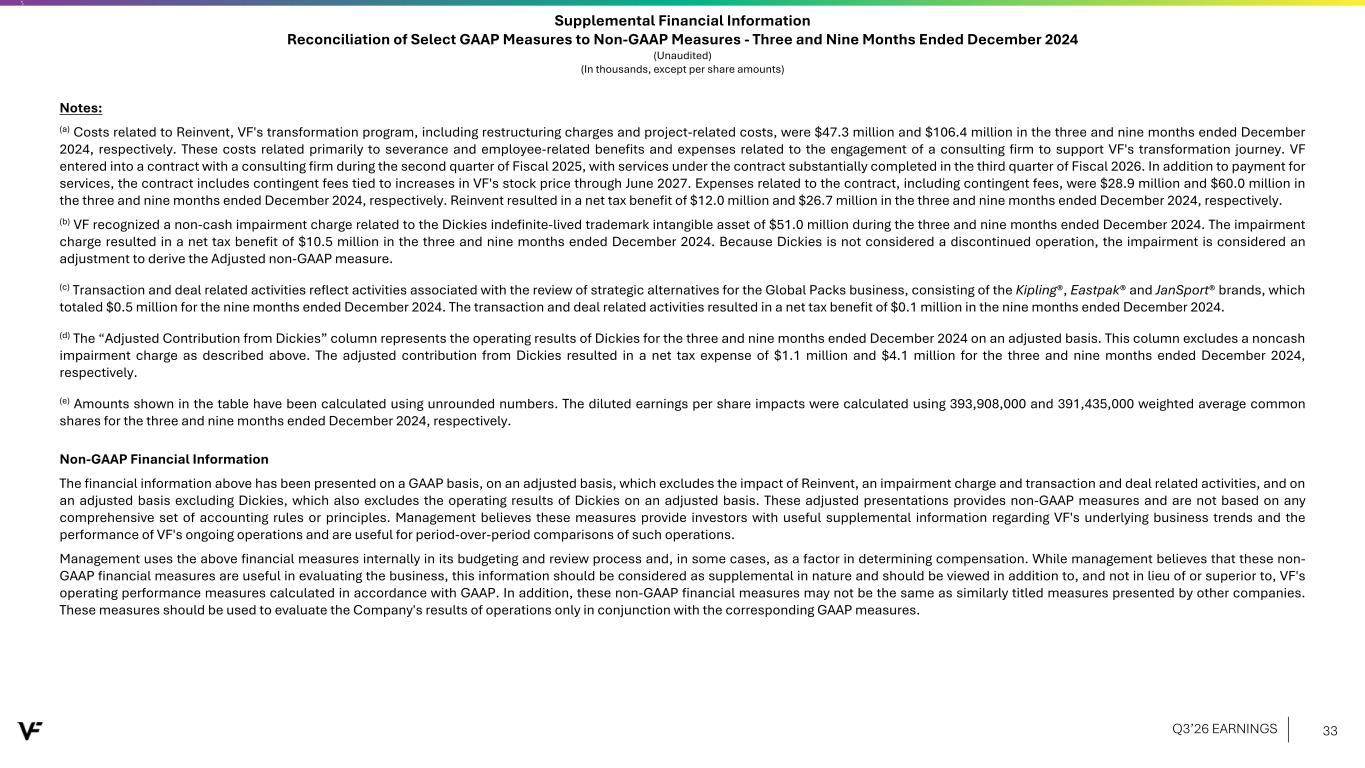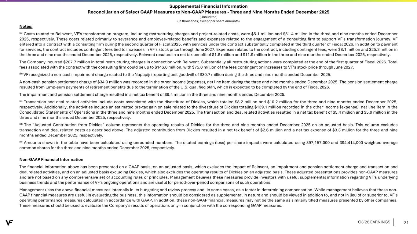 Supplemental Financial Information Reconciliation of Select GAAP Measures to Non-GAAP Measures - Three and Nine Months Ended December 2025 (Unaudited) (In thousands, except per share amounts) Notes: (a) Costs related to Reinvent, VF's transformation program, including restructuring charges and project-related costs, were $5.1 million and $51.4 million in the three and nine months ended December 2025, respectively. These costs related primarily to severance and employee-related benefits and expenses related to the engagement of a consulting firm to support VF's transformation journey. VF entered into a contract with a consulting firm during the second quarter of Fiscal 2025, with services under the contract substantially completed in the third quarter of Fiscal 2026. In addition to payment for services, the contract includes contingent fees tied to increases in VF's stock price through June 2027. Expenses related to the contract, including contingent fees, were $8.1 million and $25.3 million in the three and nine months ended December 2025, respectively. Reinvent resulted in a net tax benefit of $1.6 million and $11.9 million in the three and nine months ended December 2025, respectively. The Company incurred $207.7 million in total restructuring charges in connection with Reinvent. Substantially all restructuring actions were completed at the end of the first quarter of Fiscal 2026. Total fees associated with the contract with the consulting firm could be up to $146.0 million, with $75.0 million of the fees contingent on increases to VF’s stock price through June 2027. (b) VF recognized a non-cash impairment charge related to the Napapijri reporting unit goodwill of $30.7 million during the three and nine months ended December 2025. A non-cash pension settlement charge of $34.0 million was recorded in the other income (expense), net line item during the three and nine months ended December 2025. The pension settlement charge resulted from lump-sum payments of retirement benefits due to the termination of the U.S. qualified plan, which is expected to be completed by the end of Fiscal 2026. The impairment and pension settlement charge resulted in a net tax benefit of $9.4 million in the three and nine months ended December 2025. (c) Transaction and deal related activities include costs associated with the divestiture of Dickies, which totaled $8.2 million and $10.2 million for the three and nine months ended December 2025, respectively. Additionally, the activities include an estimated pre-tax gain on sale related to the divestiture of Dickies totaling $139.1 million recorded in the other income (expense), net line item in the Consolidated Statements of Operations in the three and nine months ended December 2025. The transaction and deal related activities resulted in a net tax benefit of $5.4 million and $5.9 million in the three and nine months ended December 2025, respectively. (d) The “Adjusted Contribution from Dickies” column represents the operating results of Dickies for the three and nine months ended December 2025 on an adjusted basis. This column excludes transaction and deal related costs as described above. The adjusted contribution from Dickies resulted in a net tax benefit of $2.6 million and a net tax expense of $3.3 million for the three and nine months ended December 2025, respectively. (e) Amounts shown in the table have been calculated using unrounded numbers. The diluted earnings (loss) per share impacts were calculated using 397,157,000 and 394,414,000 weighted average common shares for the three and nine months ended December 2025, respectively. Non-GAAP Financial Information The financial information above has been presented on a GAAP basis, on an adjusted basis, which excludes the impact of Reinvent, an impairment and pension settlement charge and transaction and deal related activities, and on an adjusted basis excluding Dickies, which also excludes the operating results of Dickies on an adjusted basis. These adjusted presentations provides non-GAAP measures and are not based on any comprehensive set of accounting rules or principles. Management believes these measures provide investors with useful supplemental information regarding VF's underlying business trends and the performance of VF's ongoing operations and are useful for period-over-period comparisons of such operations. Management uses the above financial measures internally in its budgeting and review process and, in some cases, as a factor in determining compensation. While management believes that these non- GAAP financial measures are useful in evaluating the business, this information should be considered as supplemental in nature and should be viewed in addition to, and not in lieu of or superior to, VF's operating performance measures calculated in accordance with GAAP. In addition, these non-GAAP financial measures may not be the same as similarly titled measures presented by other companies. These measures should be used to evaluate the Company's results of operations only in conjunction with the corresponding GAAP measures. Q3’26 EARNINGS 31