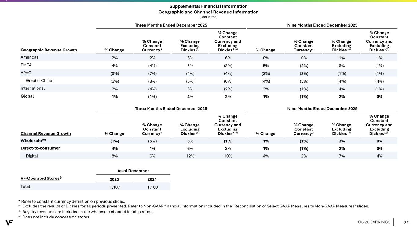 Supplemental Financial Information Geographic and Channel Revenue Information (Unaudited) Three Months Ended December 2025 Nine Months Ended December 2025 Geographic Revenue Growth % Change % Change Constant Currency* % Change Excluding Dickies (a) % Change Constant Currency and Excluding Dickies*(a) % Change % Change Constant Currency* % Change Excluding Dickies (a) % Change Constant Currency and Excluding Dickies*(a) Americas 2% 2% 6% 6% 0% 0% 1% 1% EMEA 4% (4%) 5% (3%) 5% (2%) 6% (1%) APAC (6%) (7%) (4%) (4%) (2%) (2%) (1%) (1%) Greater China (6%) (8%) (5%) (6%) (4%) (5%) (4%) (4%) International 2% (4%) 3% (2%) 3% (1%) 4% (1%) Global 1% (1%) 4% 2% 1% (1%) 2% 0% Three Months Ended December 2025 Nine Months Ended December 2025 Channel Revenue Growth % Change % Change Constant Currency* % Change Excluding Dickies (a) % Change Constant Currency and Excluding Dickies*(a) % Change % Change Constant Currency* % Change Excluding Dickies (a) % Change Constant Currency and Excluding Dickies*(a) Wholesale (b) (1%) (5%) 3% (1%) 1% (1%) 3% 0% Direct-to-consumer 4% 1% 6% 3% 1% (1%) 2% 0% Digital 8% 6% 12% 10% 4% 2% 7% 4% As of December VF-Operated Stores (c) 2025 2024 Total 1,107 1,160 * Refer to constant currency definition on previous slides. (a) Excludes the results of Dickies for all periods presented. Refer to Non-GAAP financial information included in the "Reconciliation of Select GAAP Measures to Non-GAAP Measures" slides. (b) Royalty revenues are included in the wholesale channel for all periods. (c) Does not include concession stores. Q3’26 EARNINGS 35