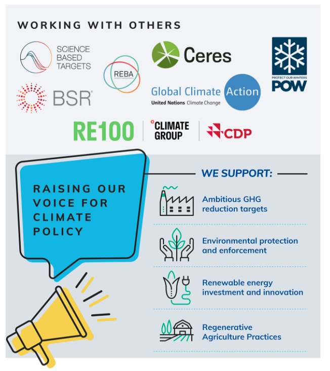 VF is calling for bold policy action across the world to mitigate the impacts of climate change. We regularly advocate for increased government action to enact and expand policies, including supporting legislation for ambitious GHG reduction targets, environmental protection and enforcement, recycling infrastructure improvements, renewable energy investment and support for regenerative agriculture practices.